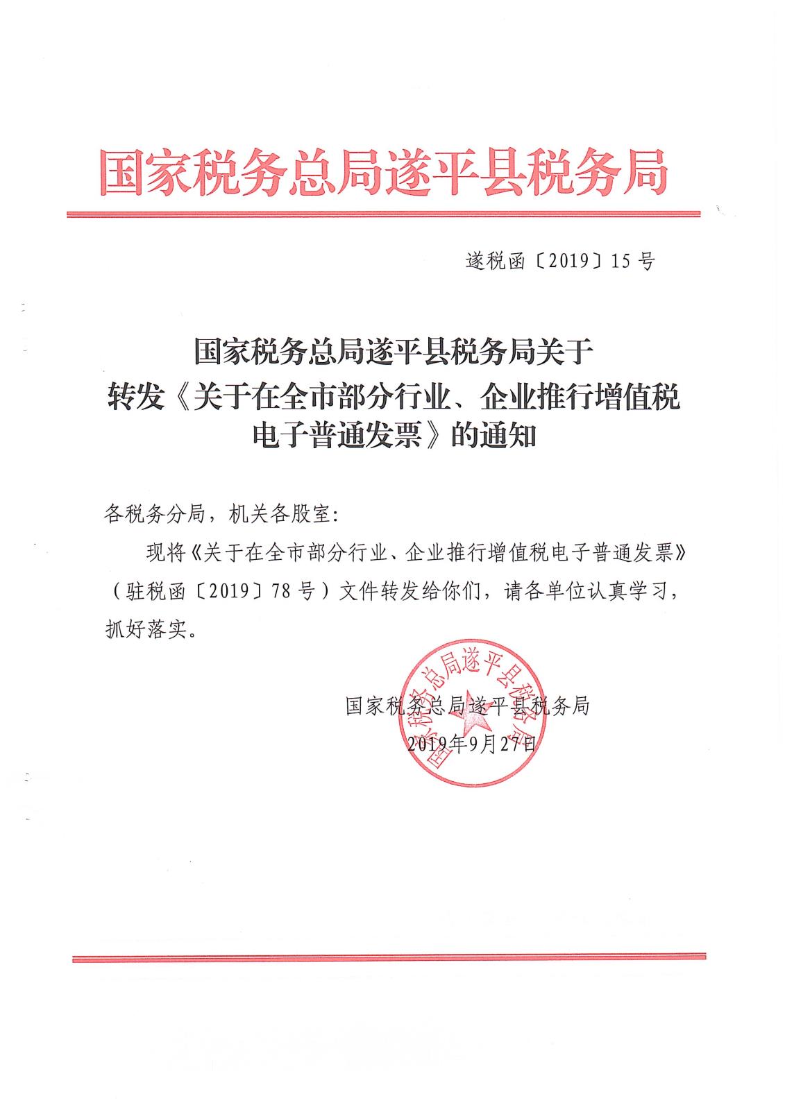 国家税务总局遂平县税务局关于转发《关于在全市部分行业、企业推行增值税电子普通发票》的通知
