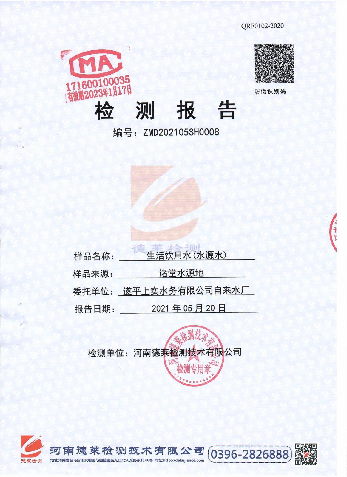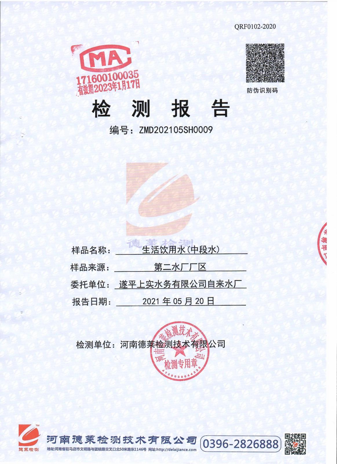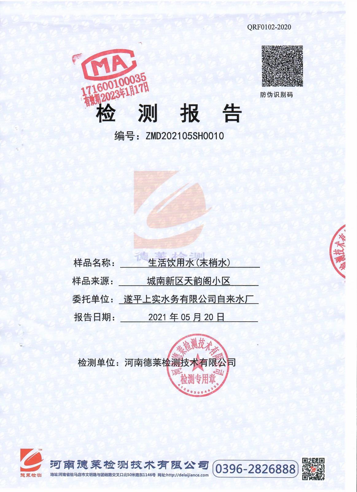 遂平上实水务有限公司南区水厂5月份水质检测报告