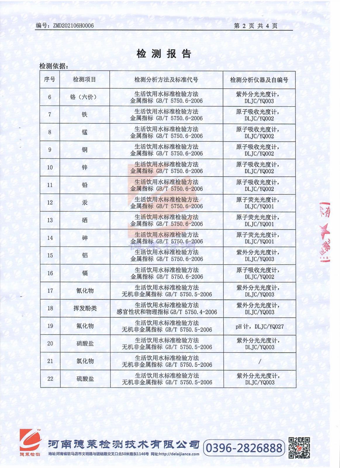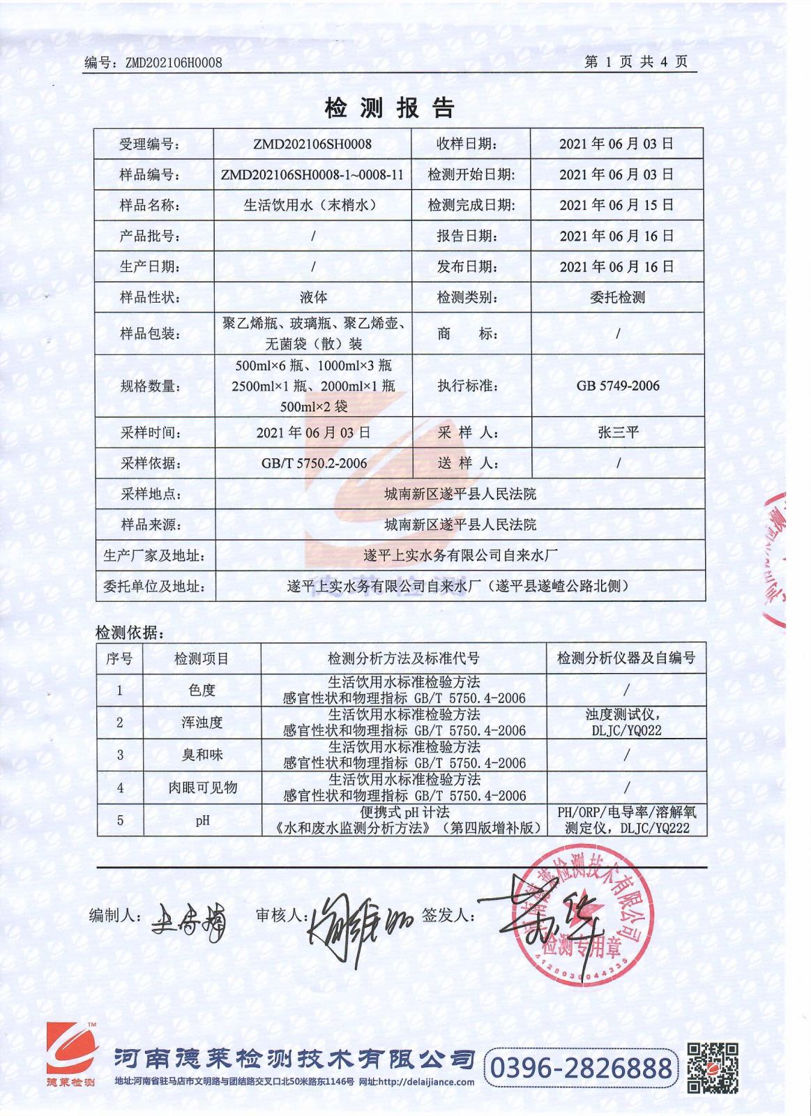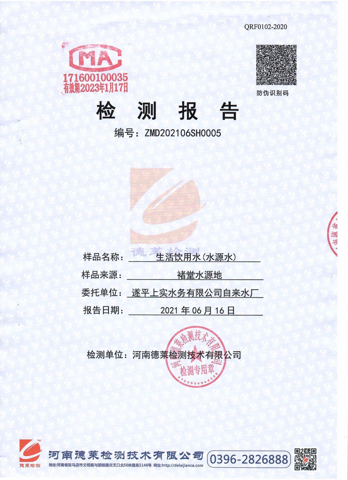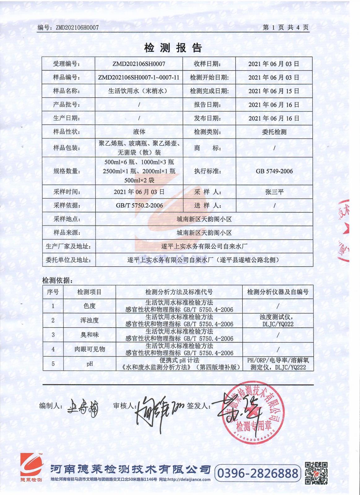 遂平上实水务有限公司第二水厂6月份水质检测报告