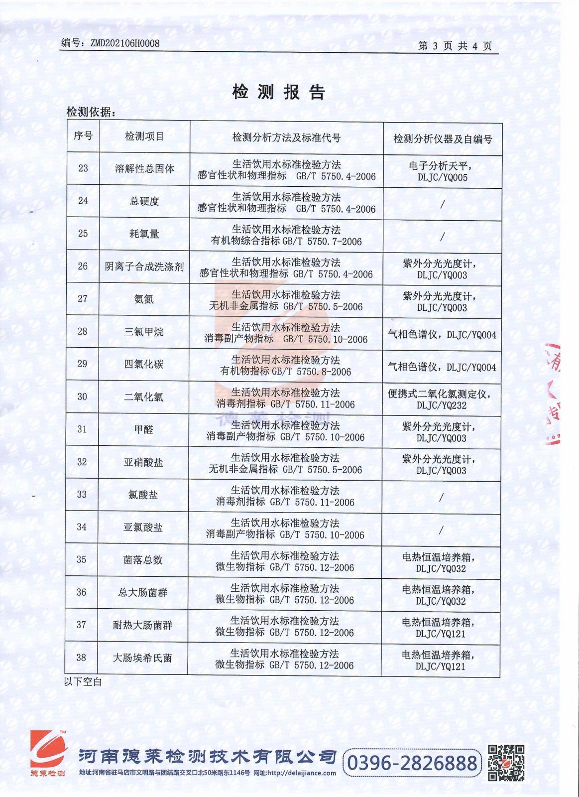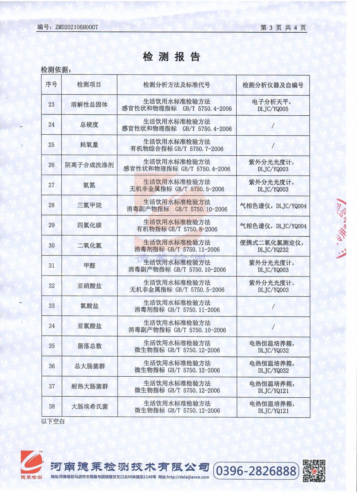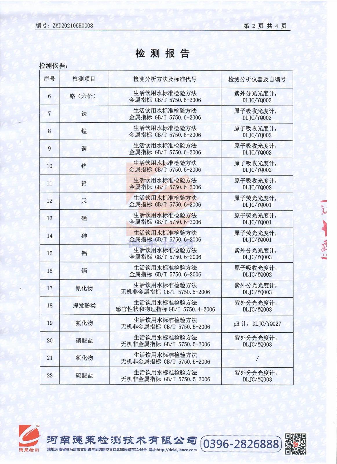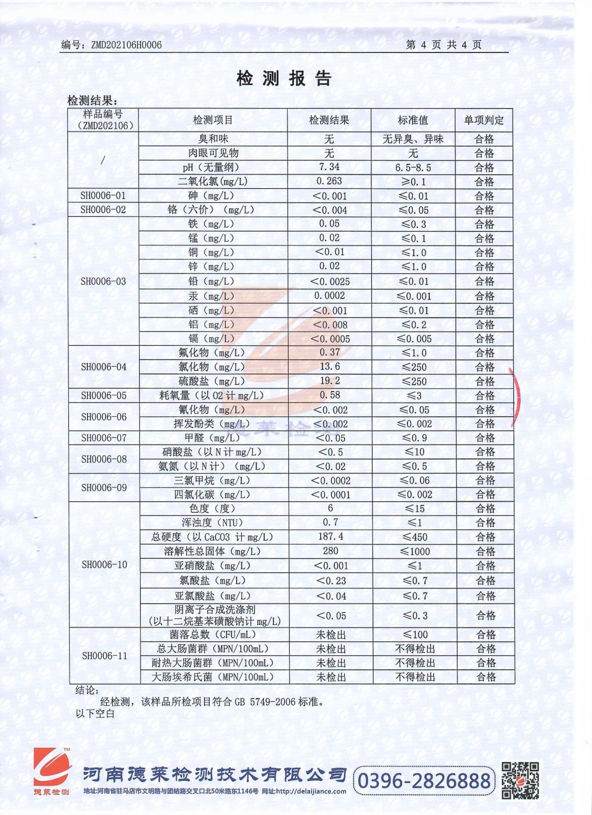 遂平上实水务有限公司第二水厂6月份水质检测报告
