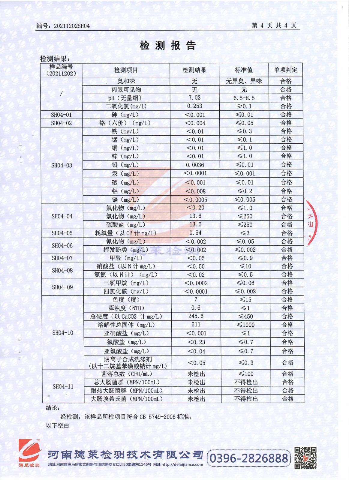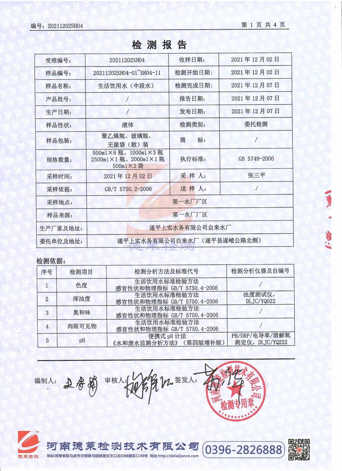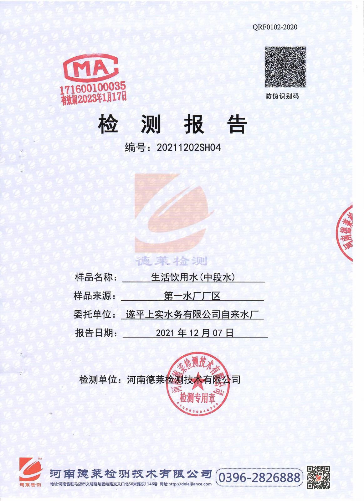 遂平上实水务有限公司第一水厂12月份水质检测报告