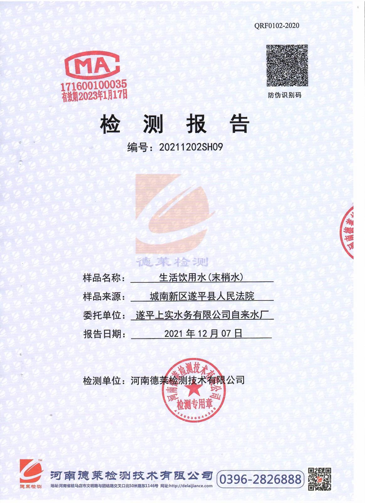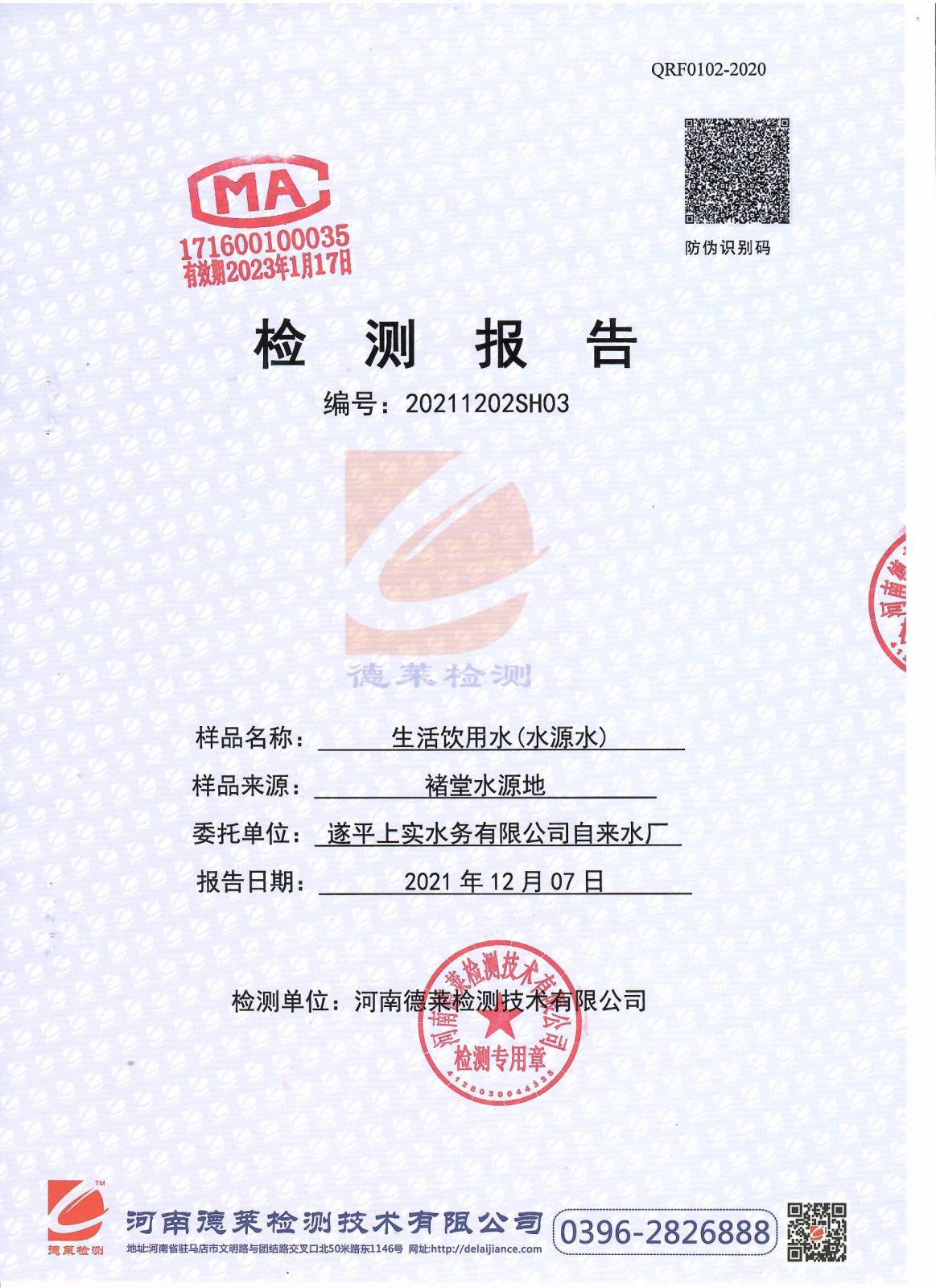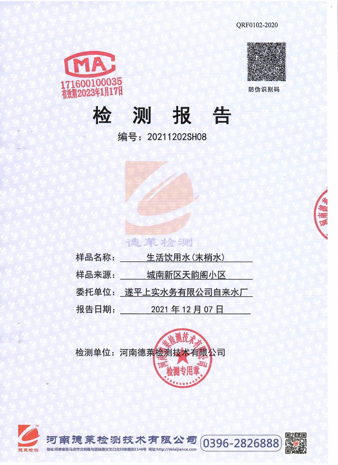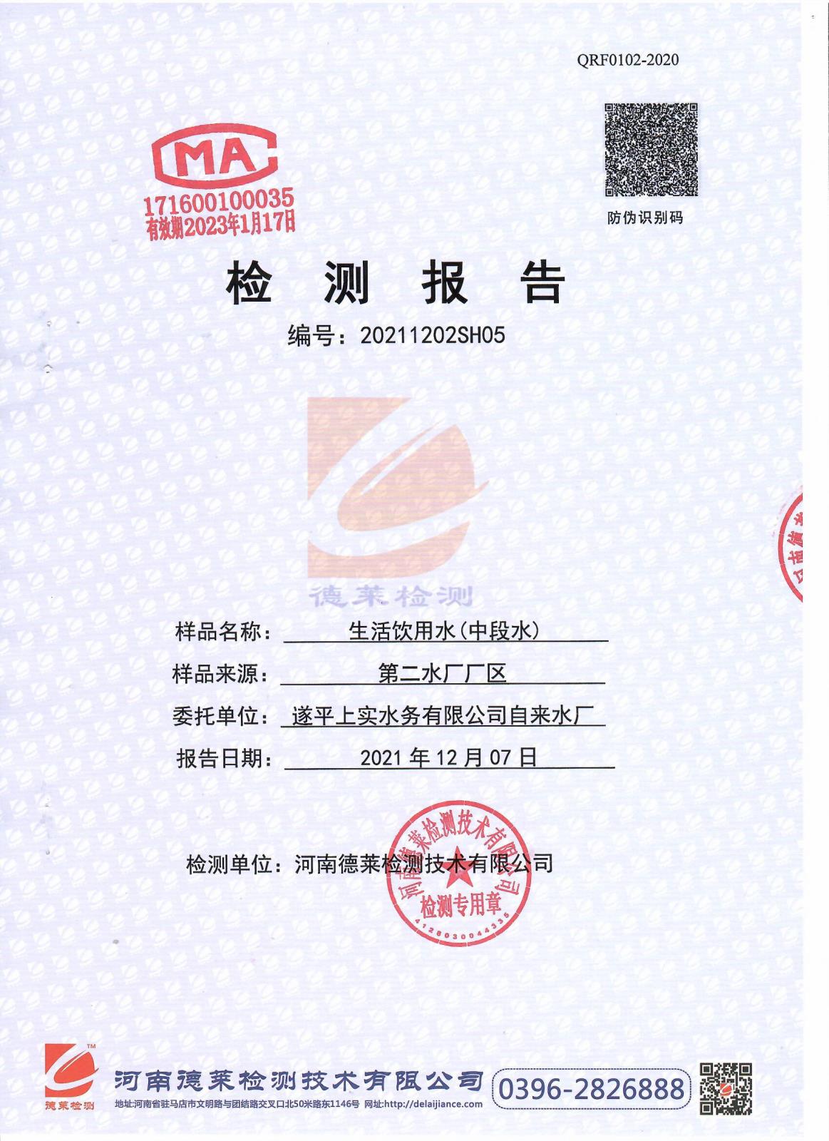遂平上实水务有限公司第二水厂12月份水质检测报告
