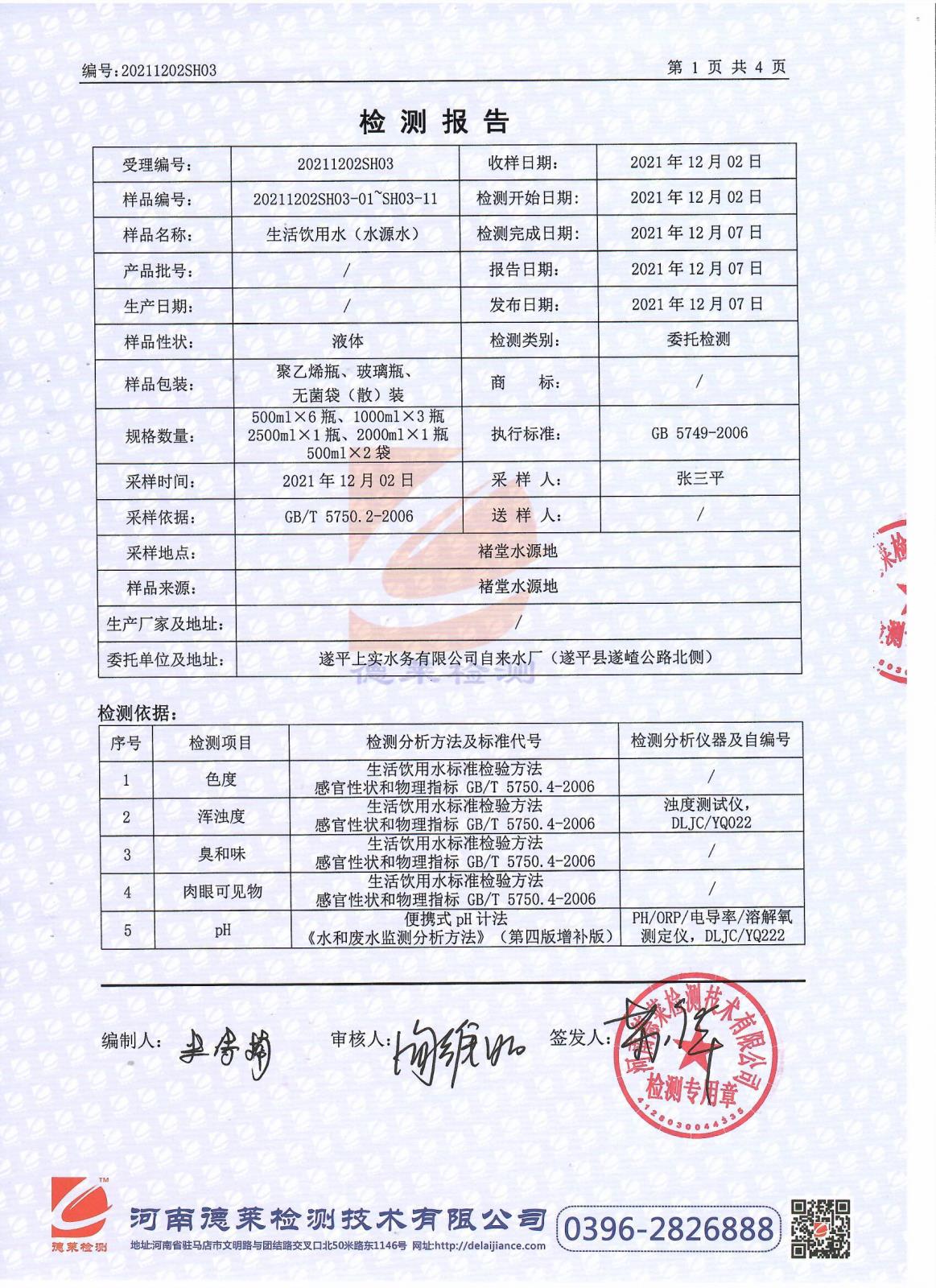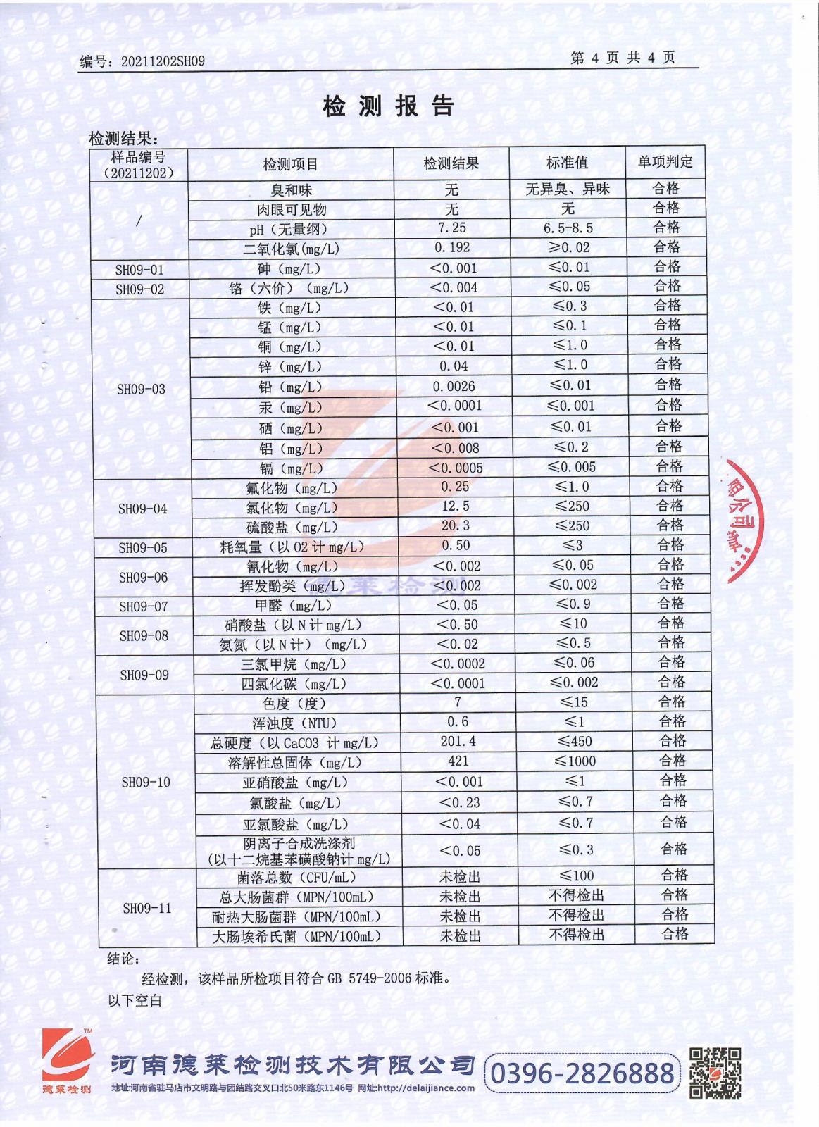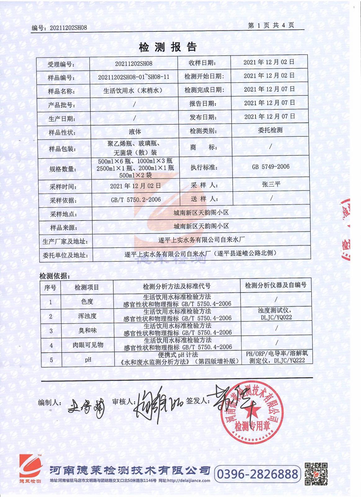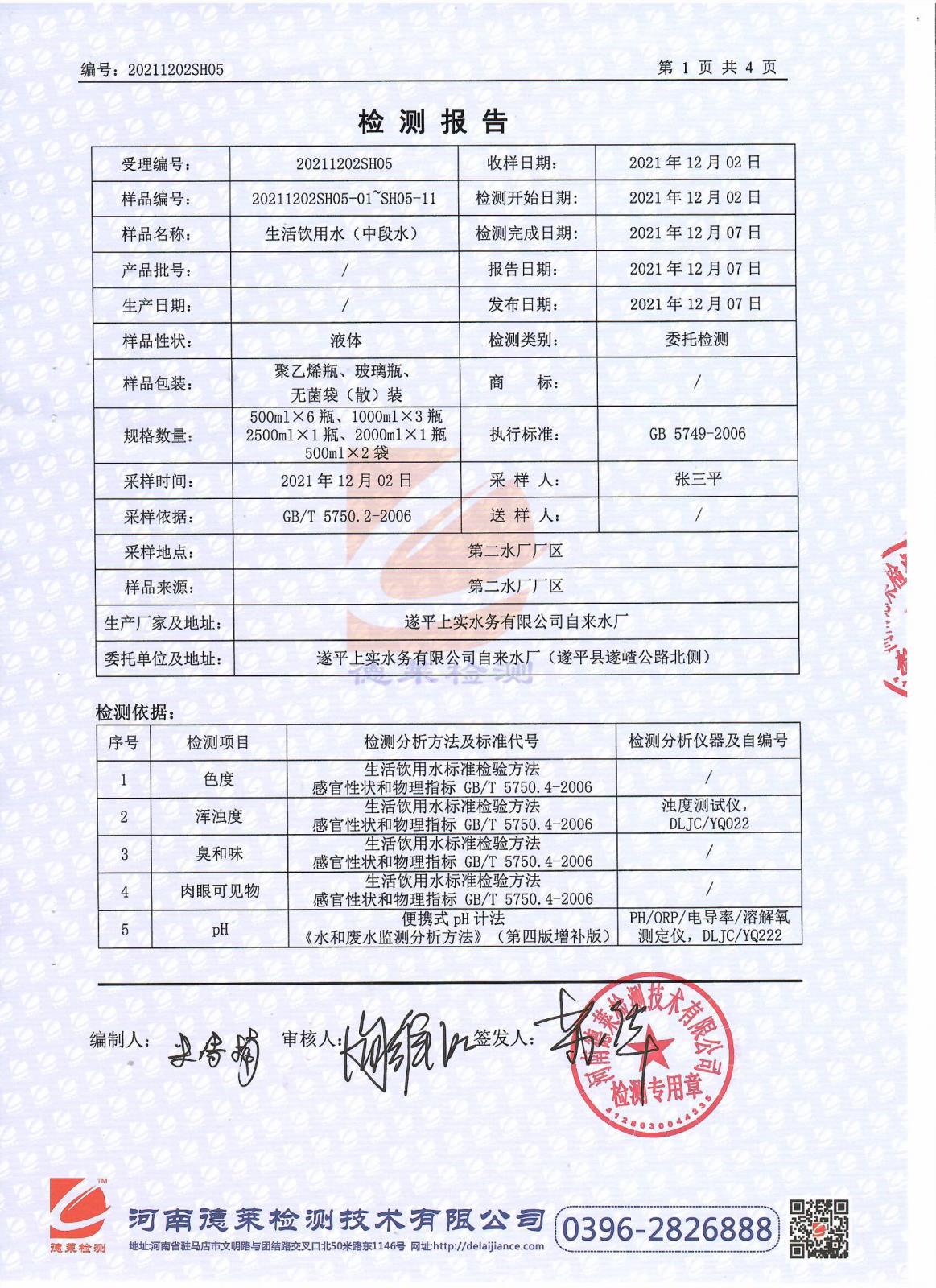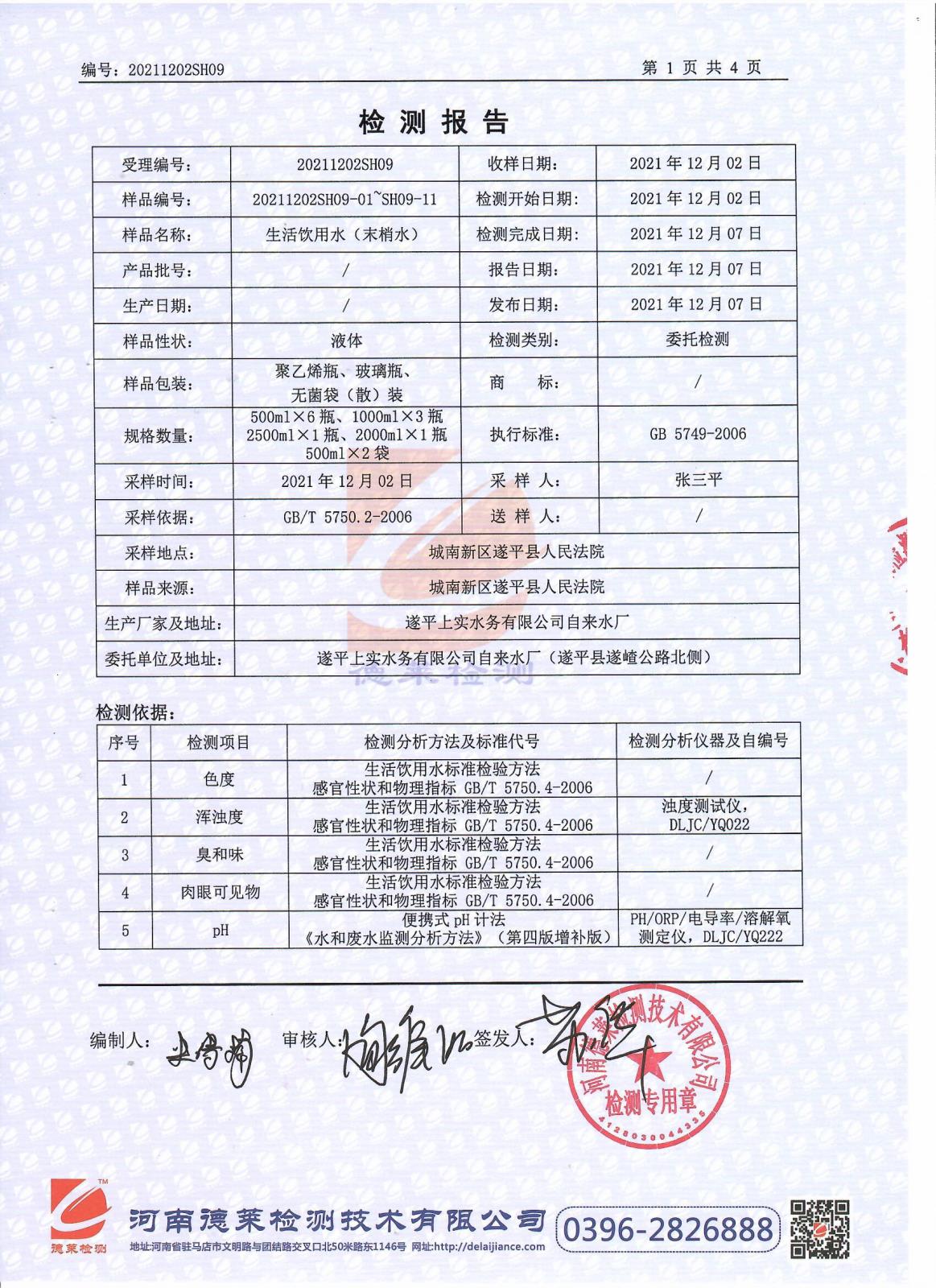 遂平上实水务有限公司第二水厂12月份水质检测报告