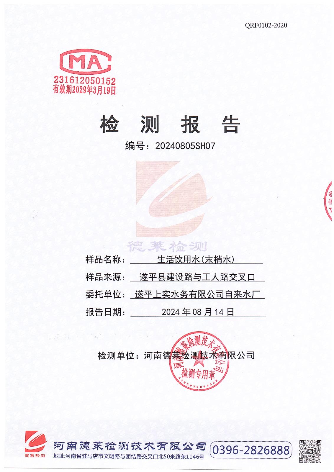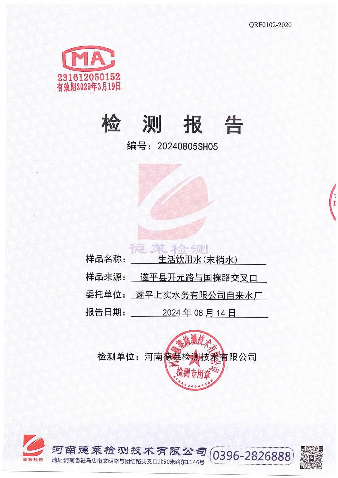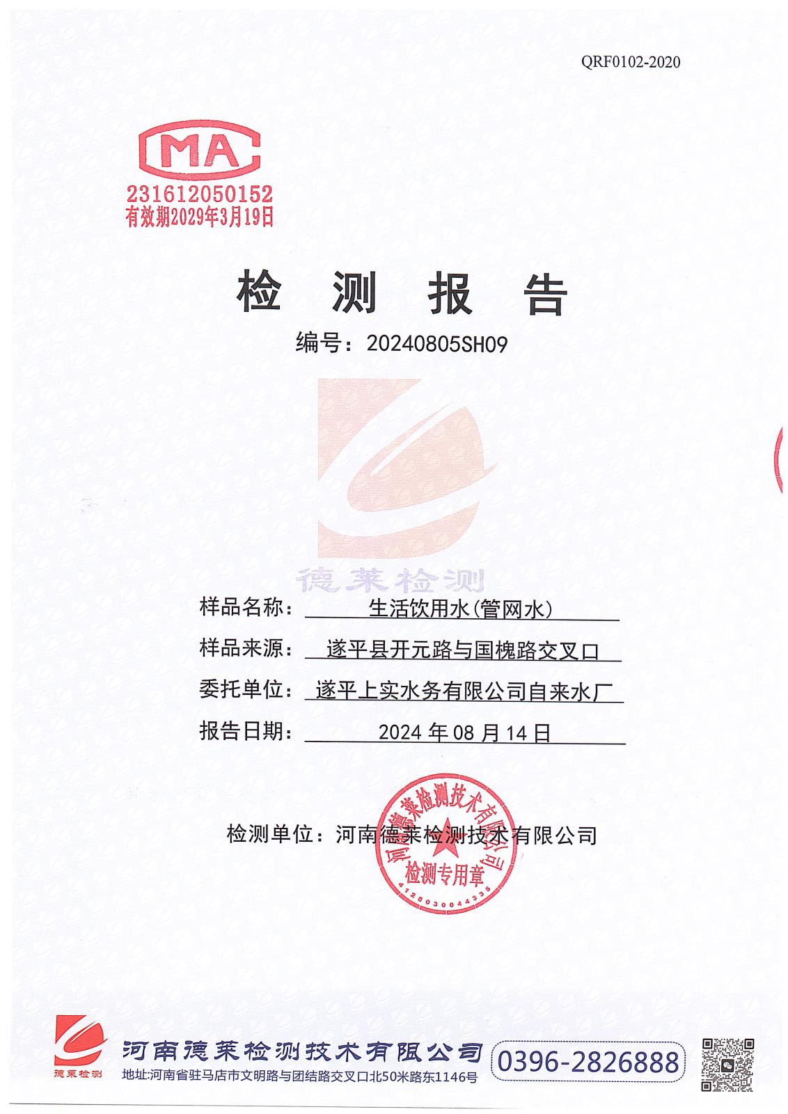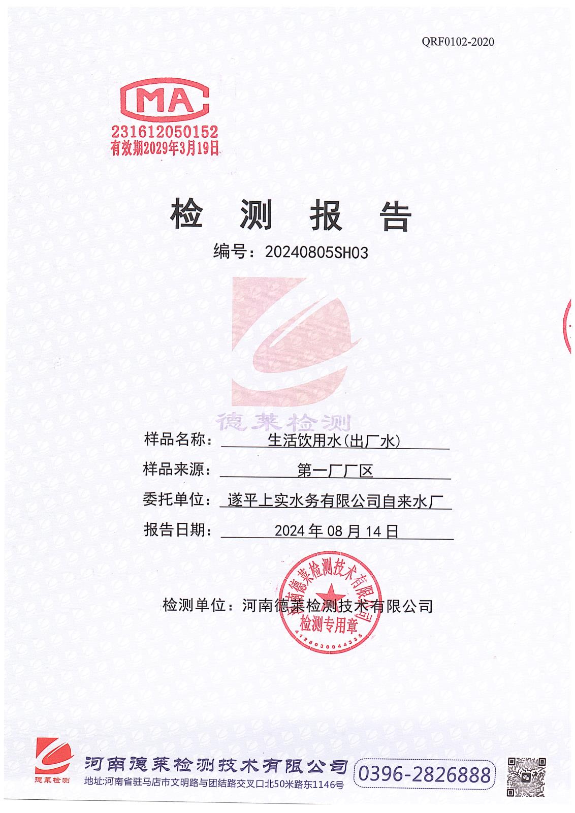 遂平上实水务有限公司2024年一水厂8月份水质检测报告