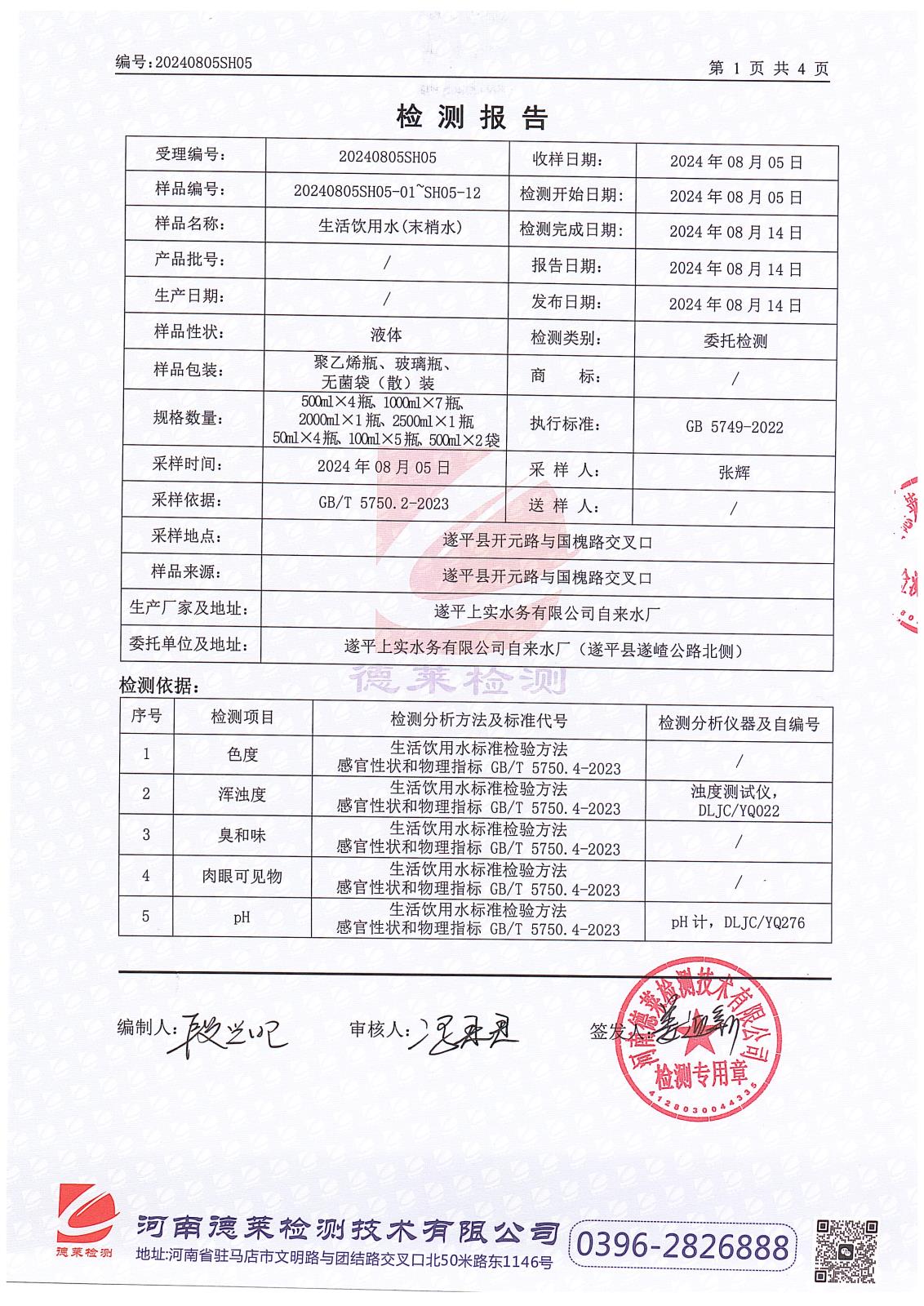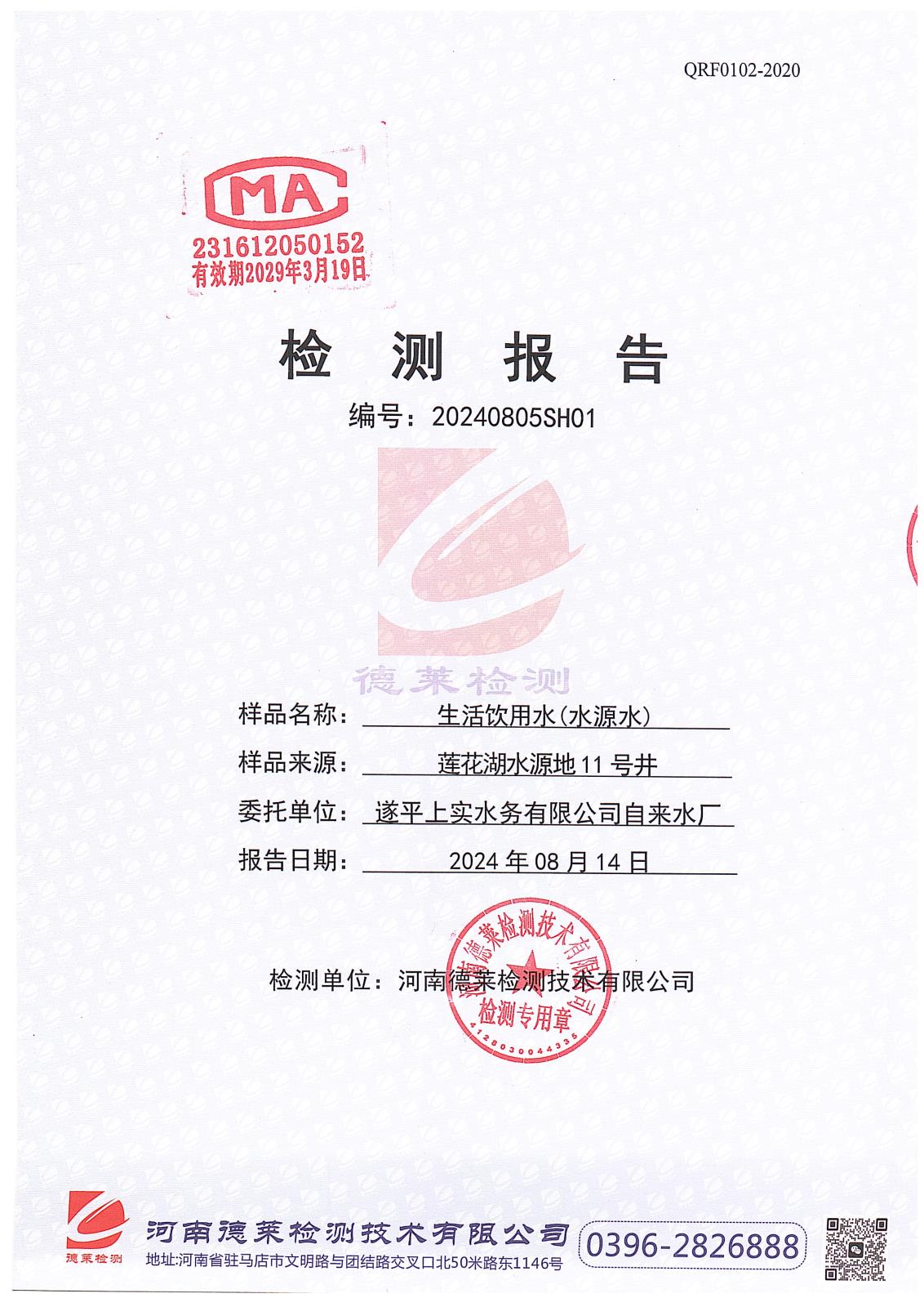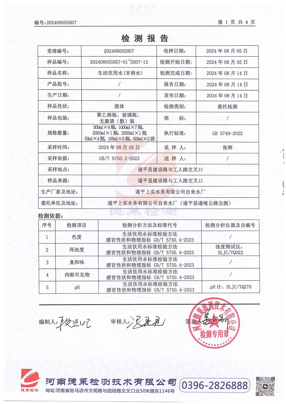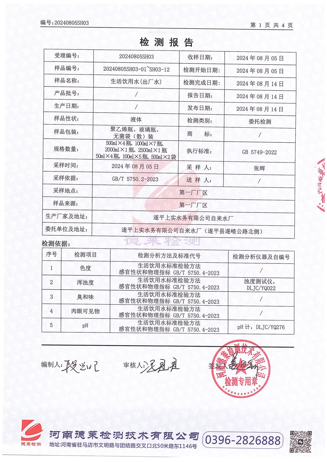 遂平上实水务有限公司2024年一水厂8月份水质检测报告