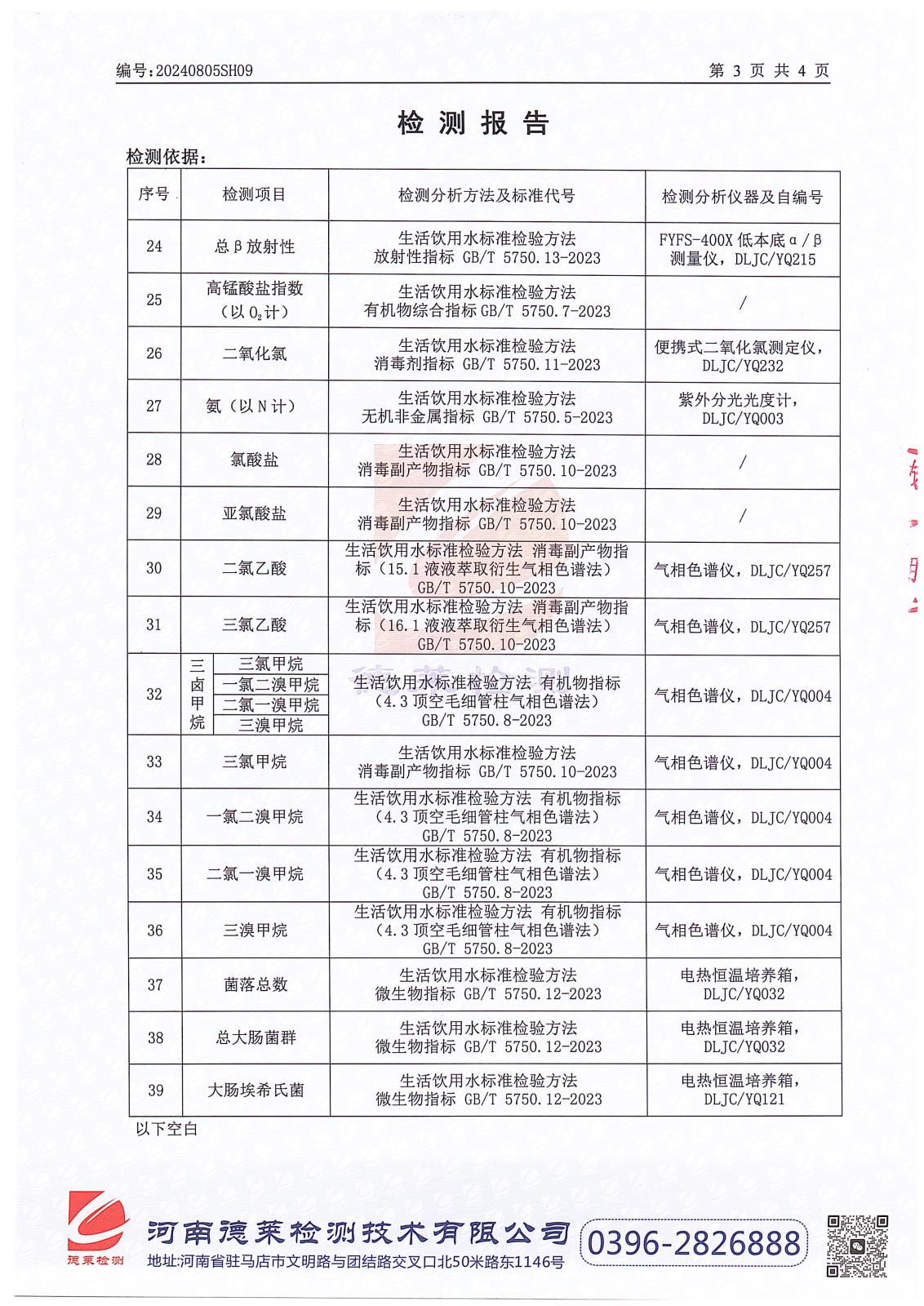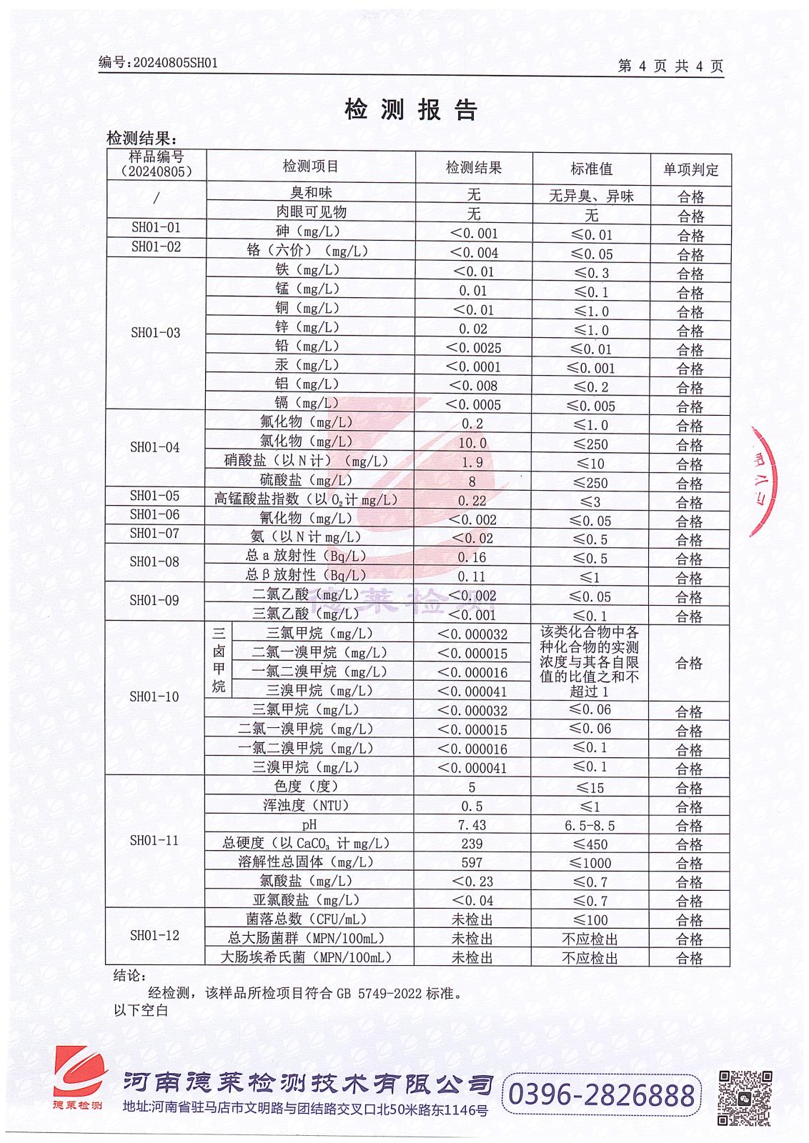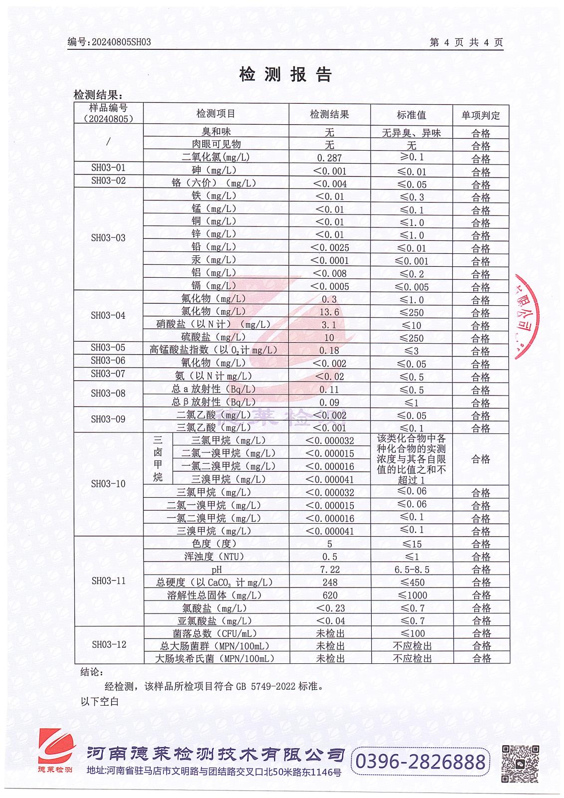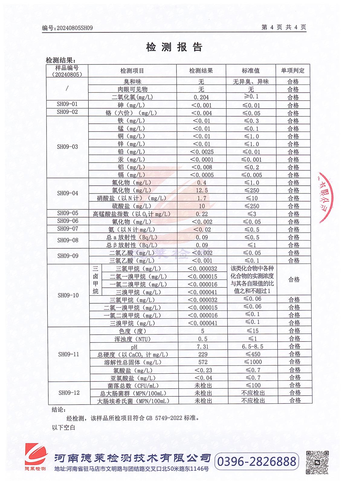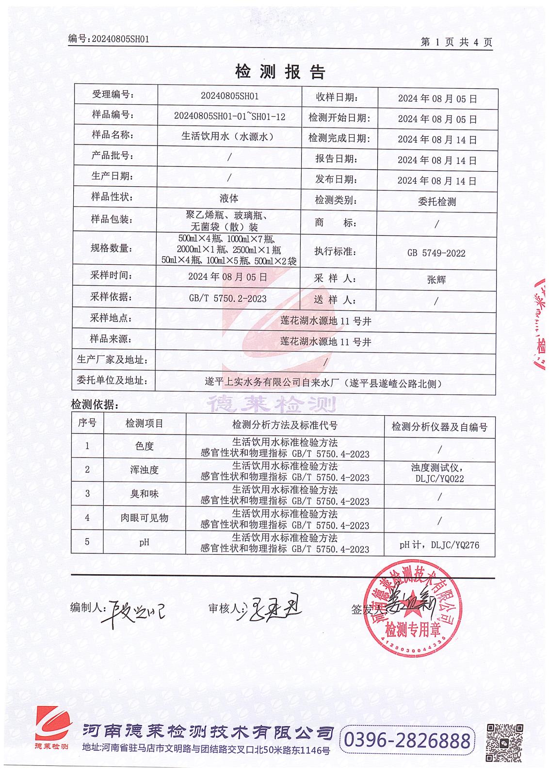 遂平上实水务有限公司2024年一水厂8月份水质检测报告