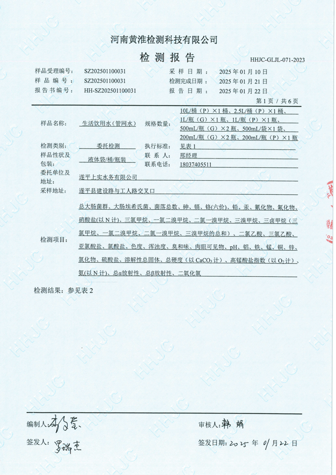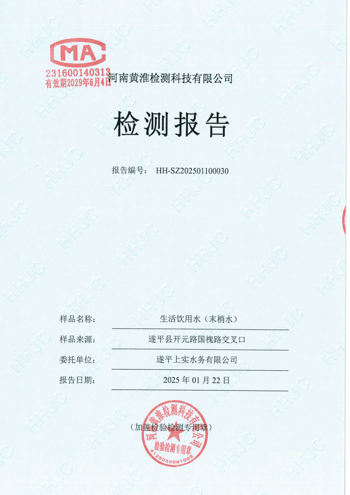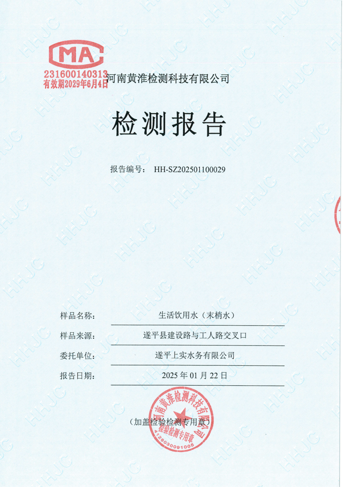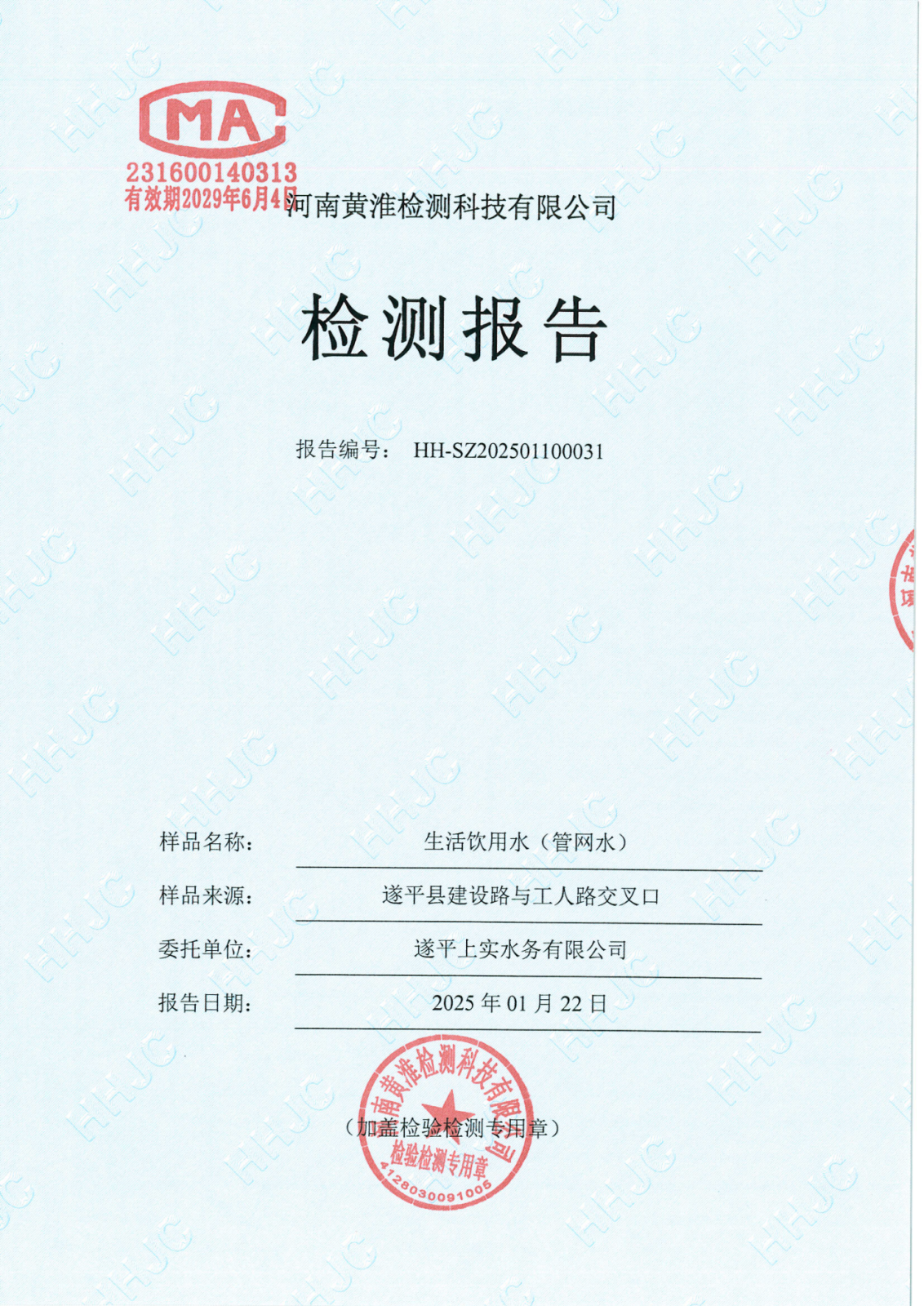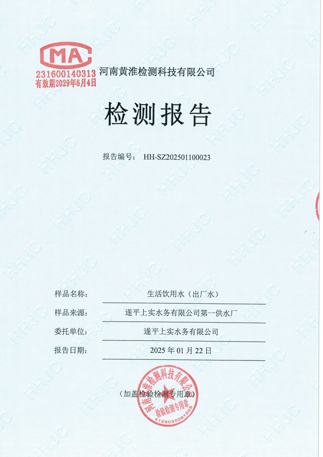 遂平上实水务有限公司2025年一水厂1月份水质检测报告