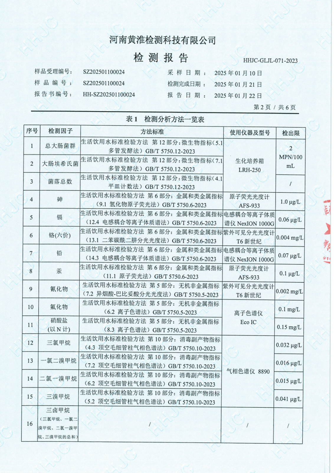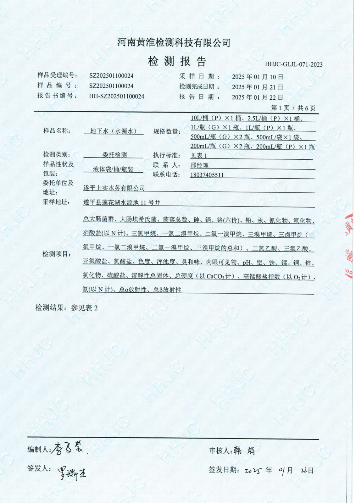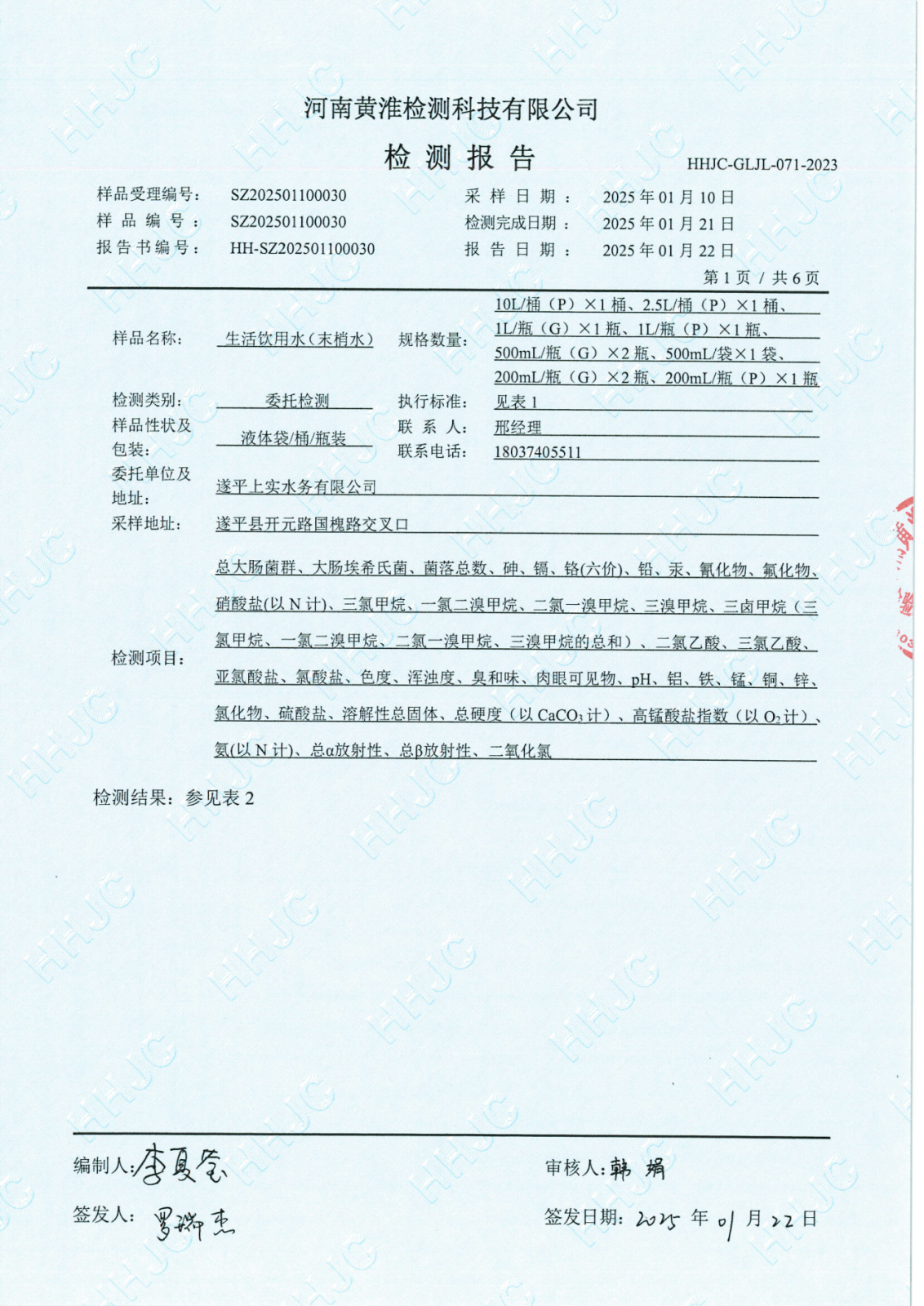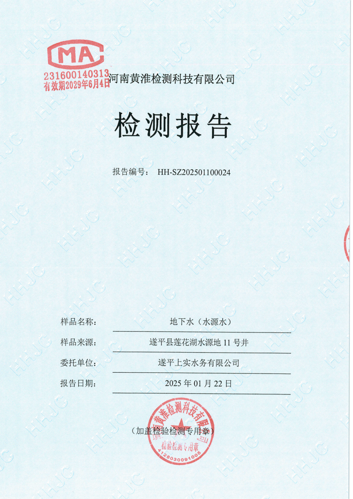 遂平上实水务有限公司2025年一水厂1月份水质检测报告