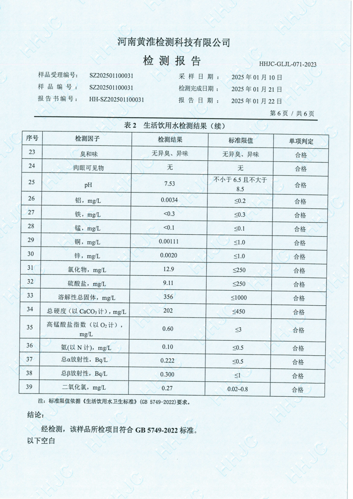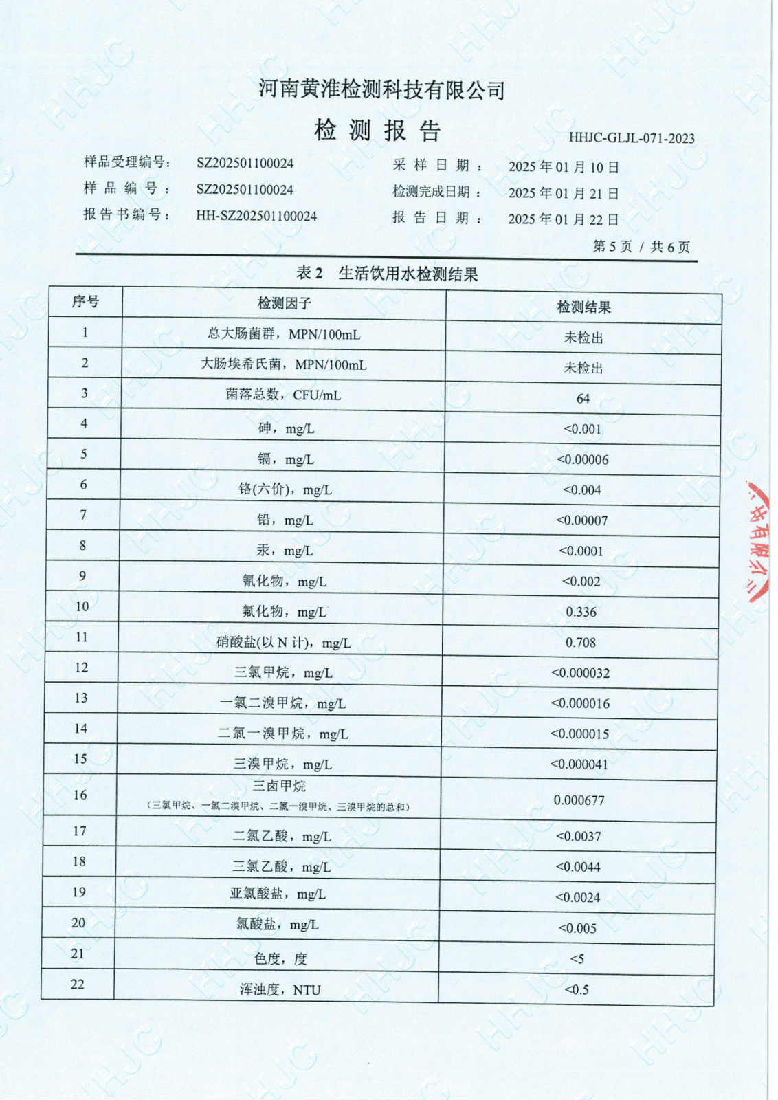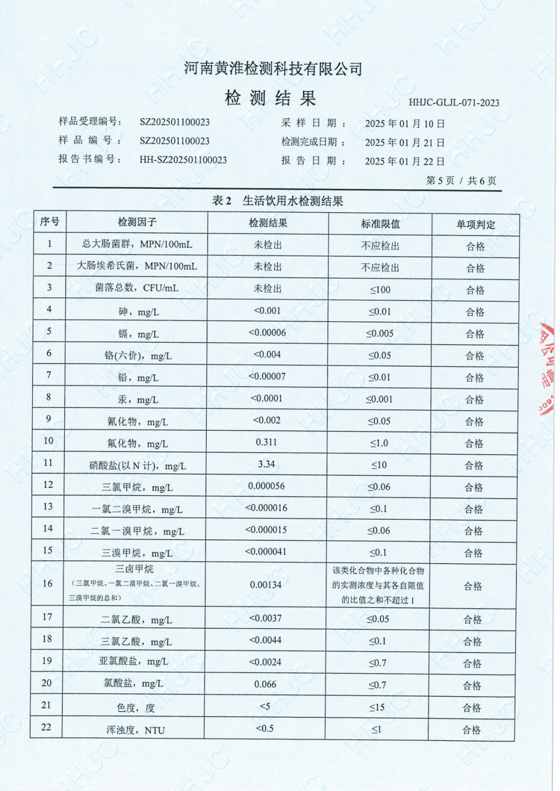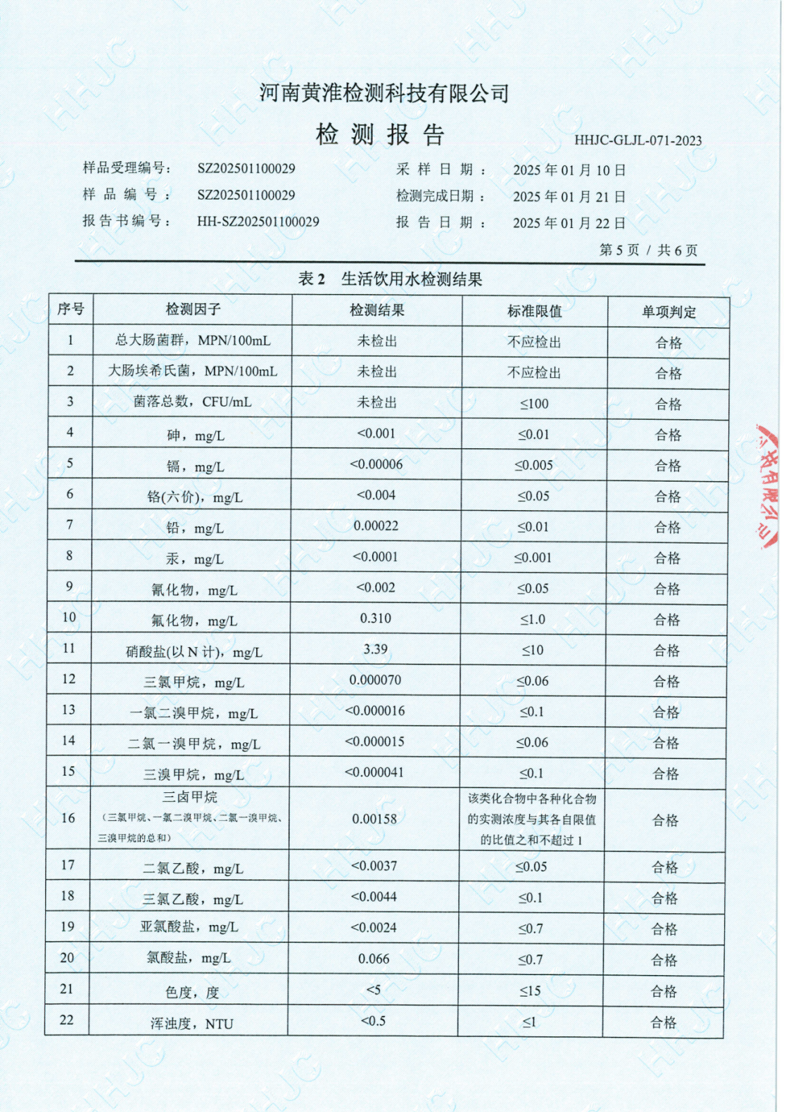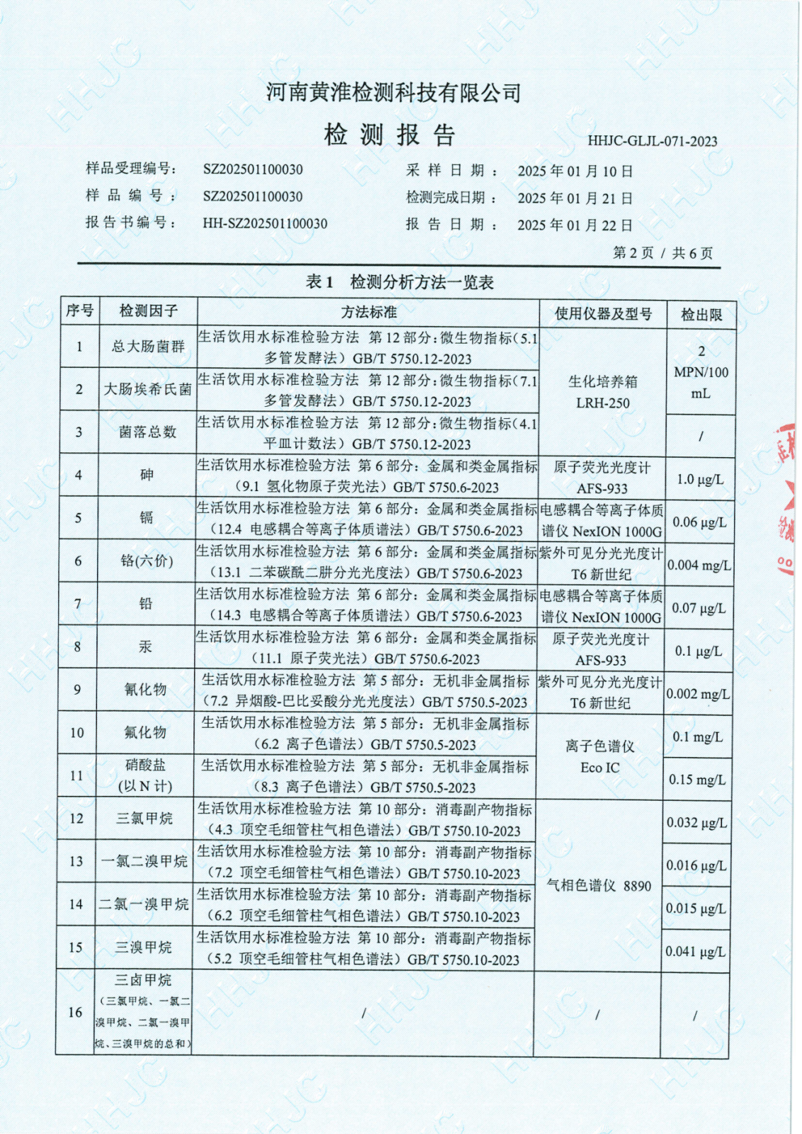 遂平上实水务有限公司2025年一水厂1月份水质检测报告