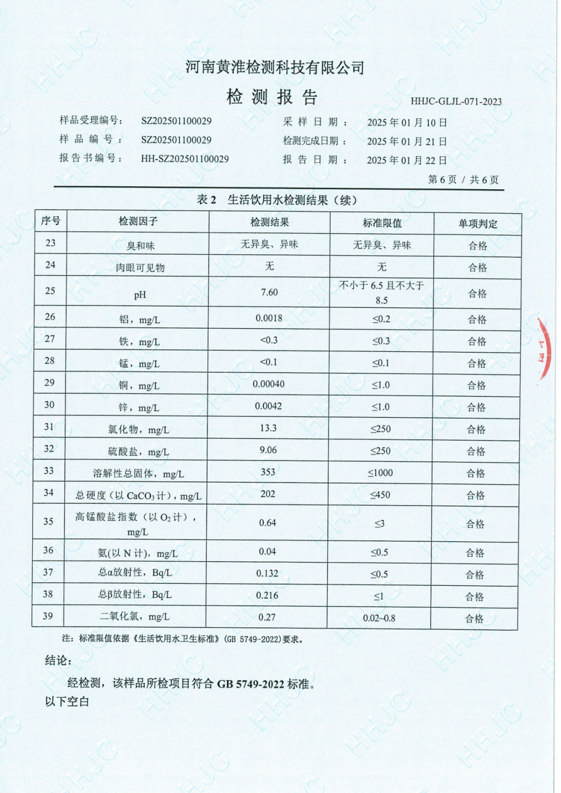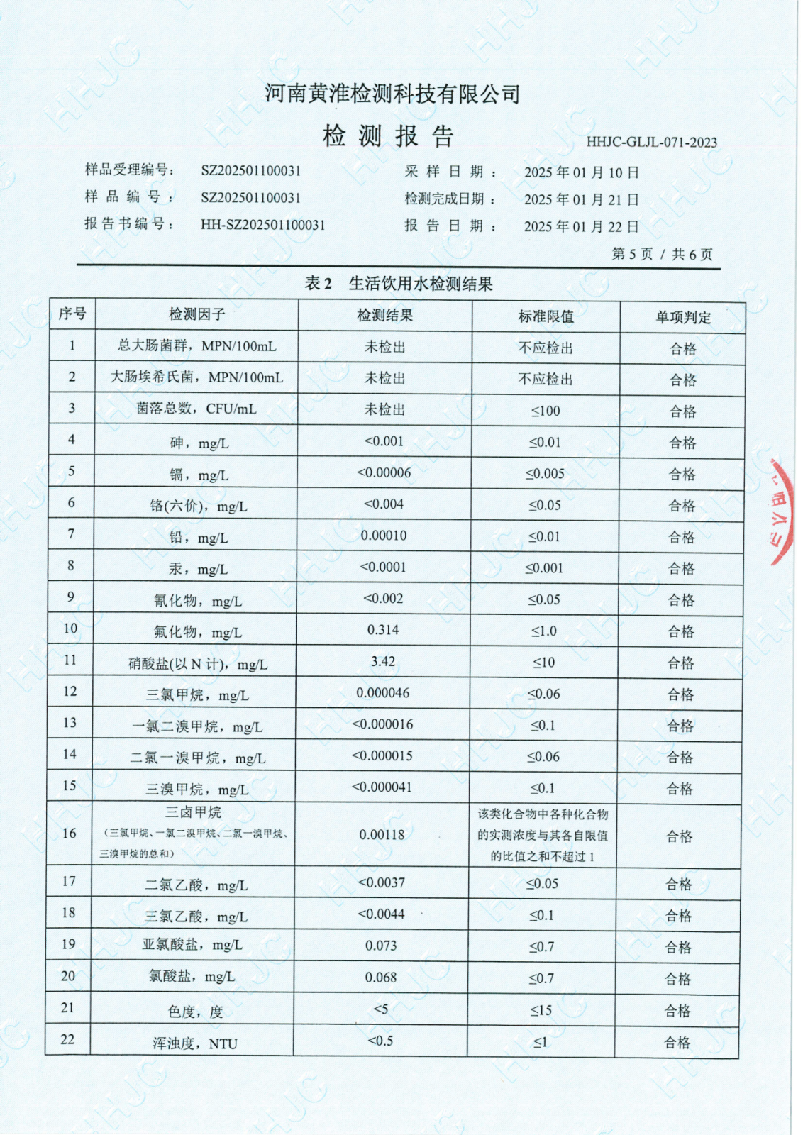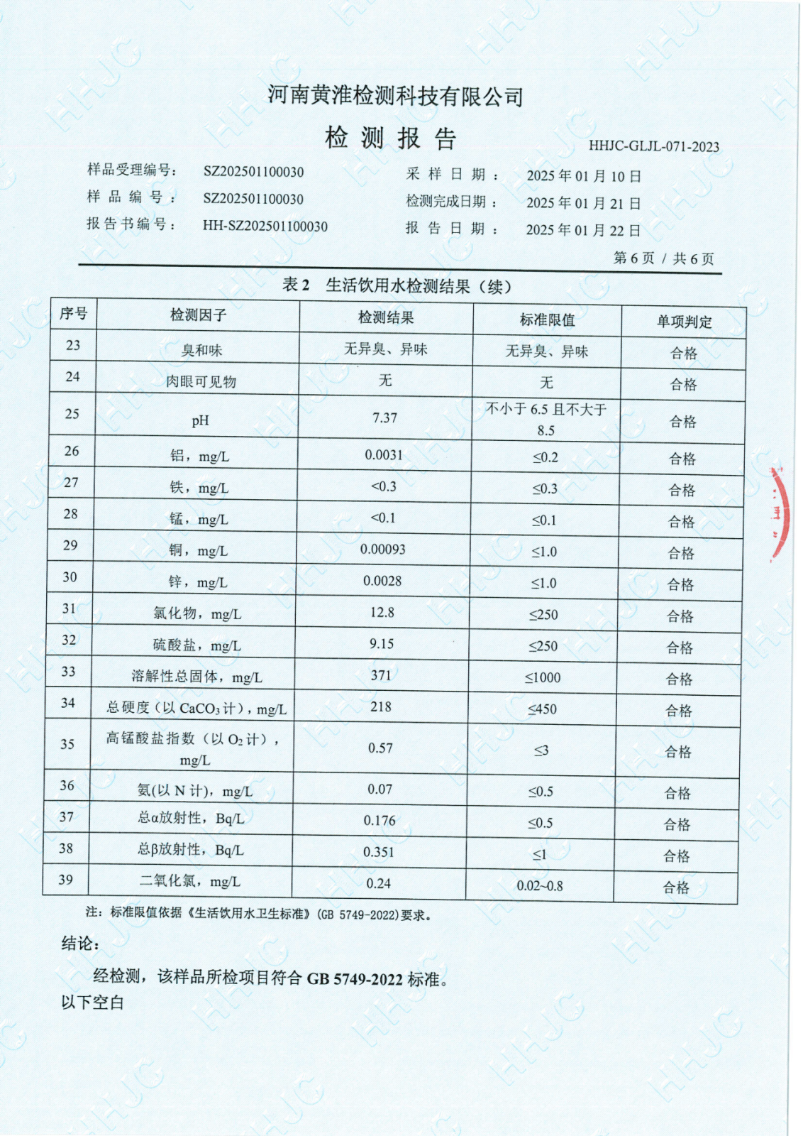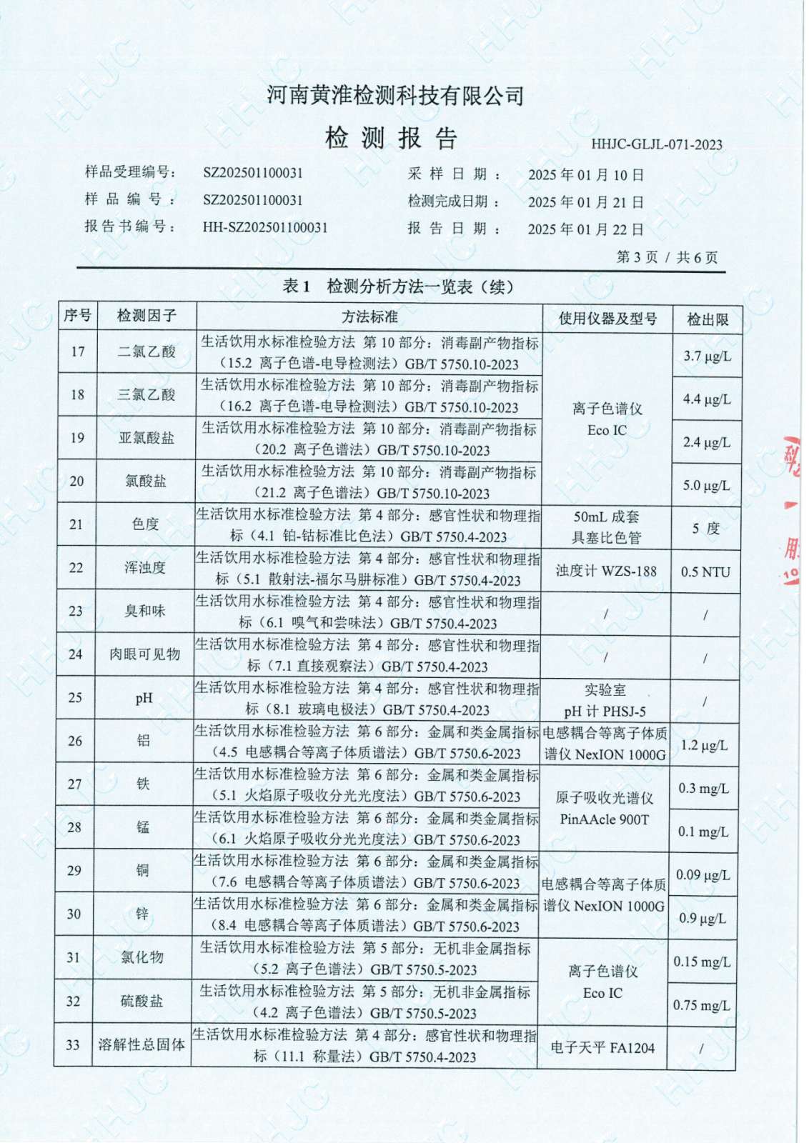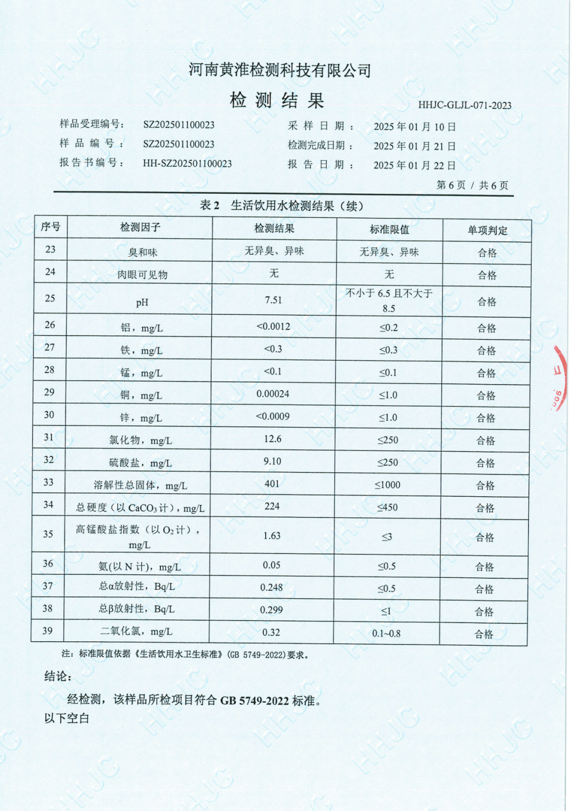 遂平上实水务有限公司2025年一水厂1月份水质检测报告