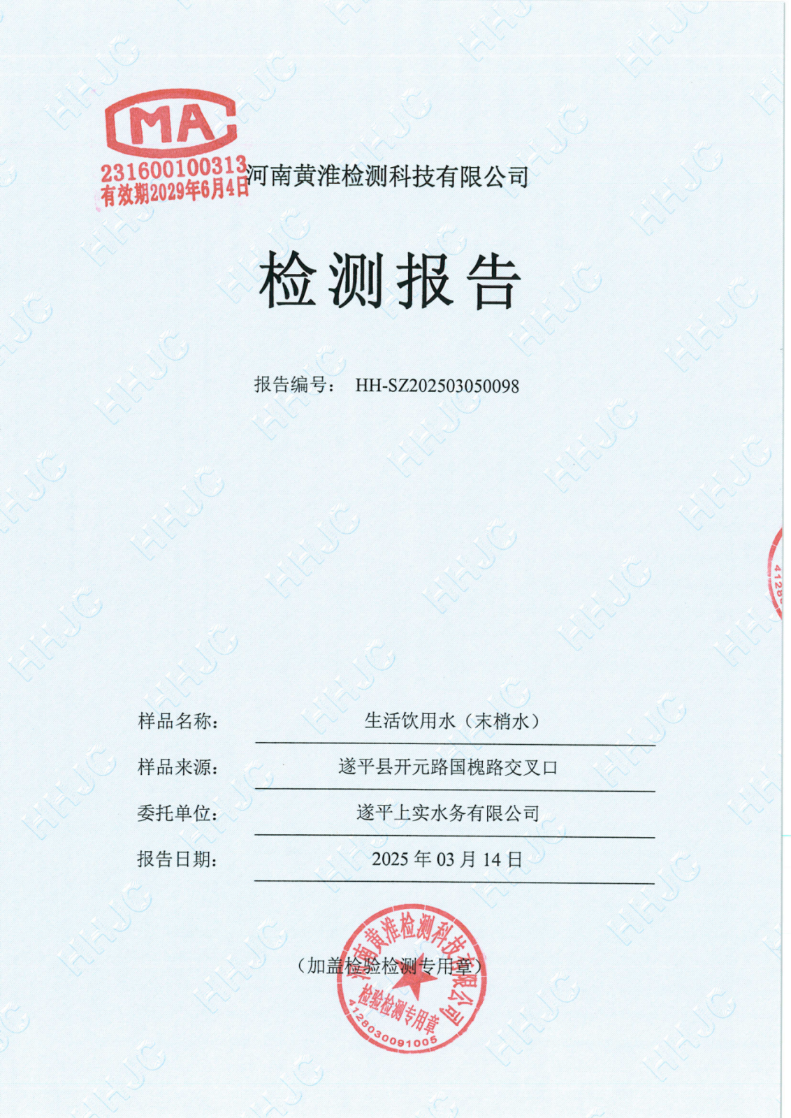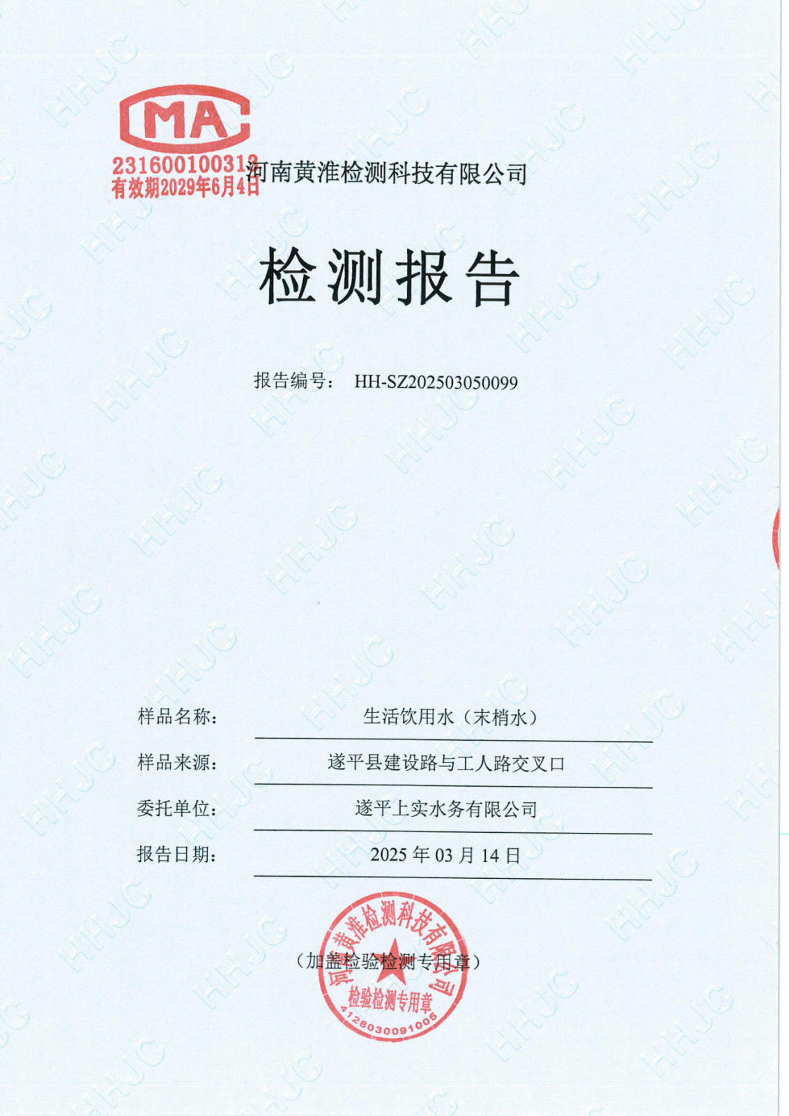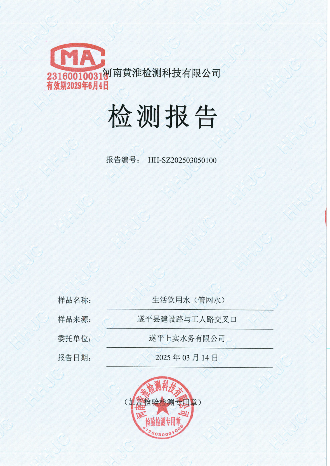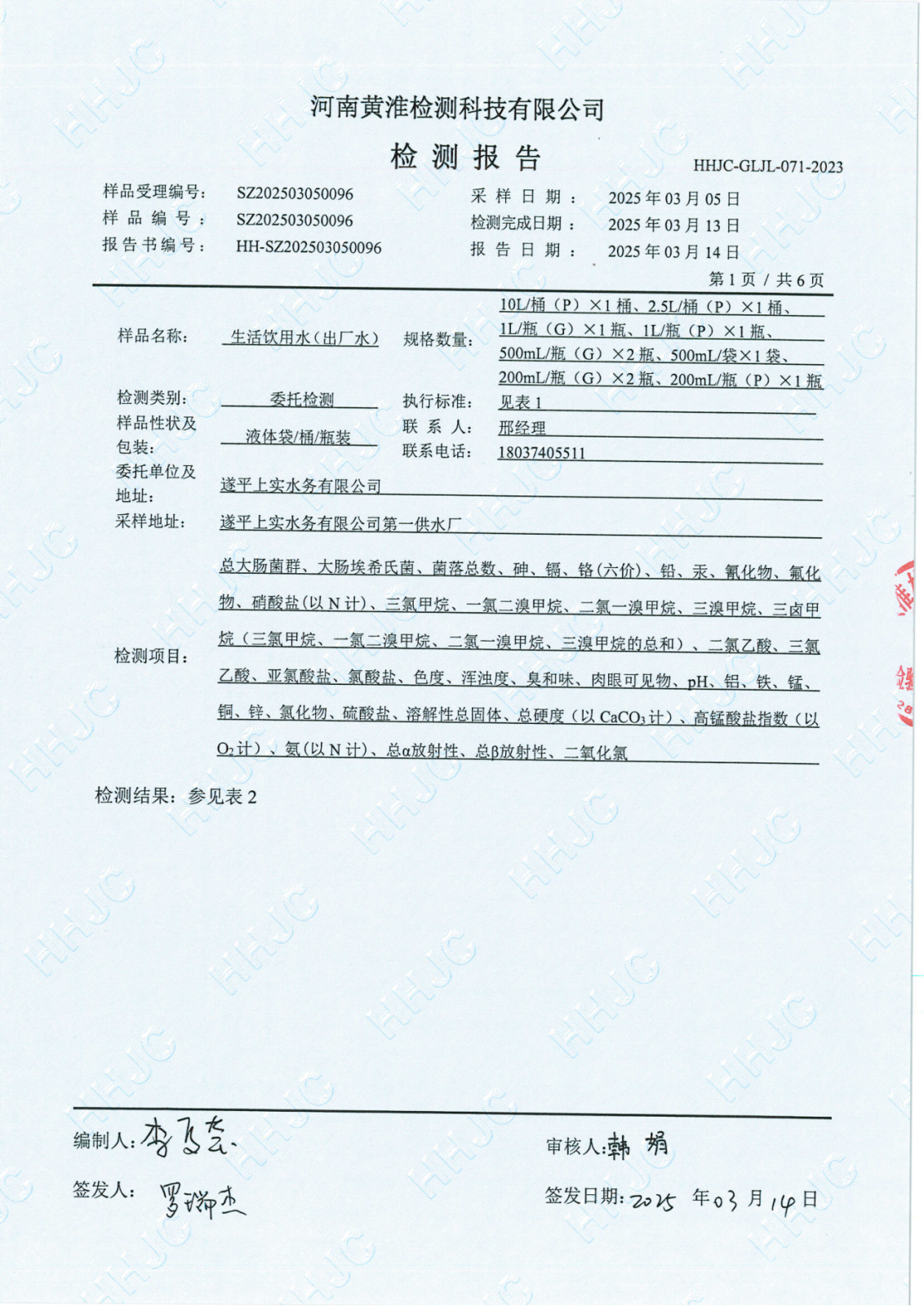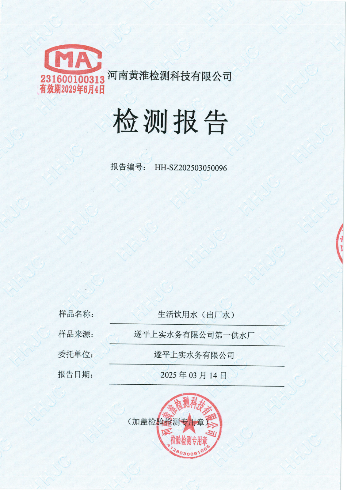 遂平上实水务有限公司2025年一水厂3月份水质检测报告