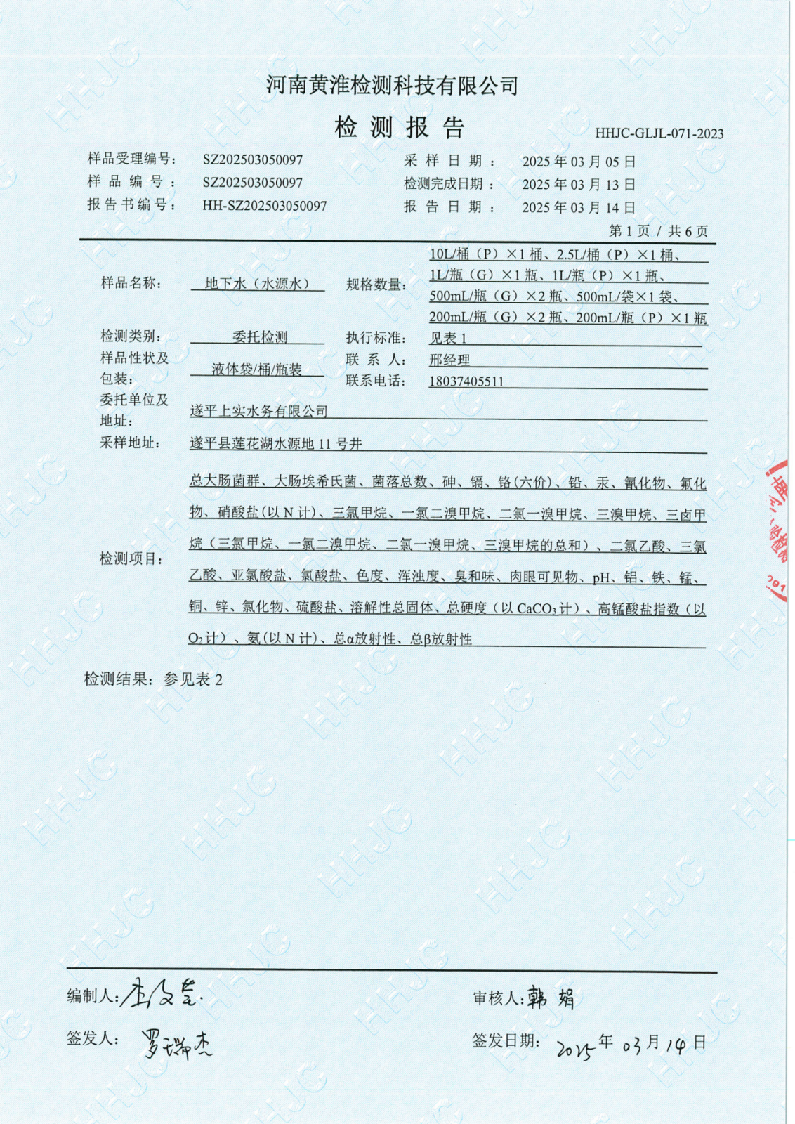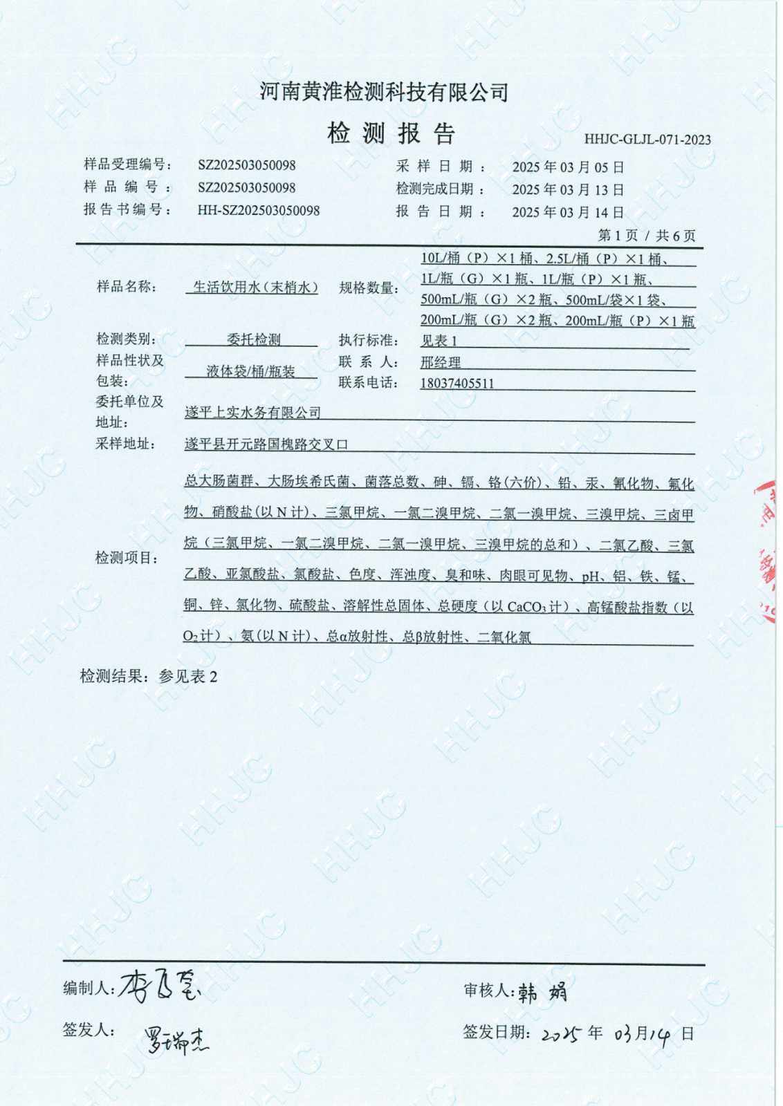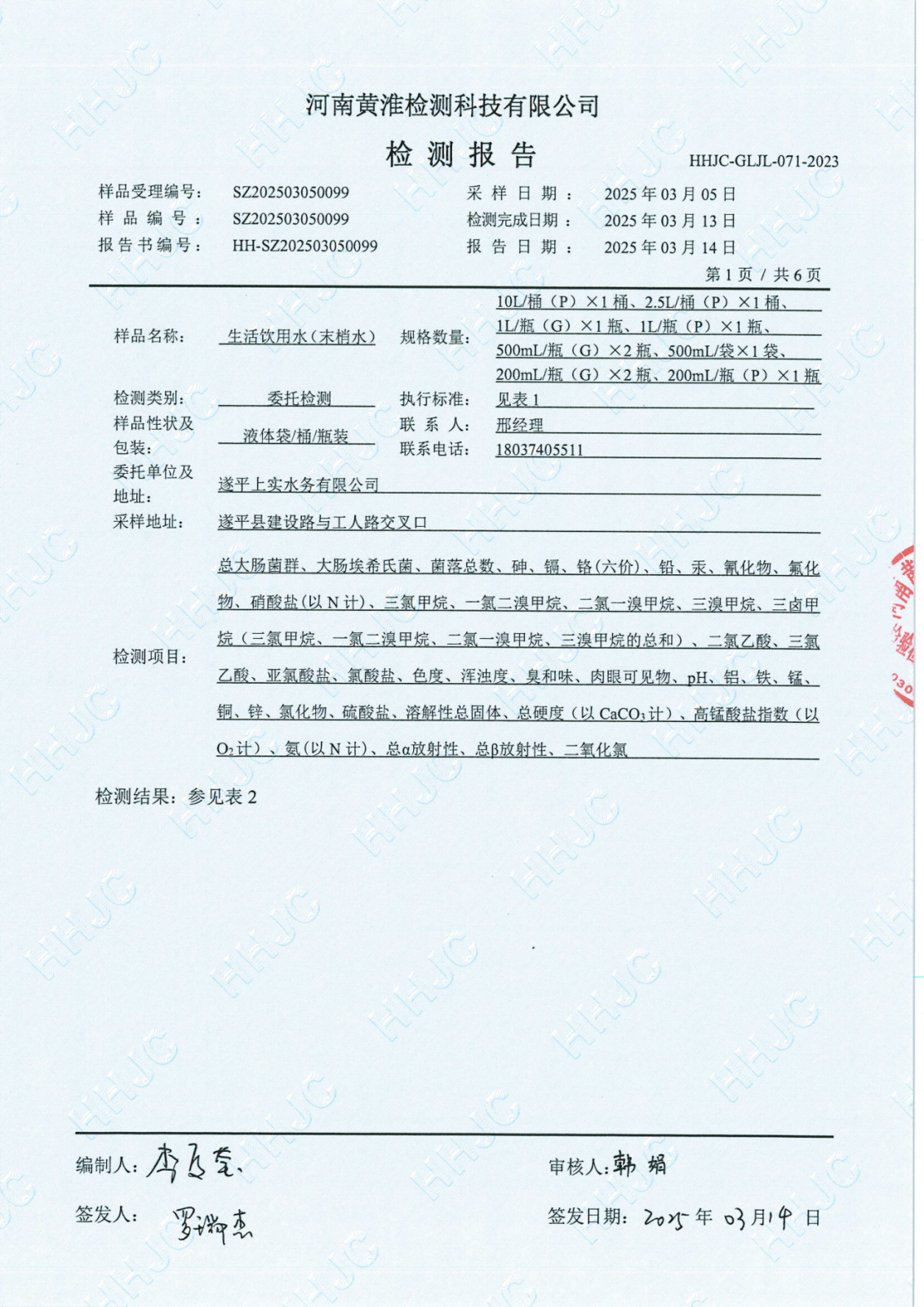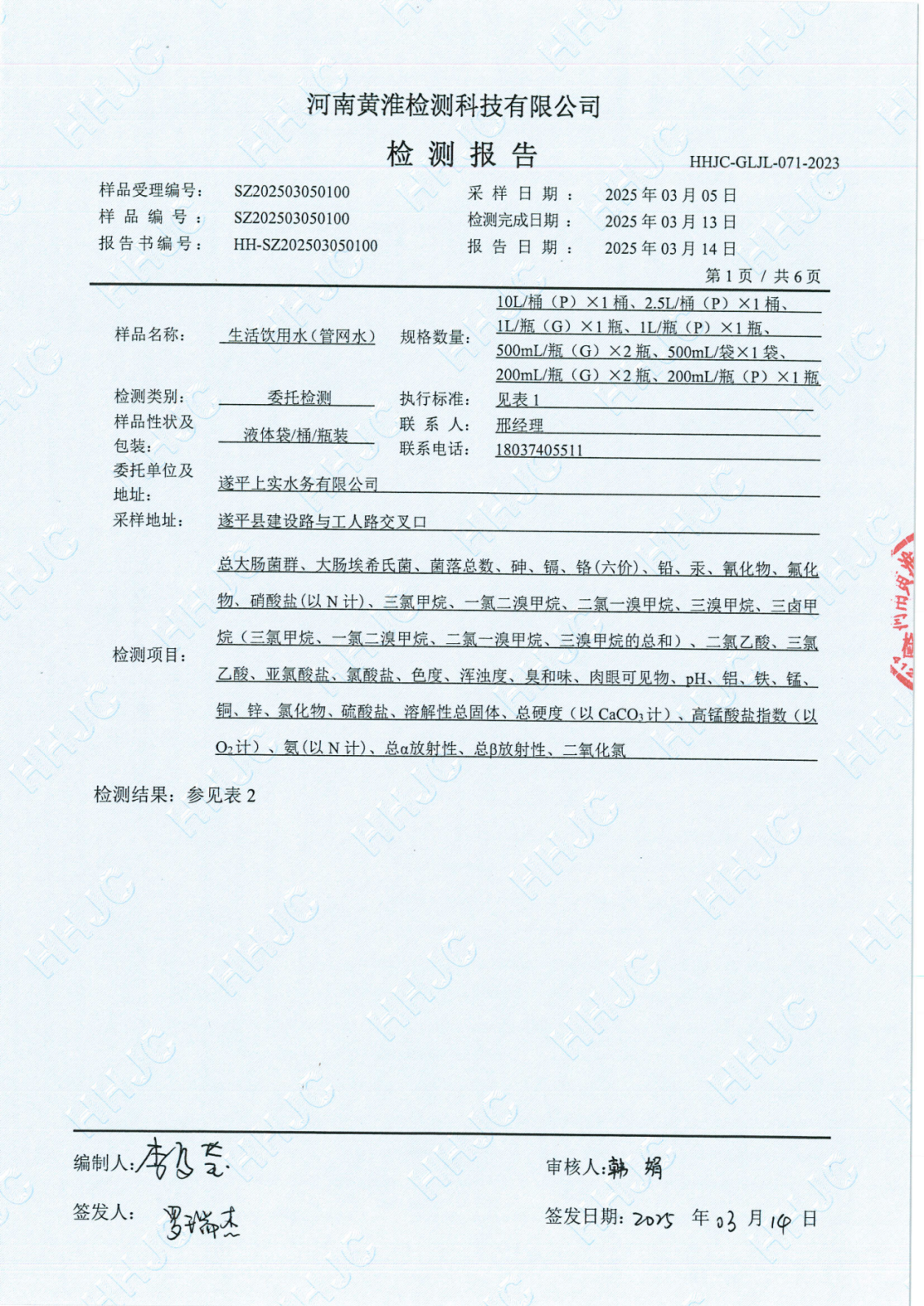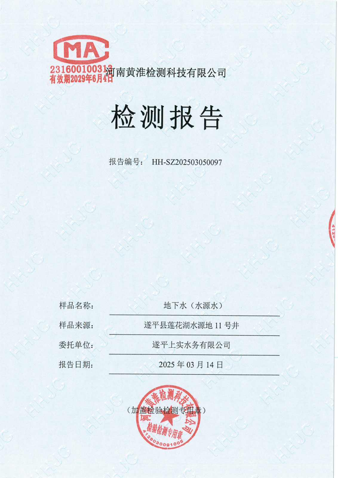 遂平上实水务有限公司2025年一水厂3月份水质检测报告