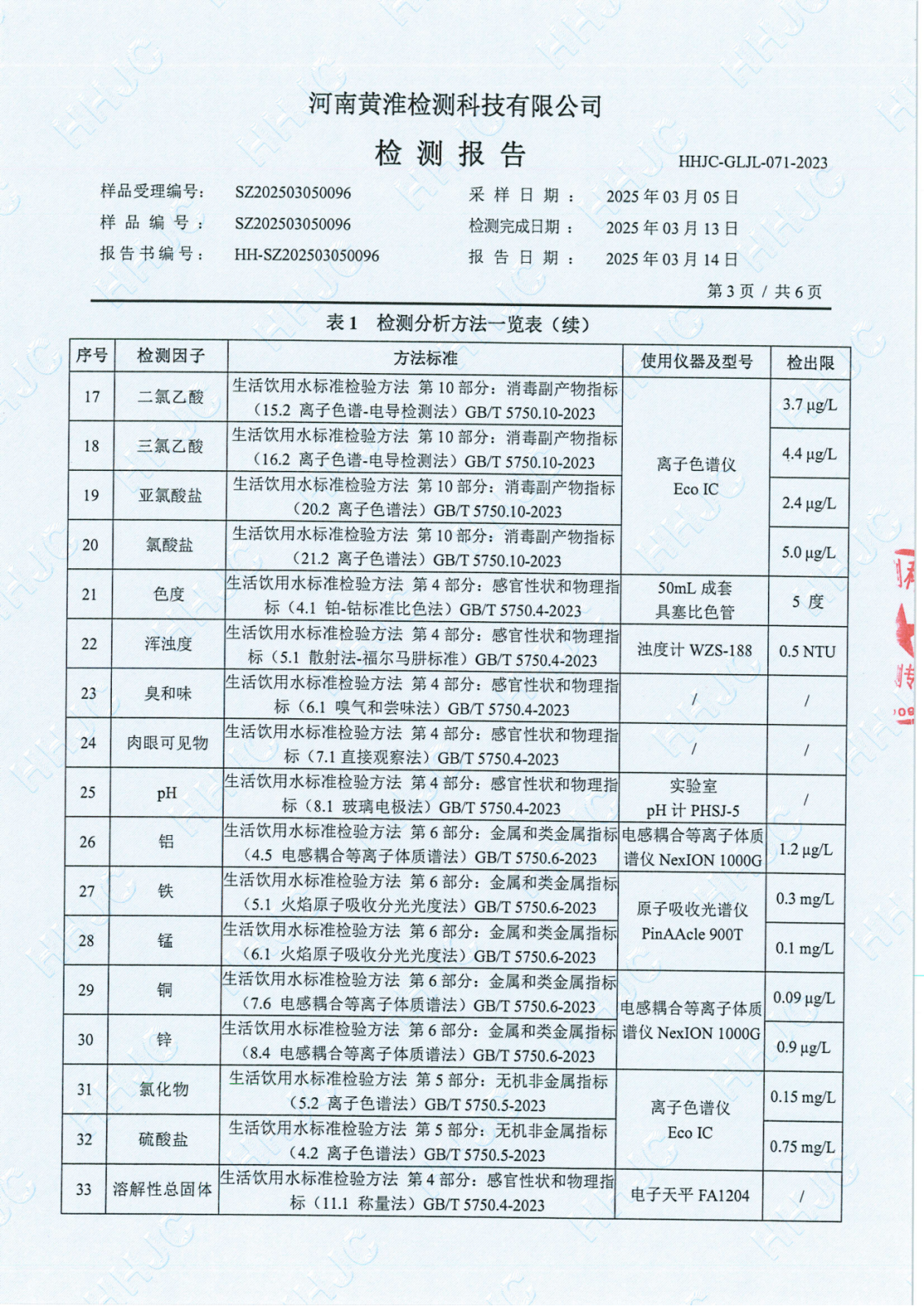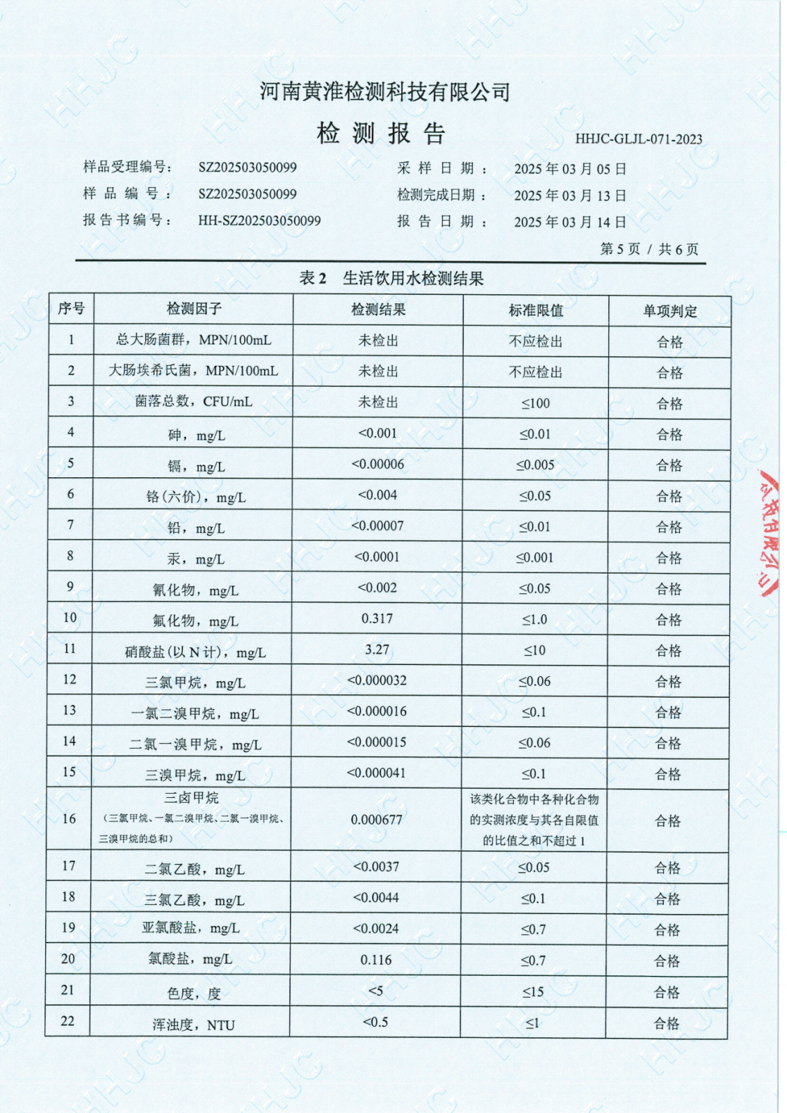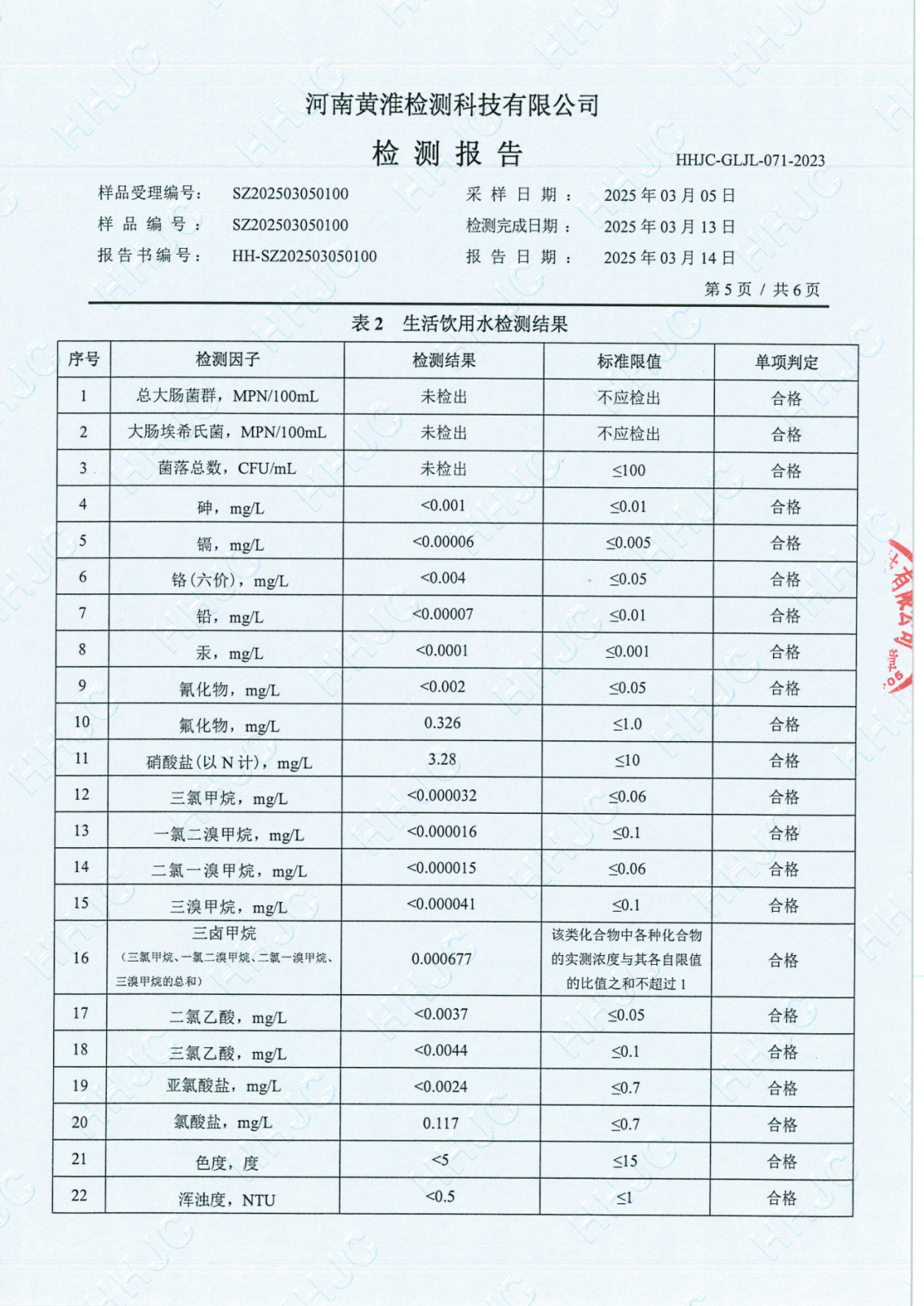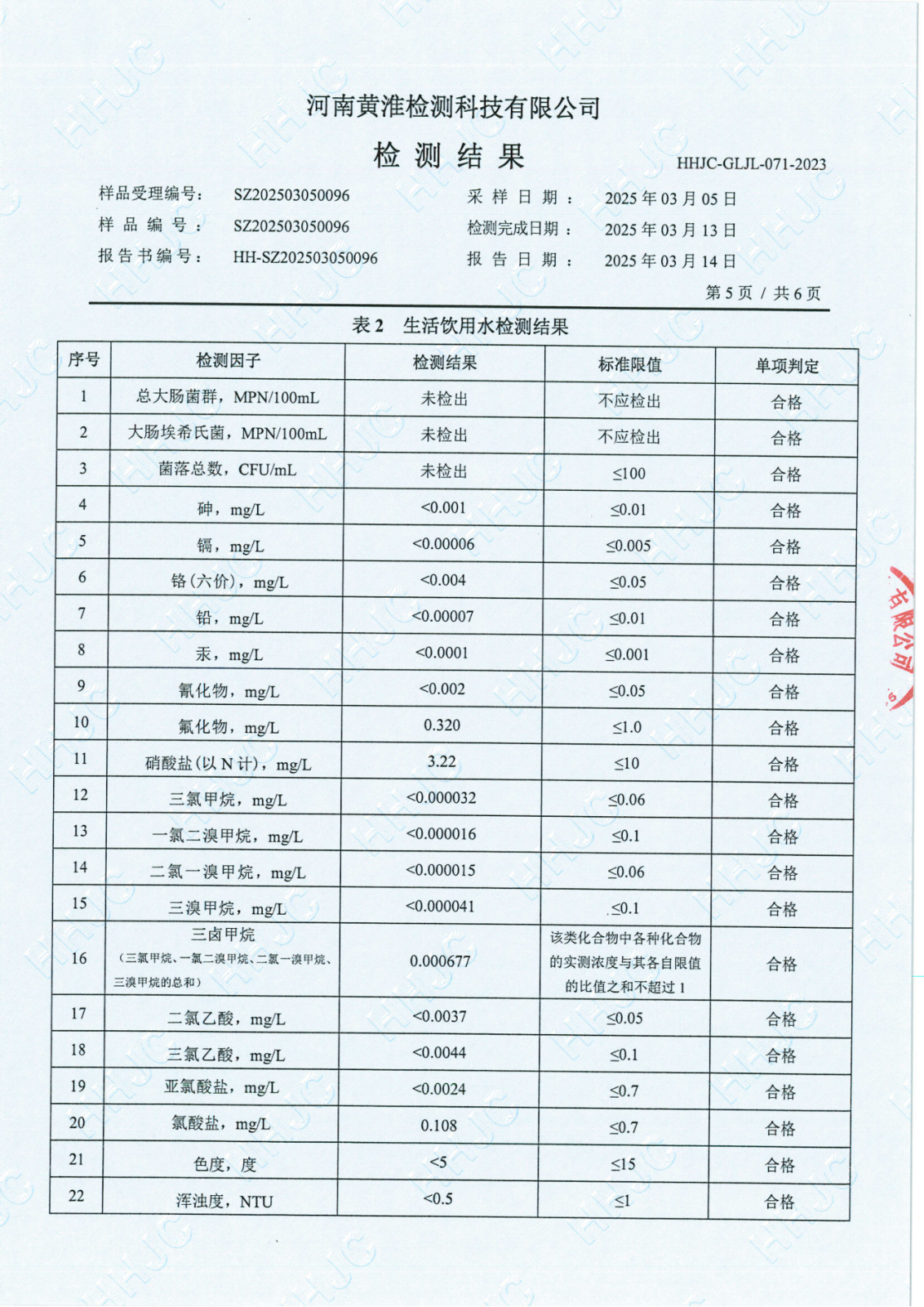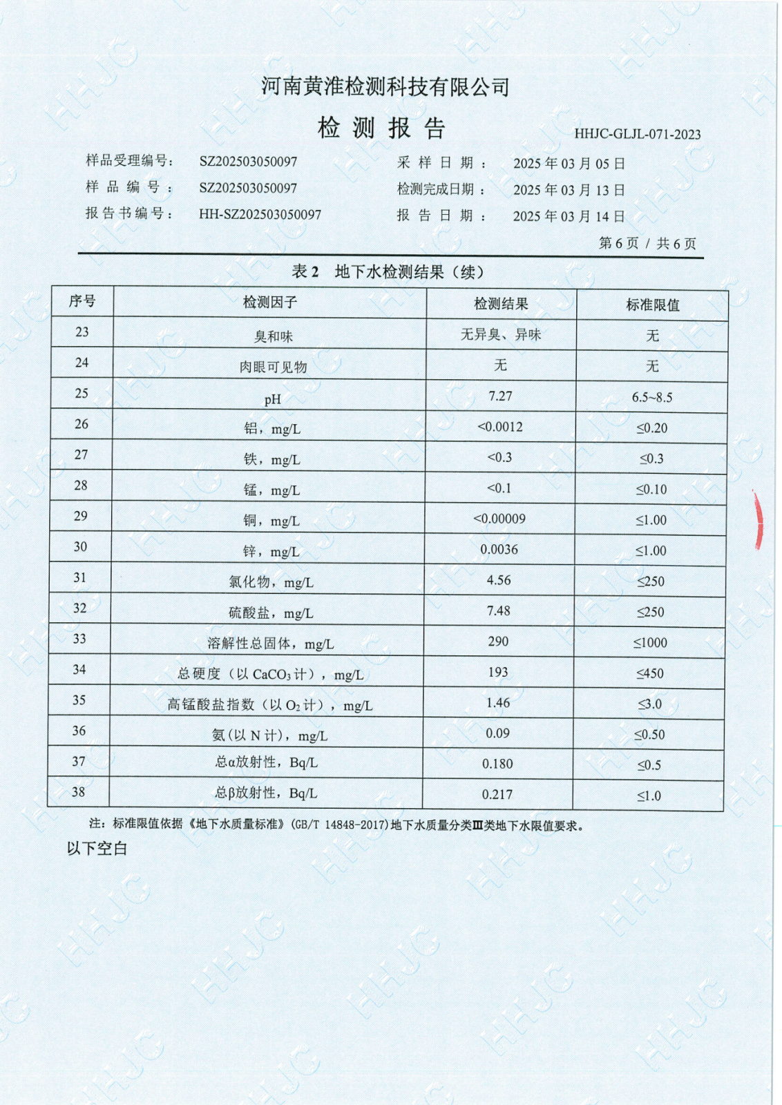 遂平上实水务有限公司2025年一水厂3月份水质检测报告