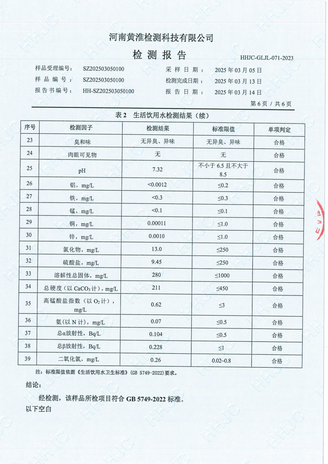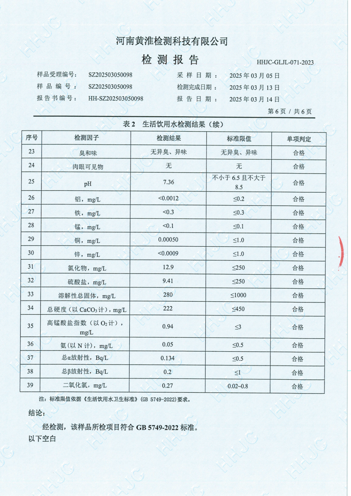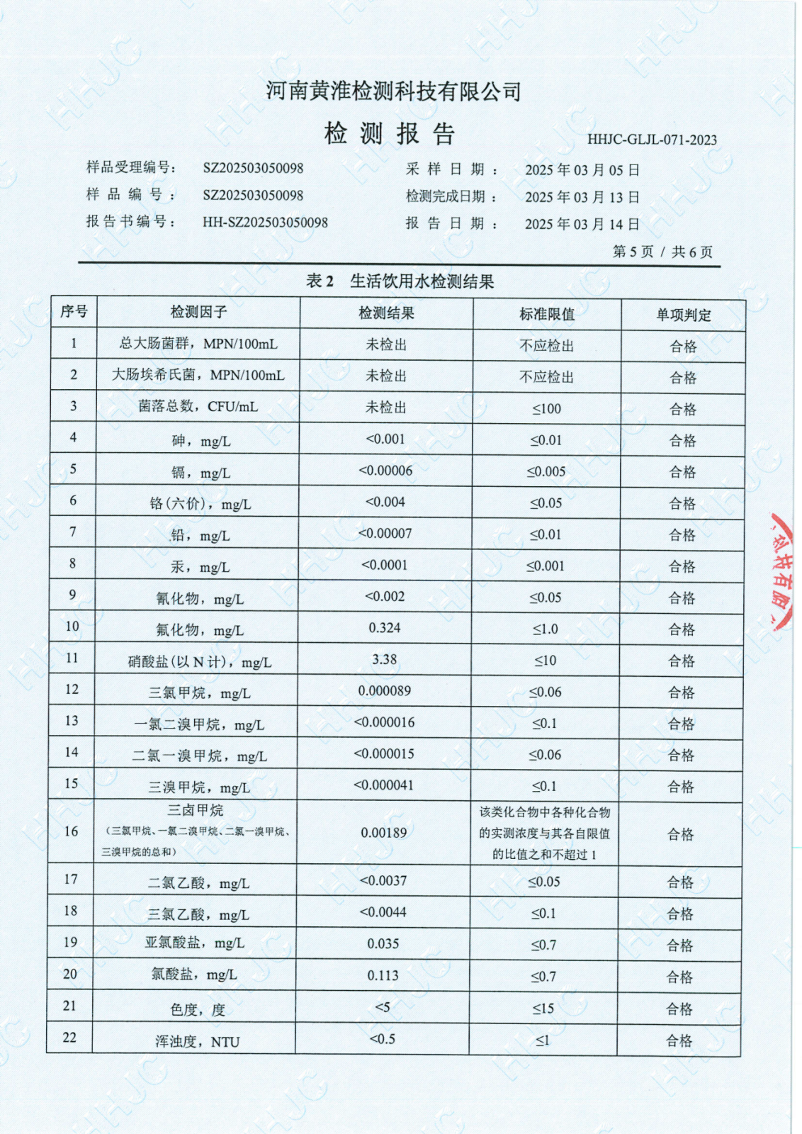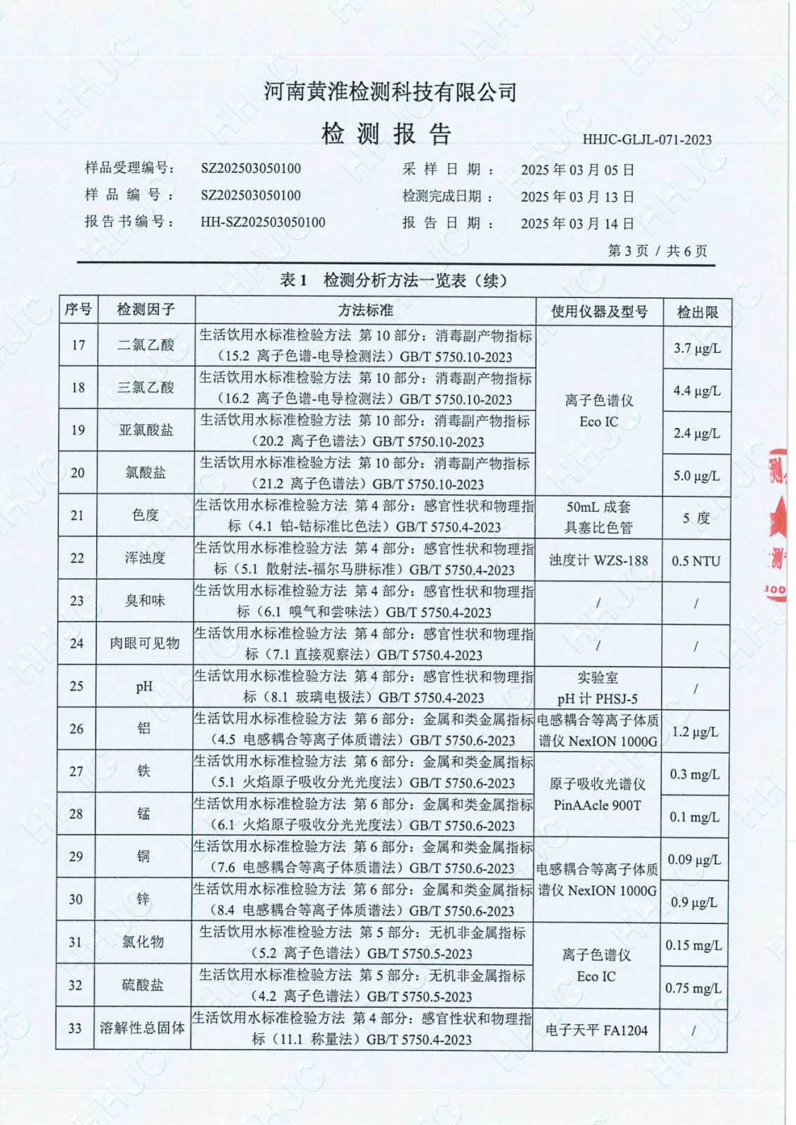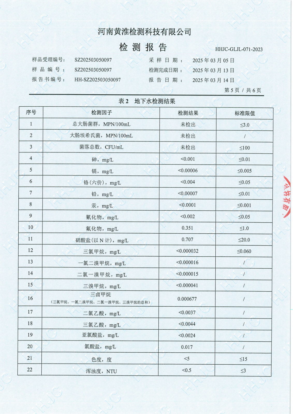 遂平上实水务有限公司2025年一水厂3月份水质检测报告