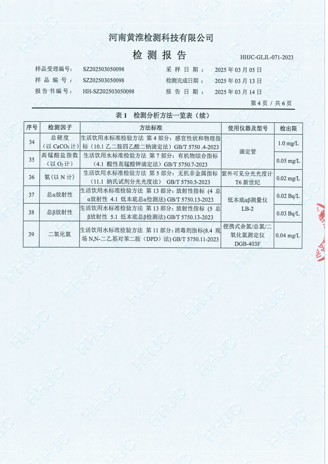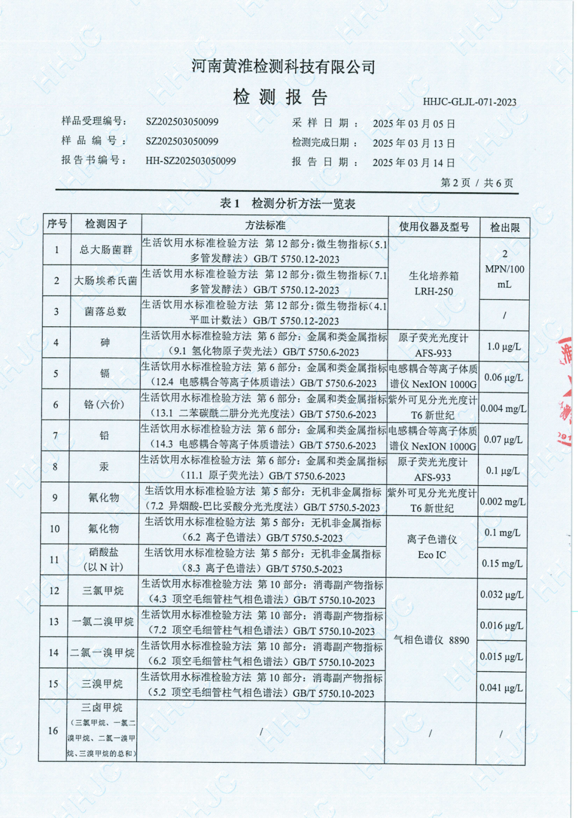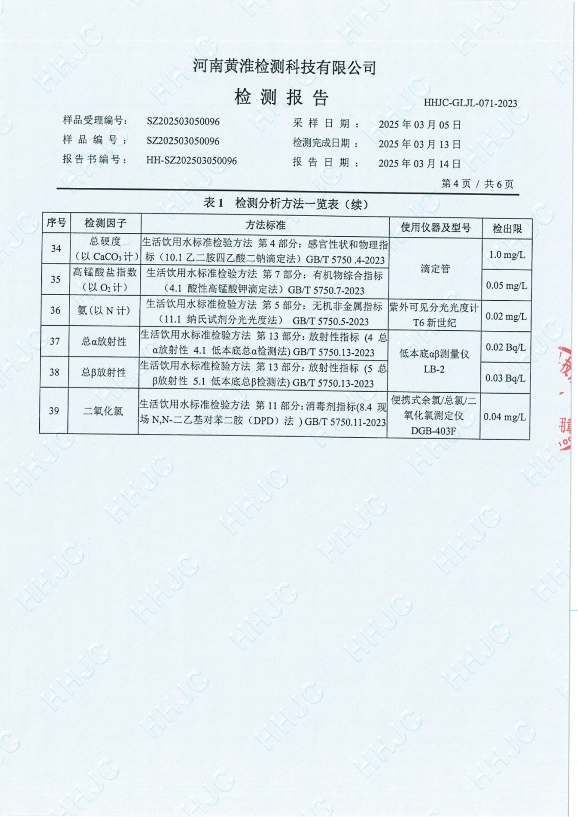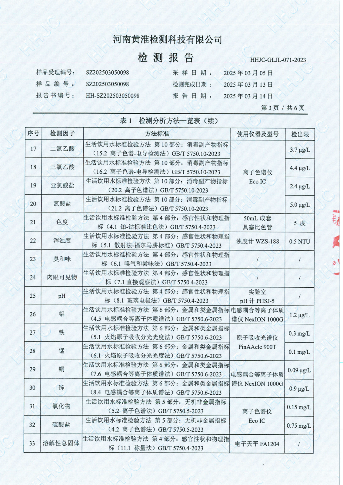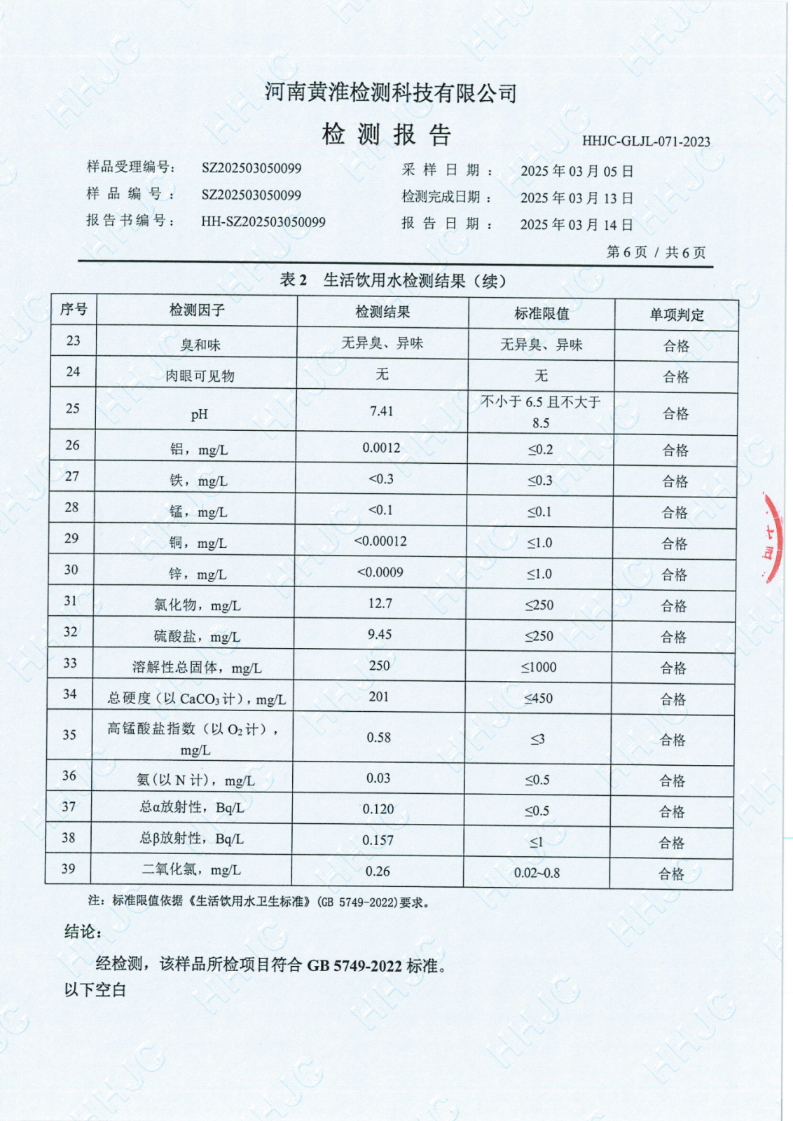 遂平上实水务有限公司2025年一水厂3月份水质检测报告