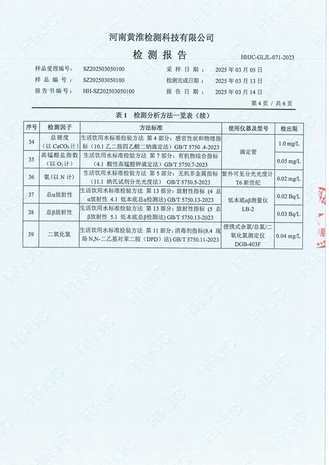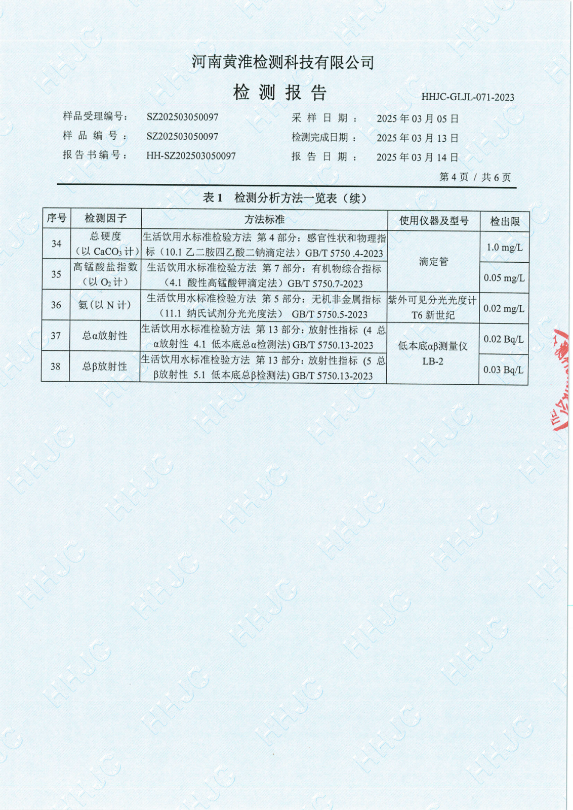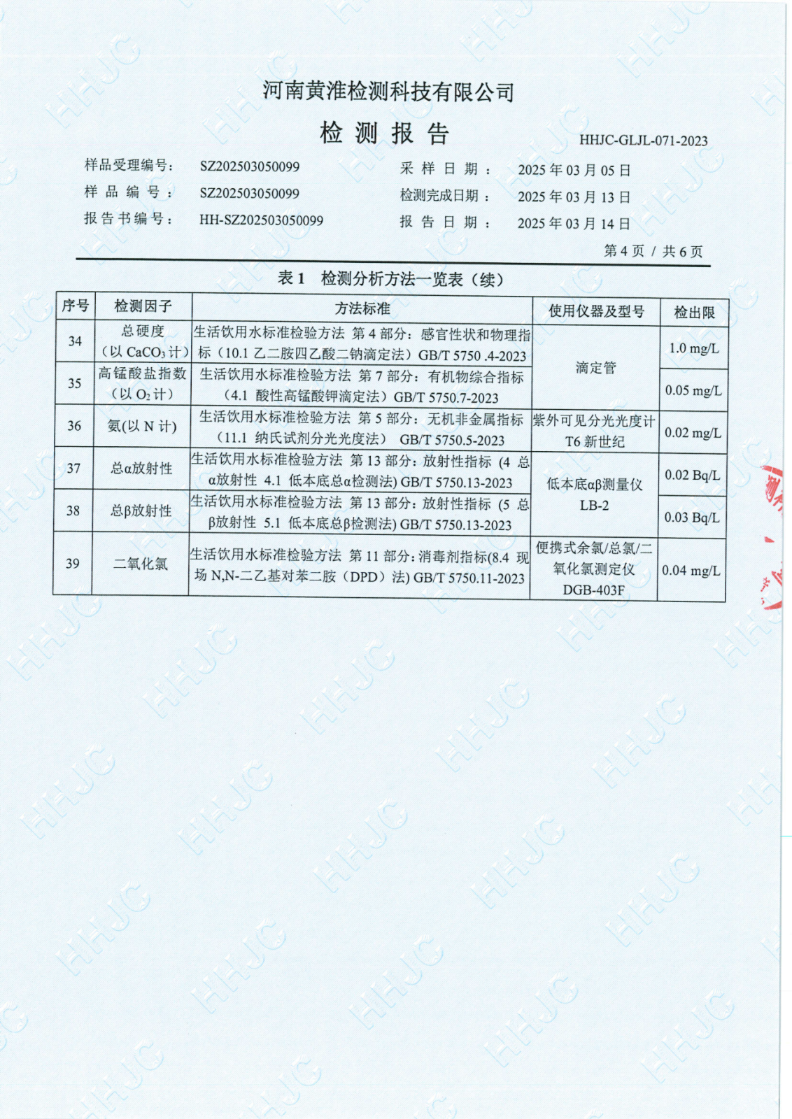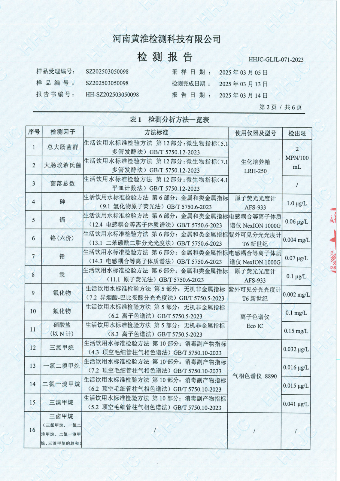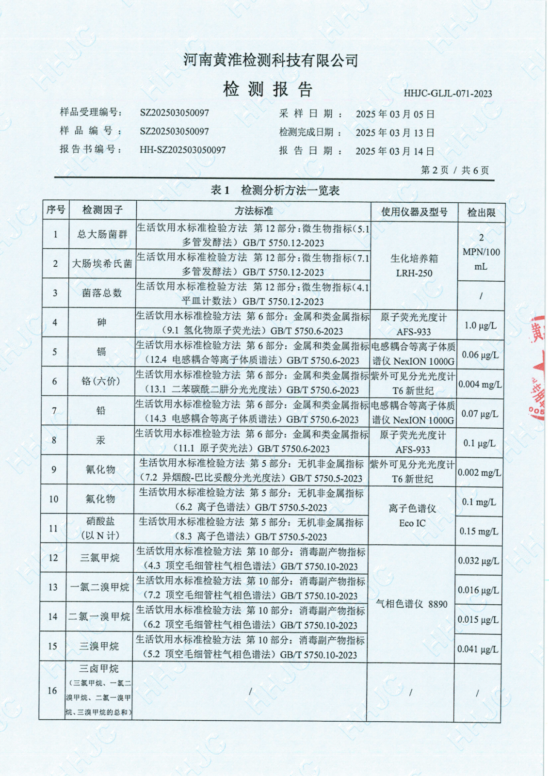 遂平上实水务有限公司2025年一水厂3月份水质检测报告