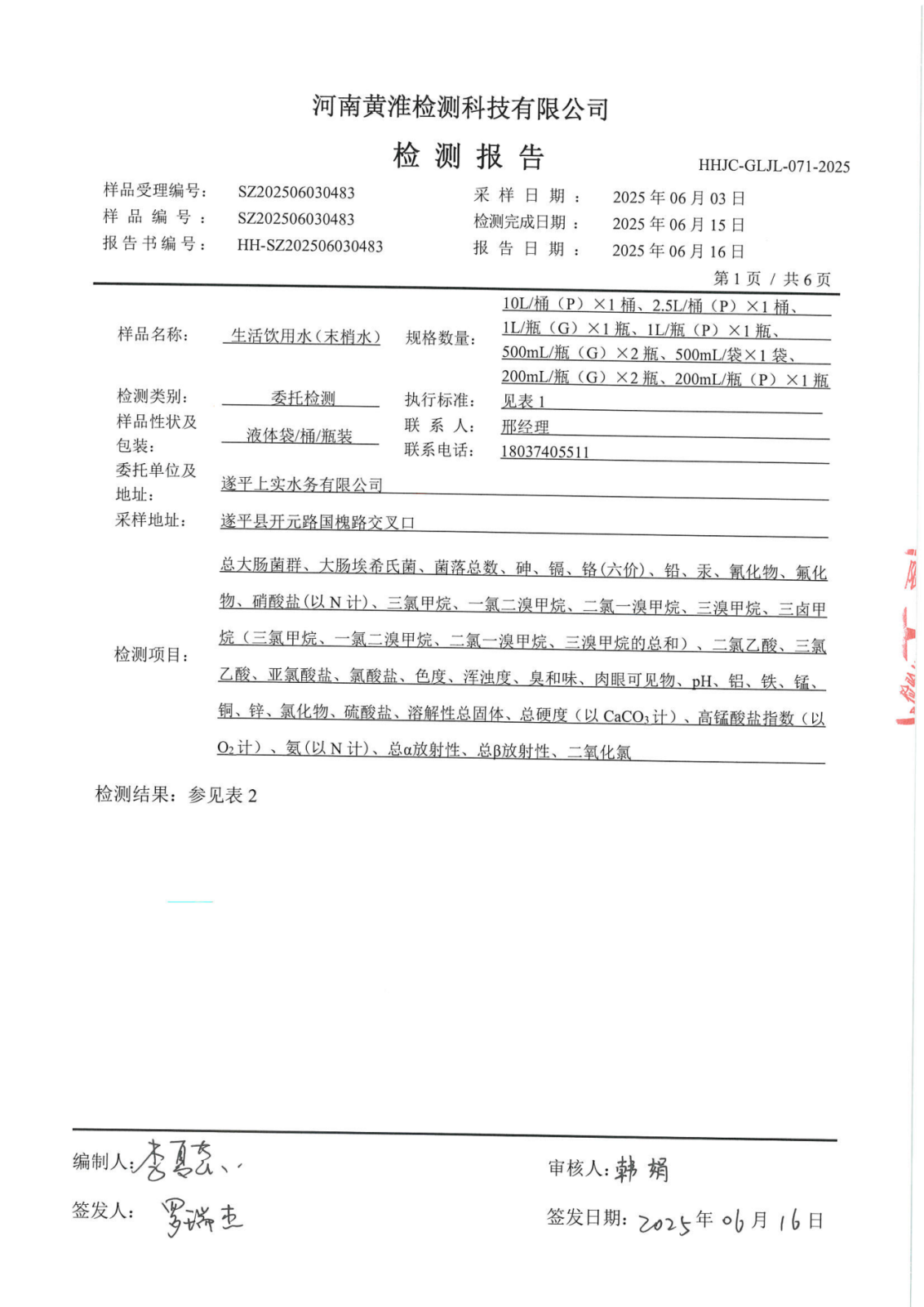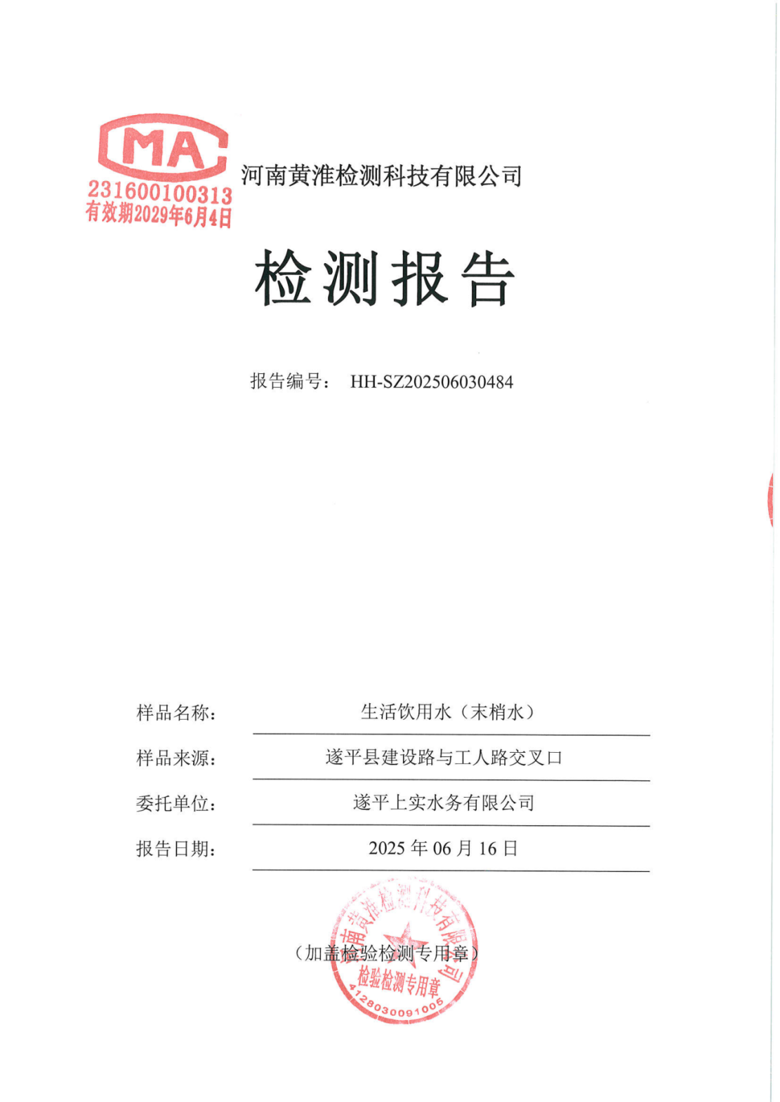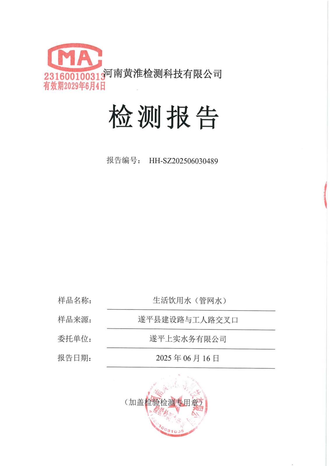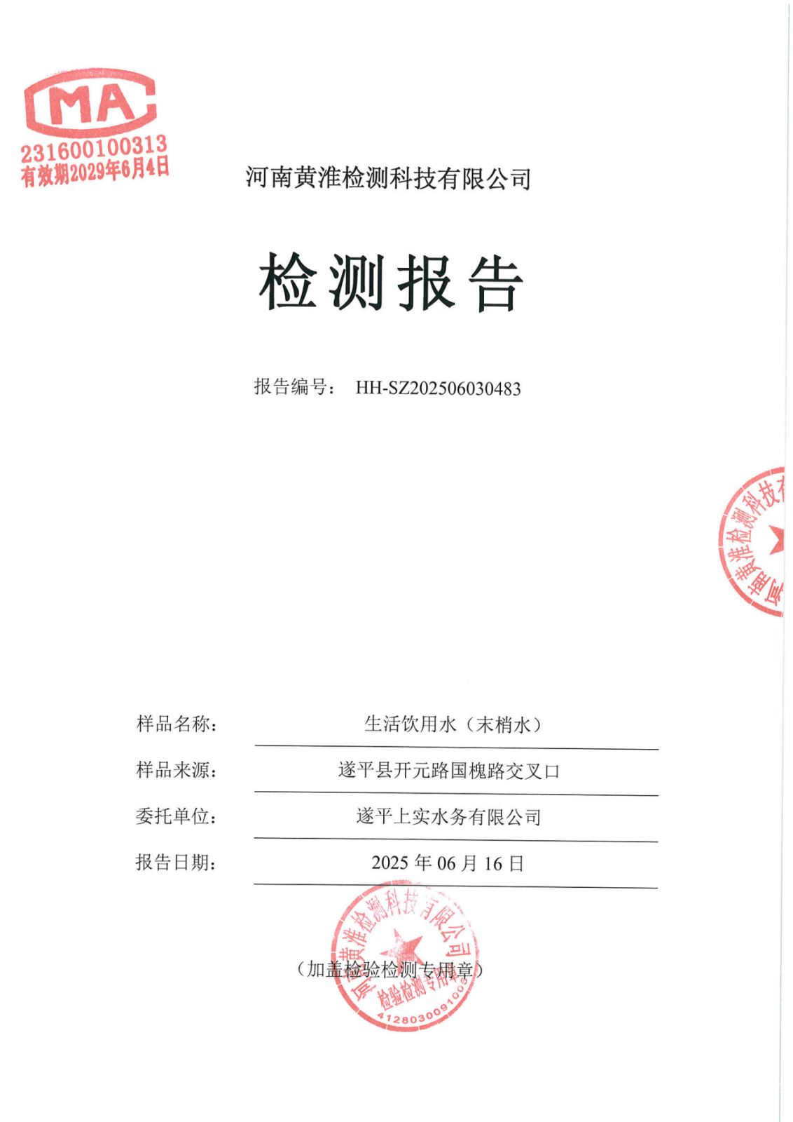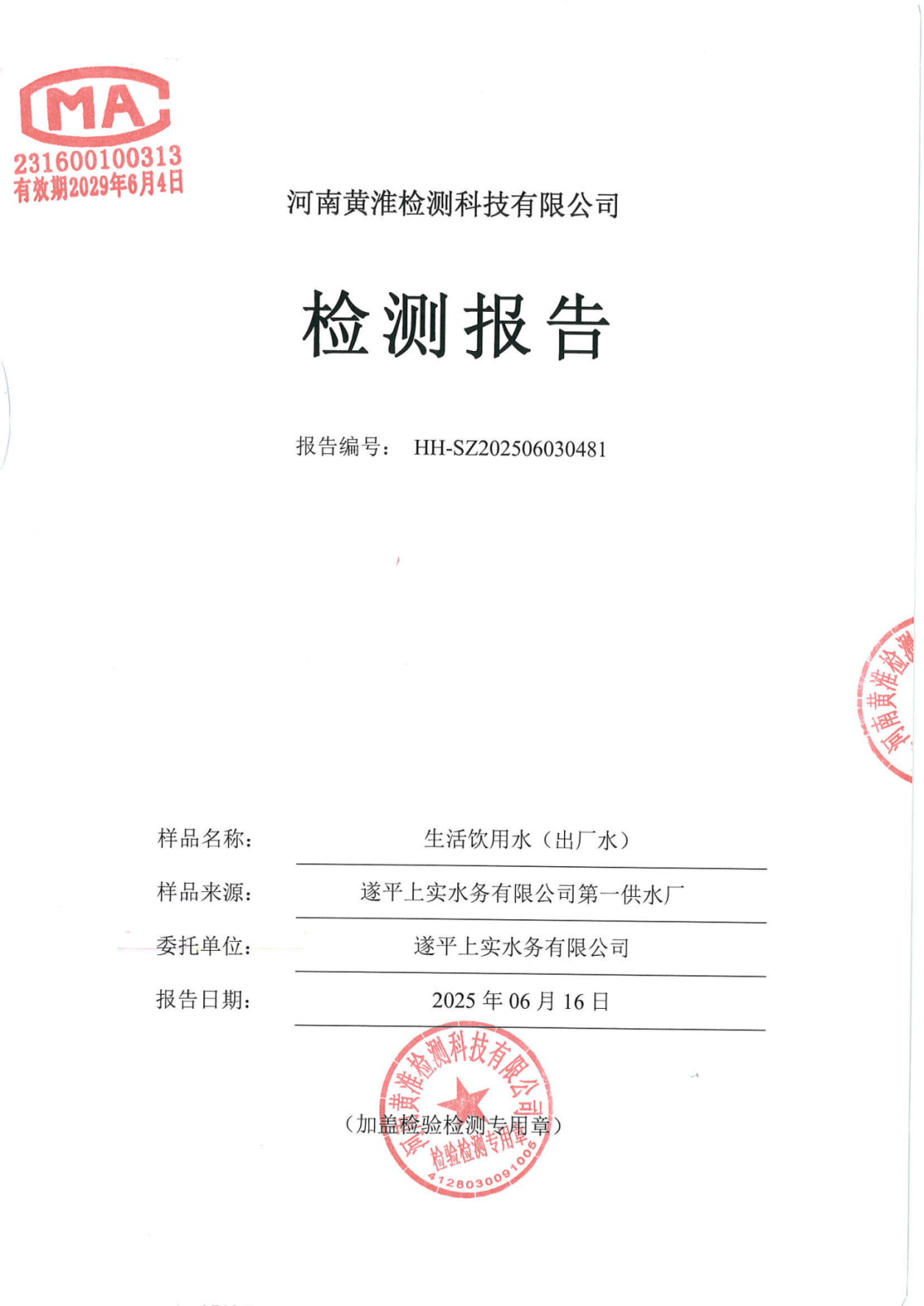 遂平上实水务有限公司2025年一水厂6月份水质检测报告