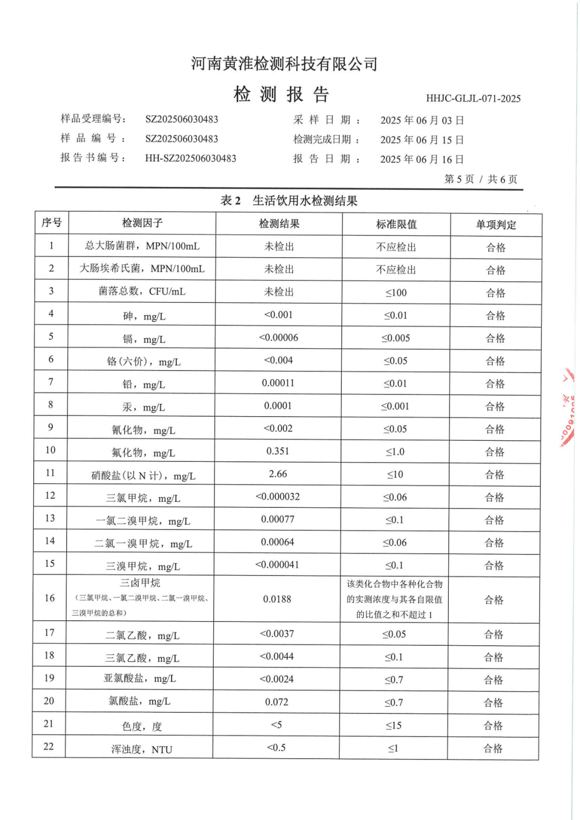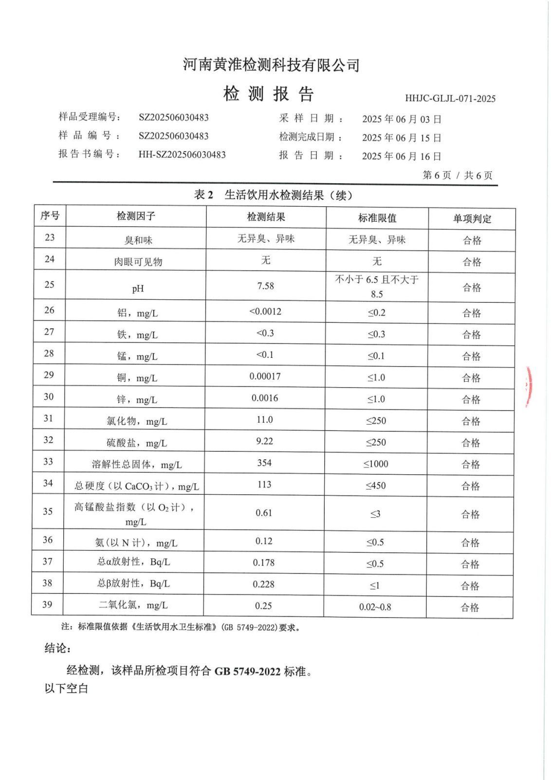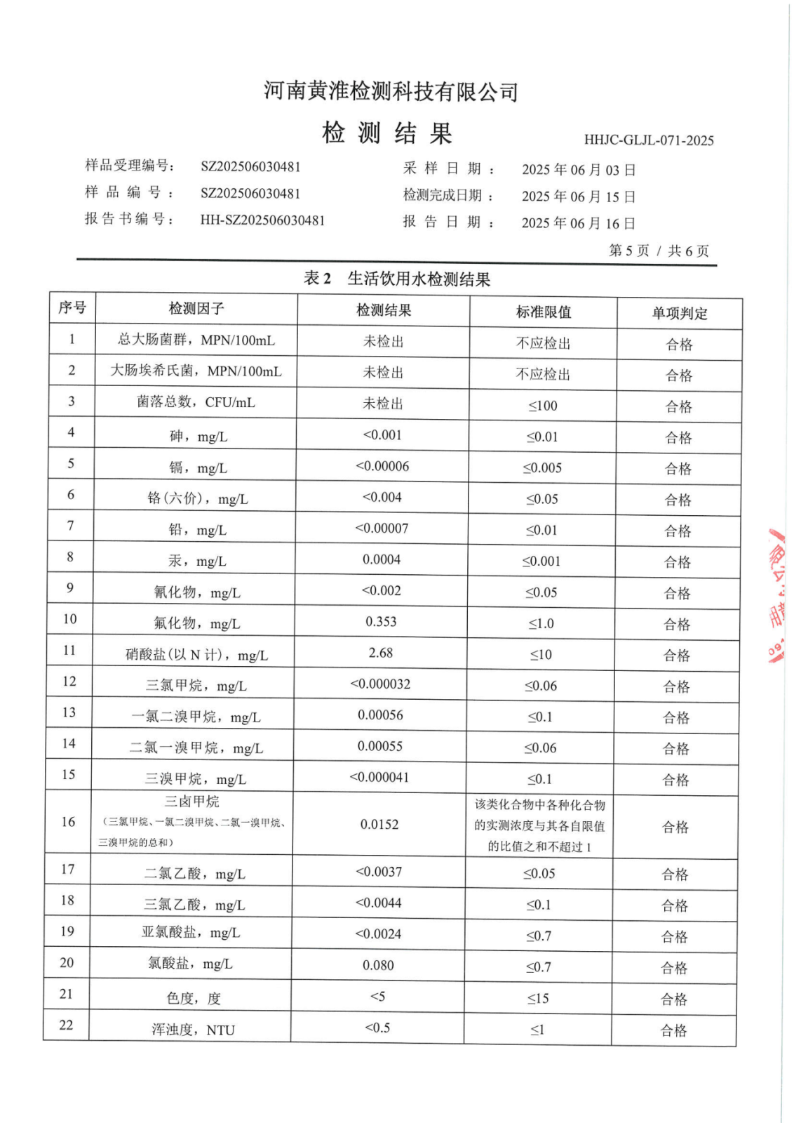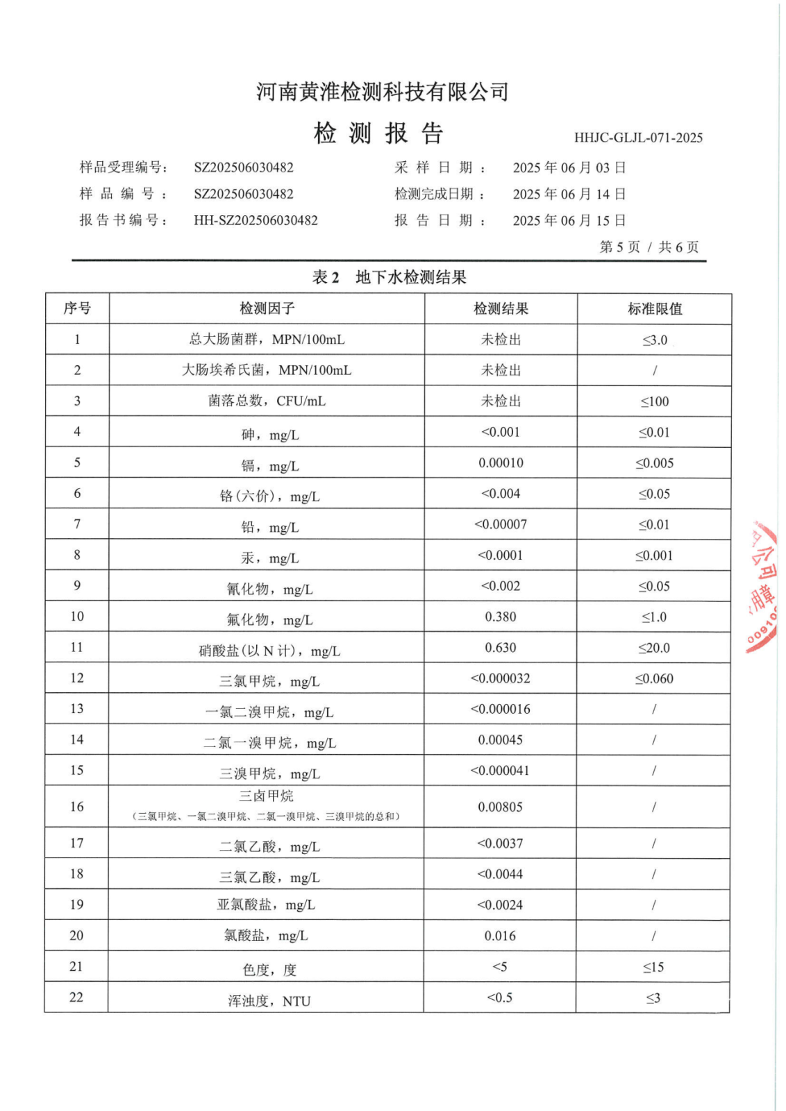遂平上实水务有限公司2025年一水厂6月份水质检测报告