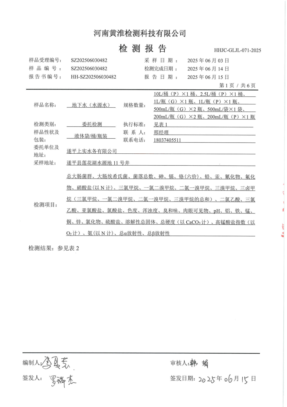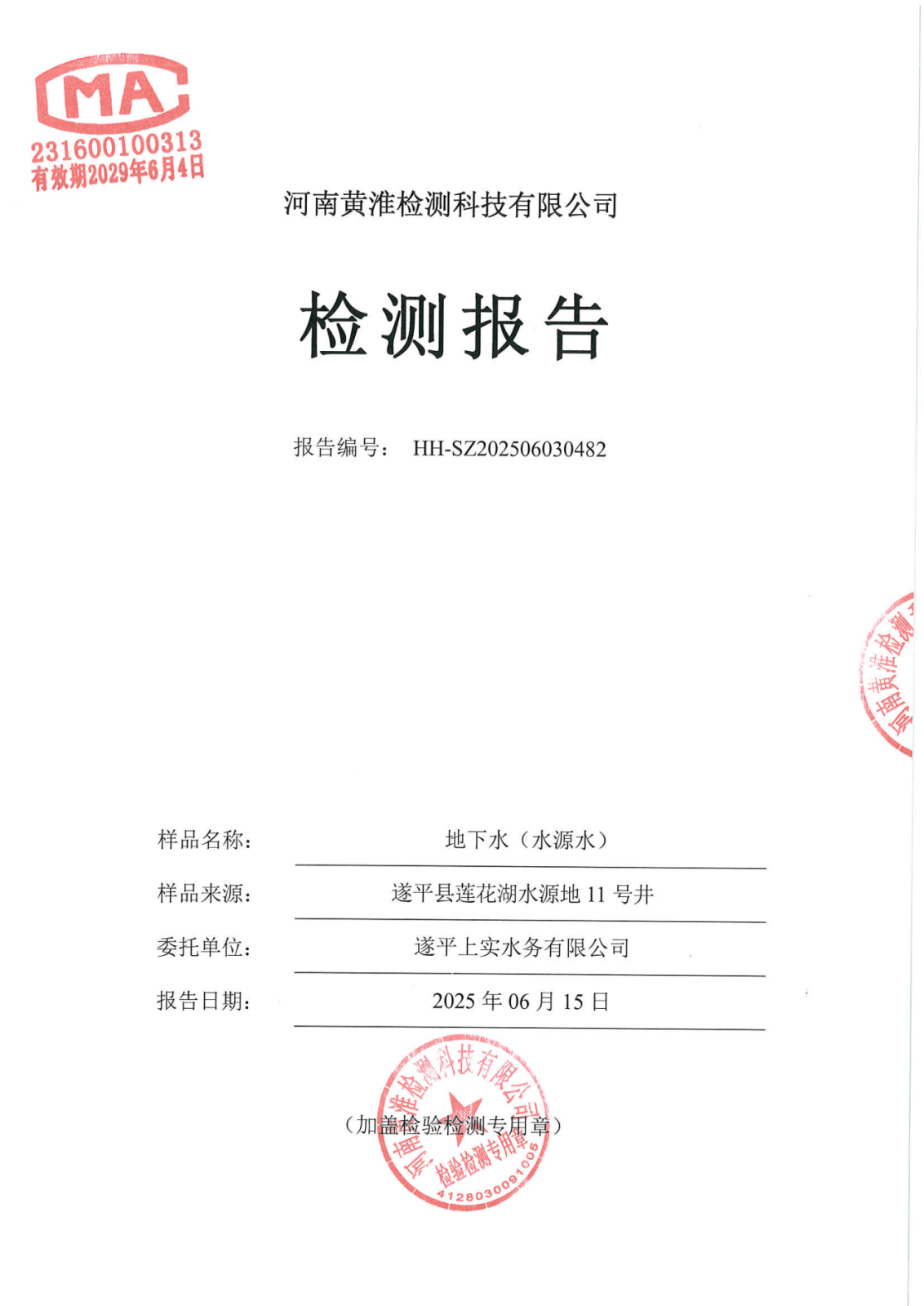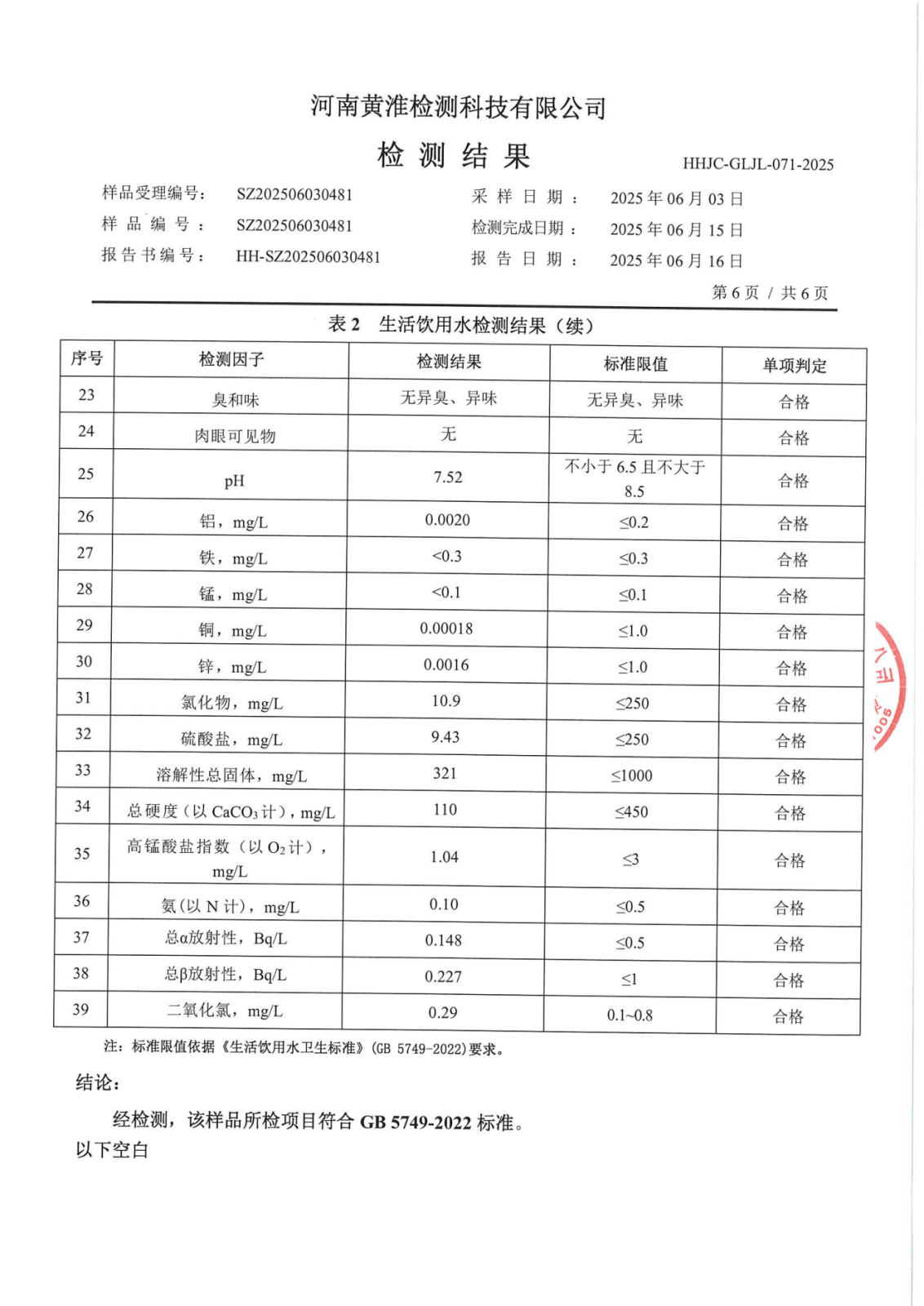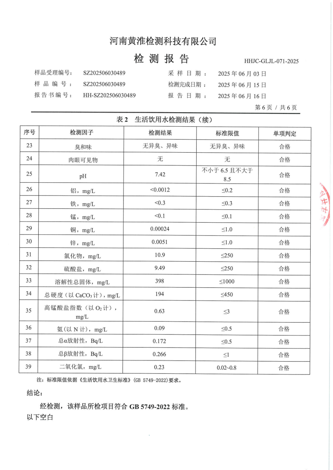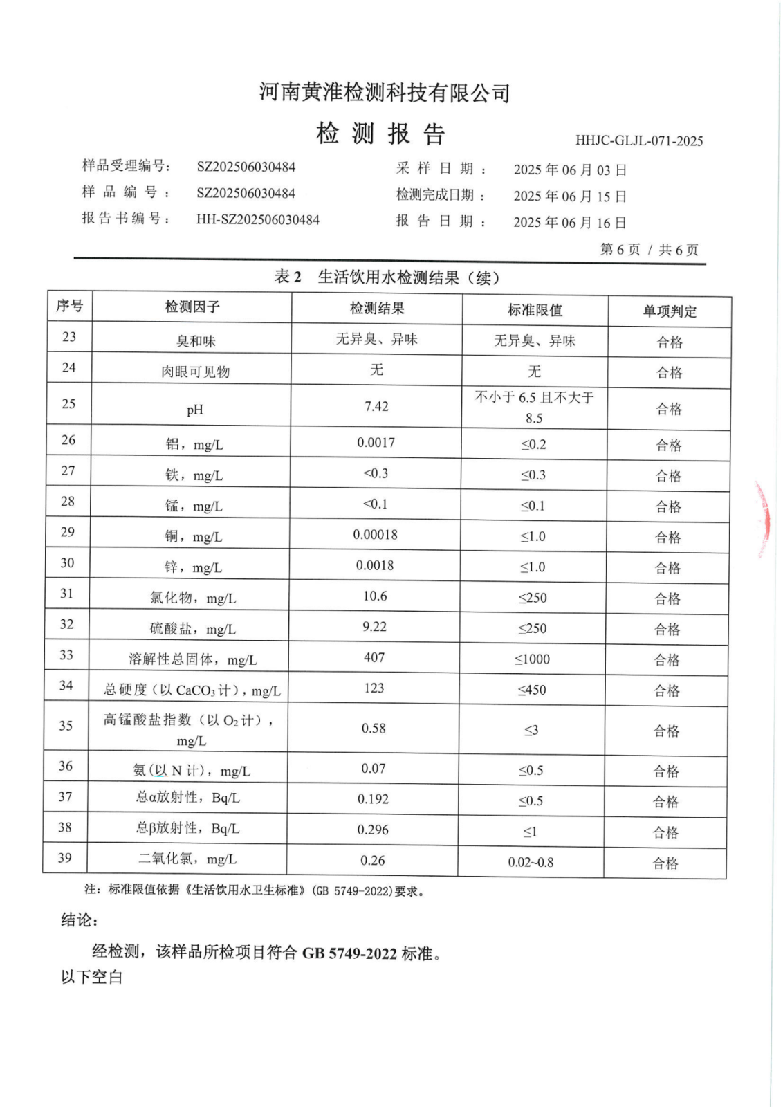 遂平上实水务有限公司2025年一水厂6月份水质检测报告