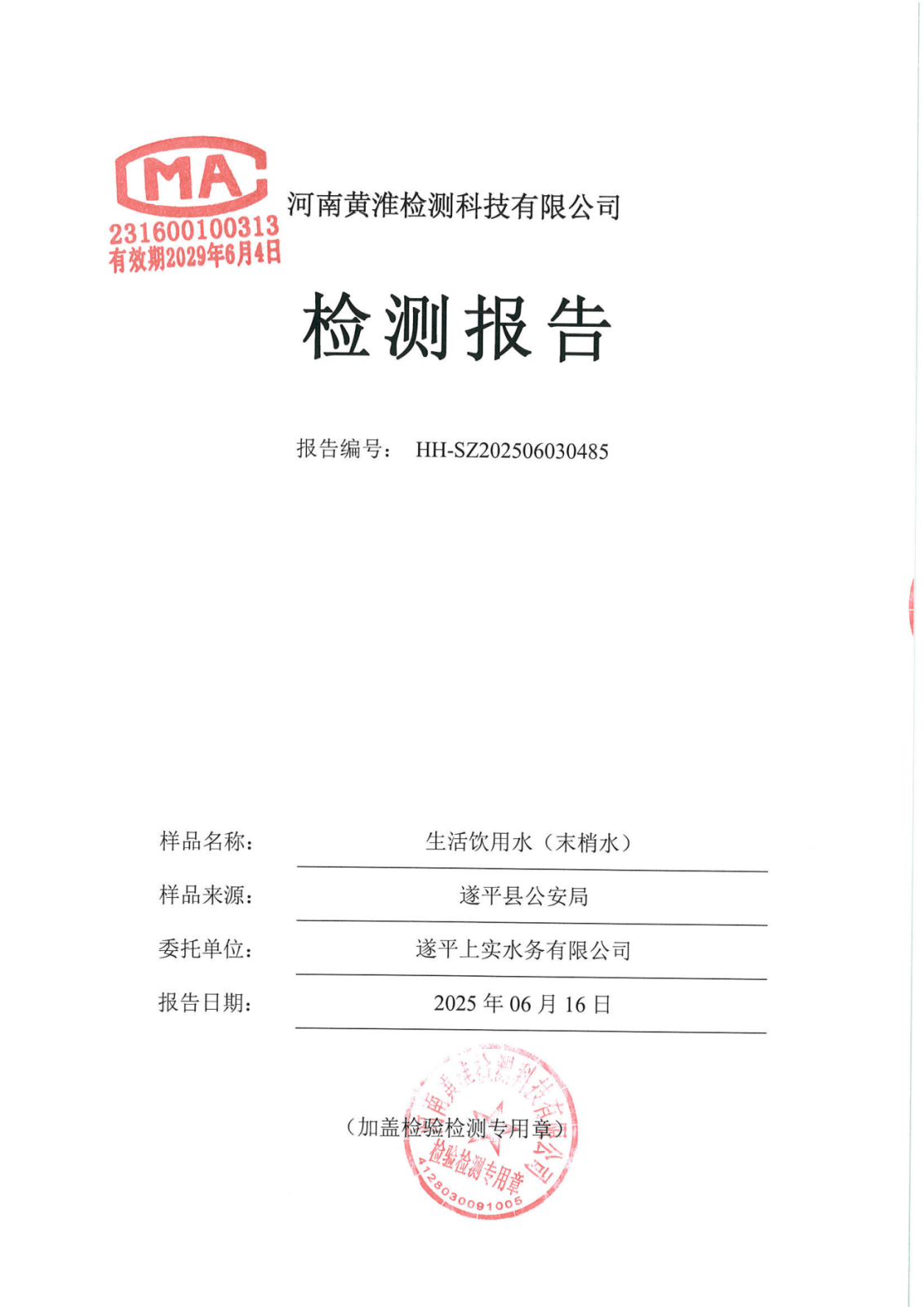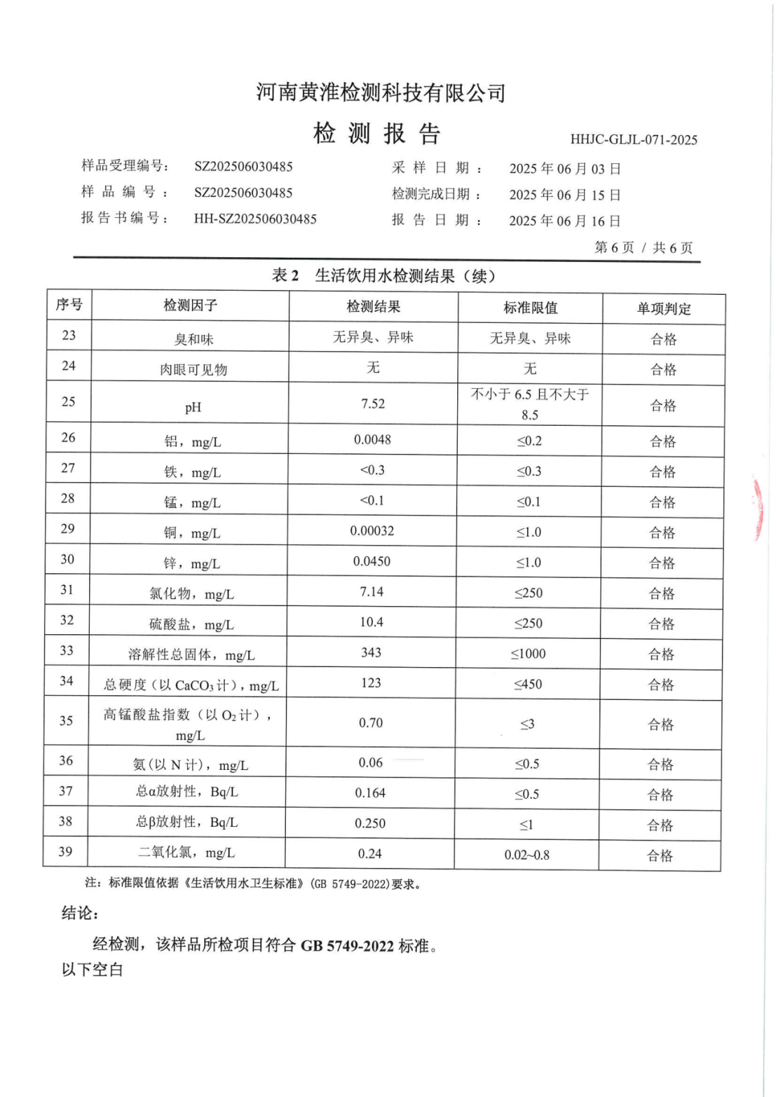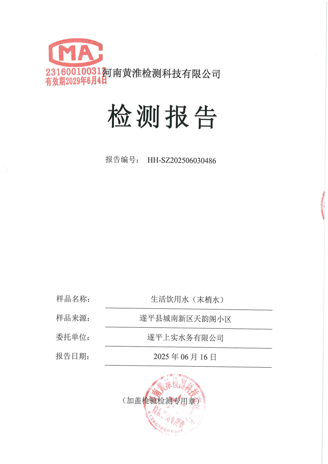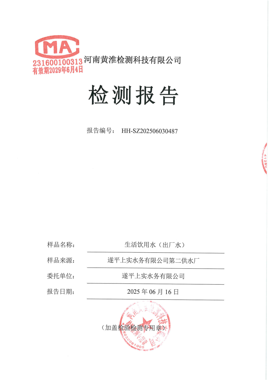 遂平上实水务有限公司2025年二水厂6月份水质检测报告