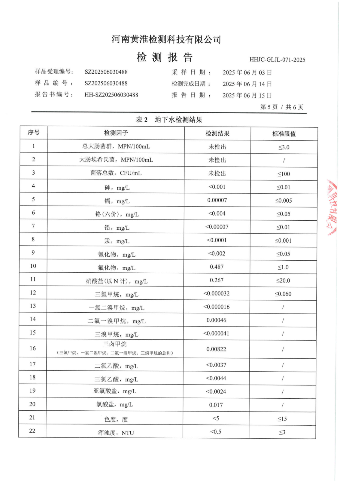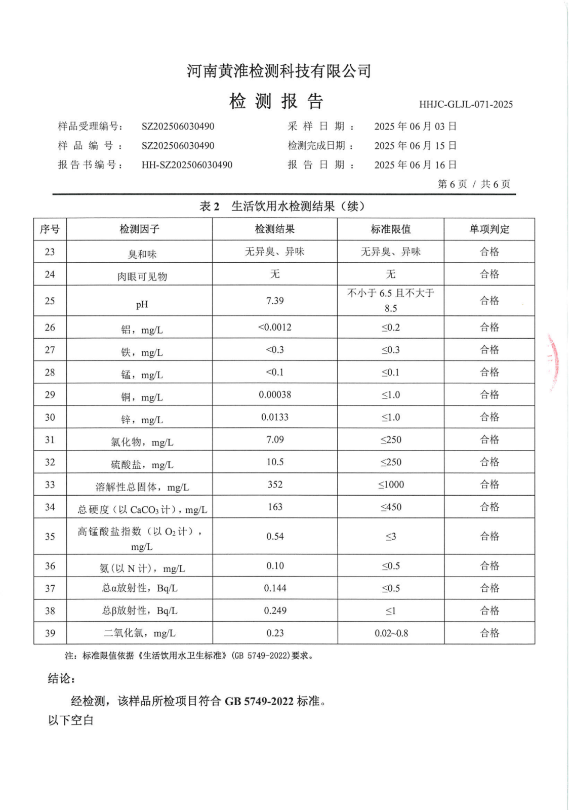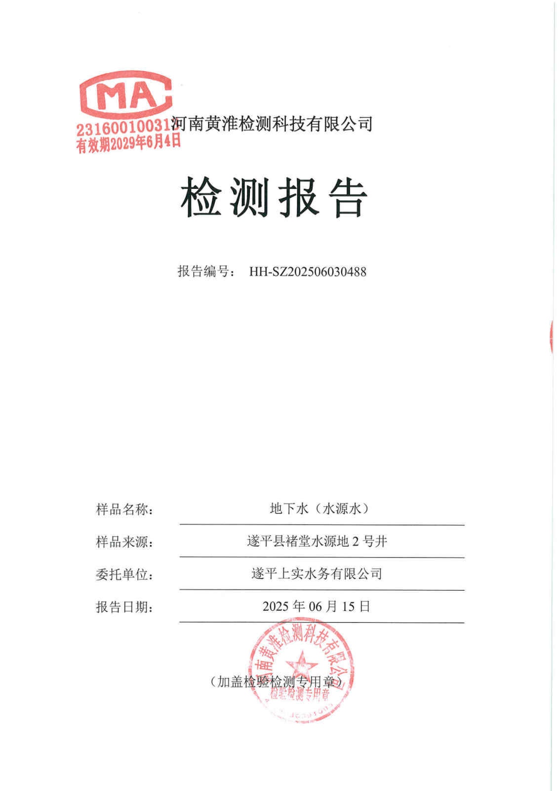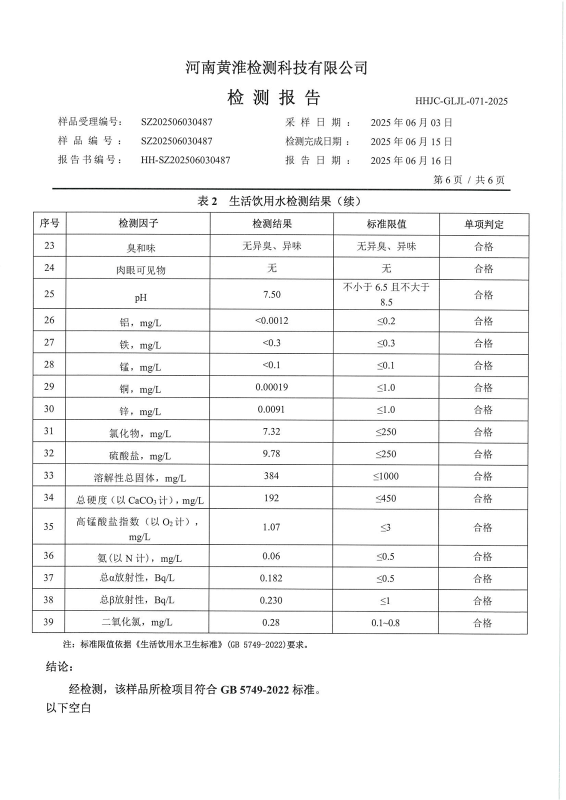 遂平上实水务有限公司2025年二水厂6月份水质检测报告
