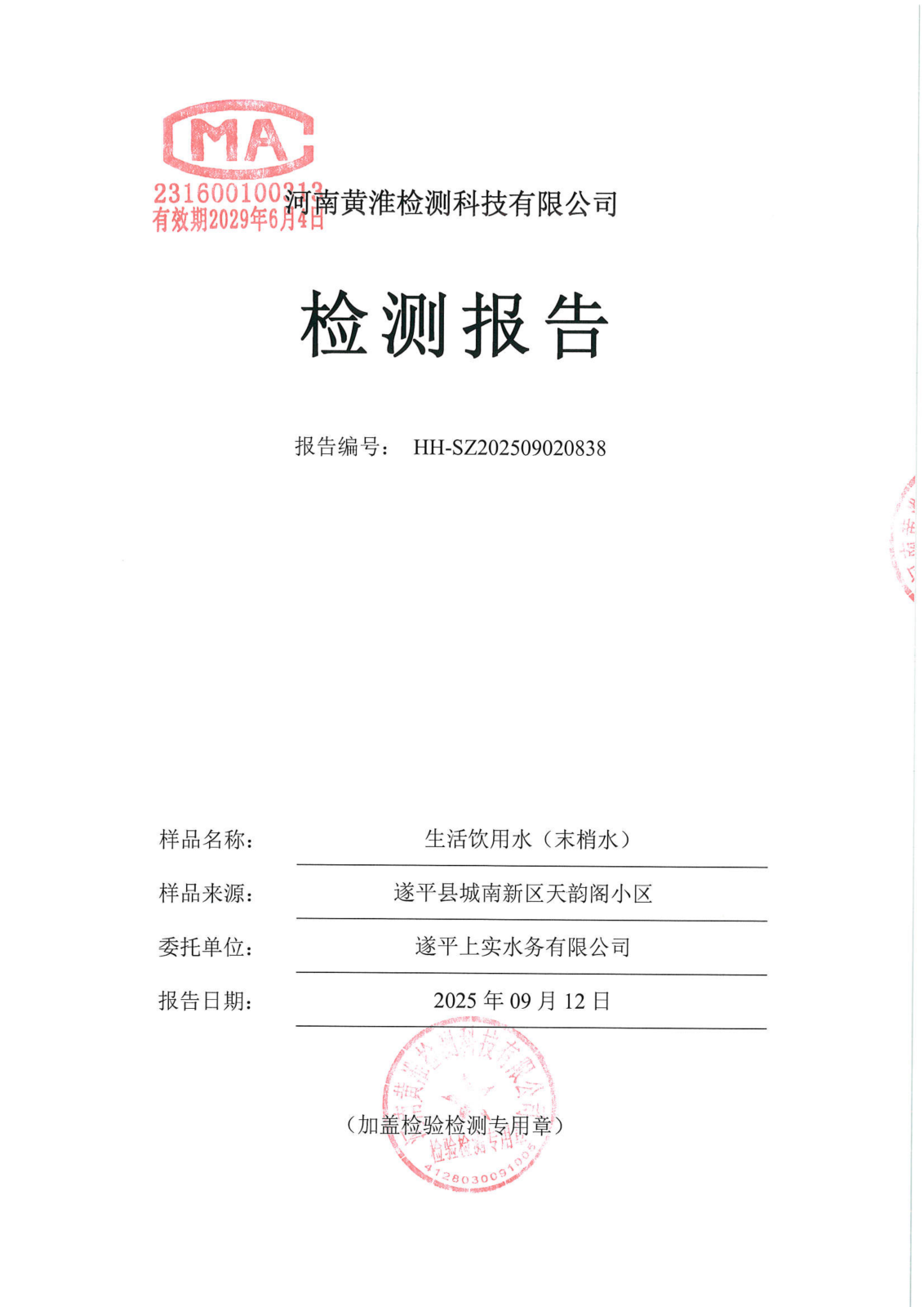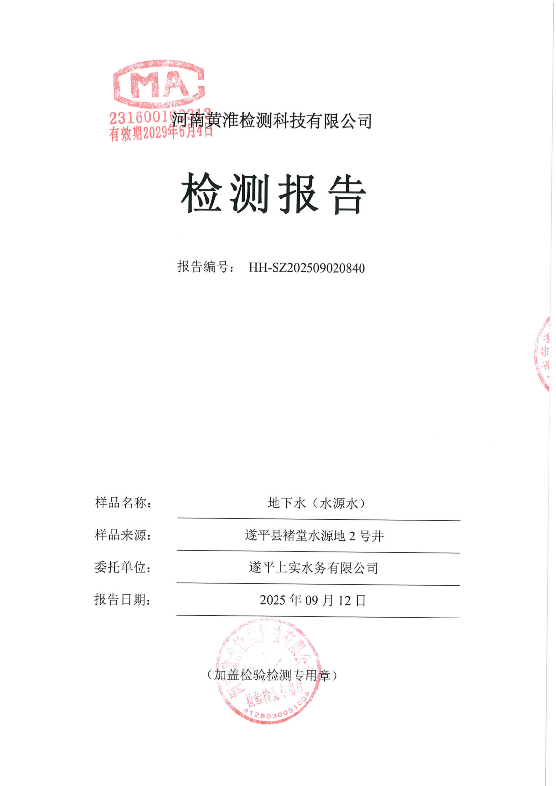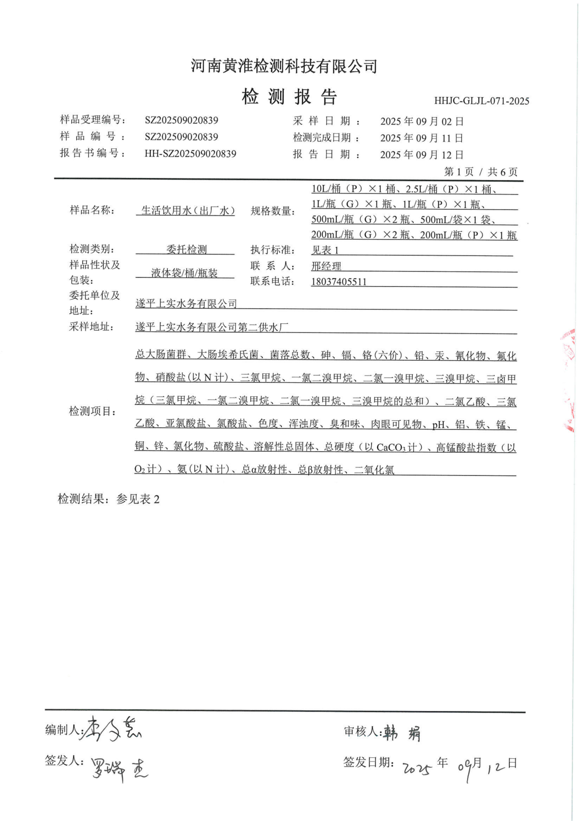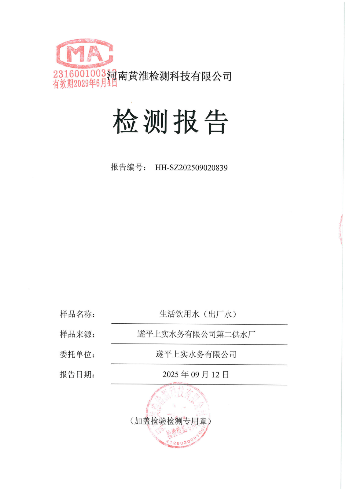 遂平上实水务有限公司2025年二水厂9月份水质检测报告