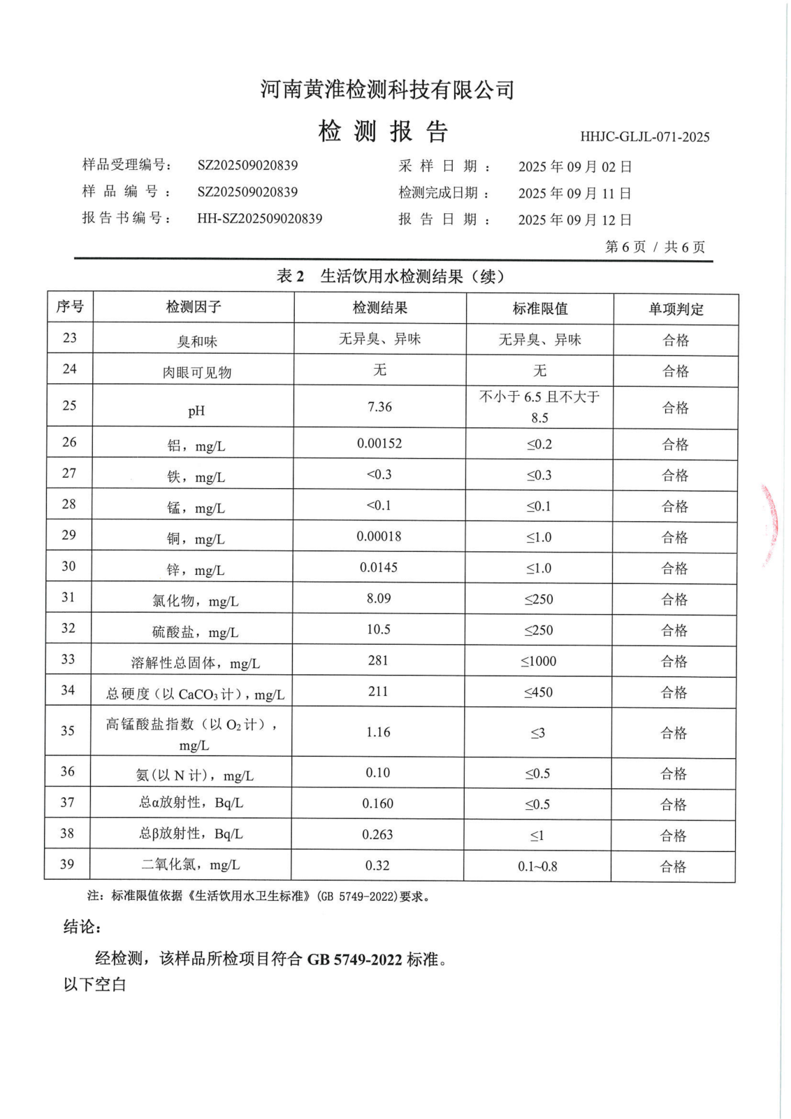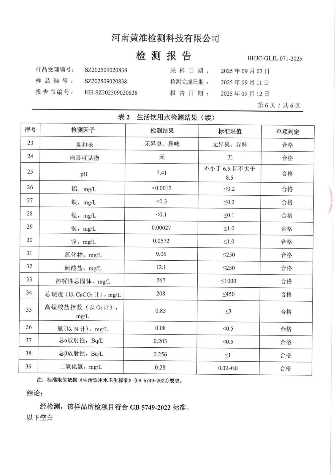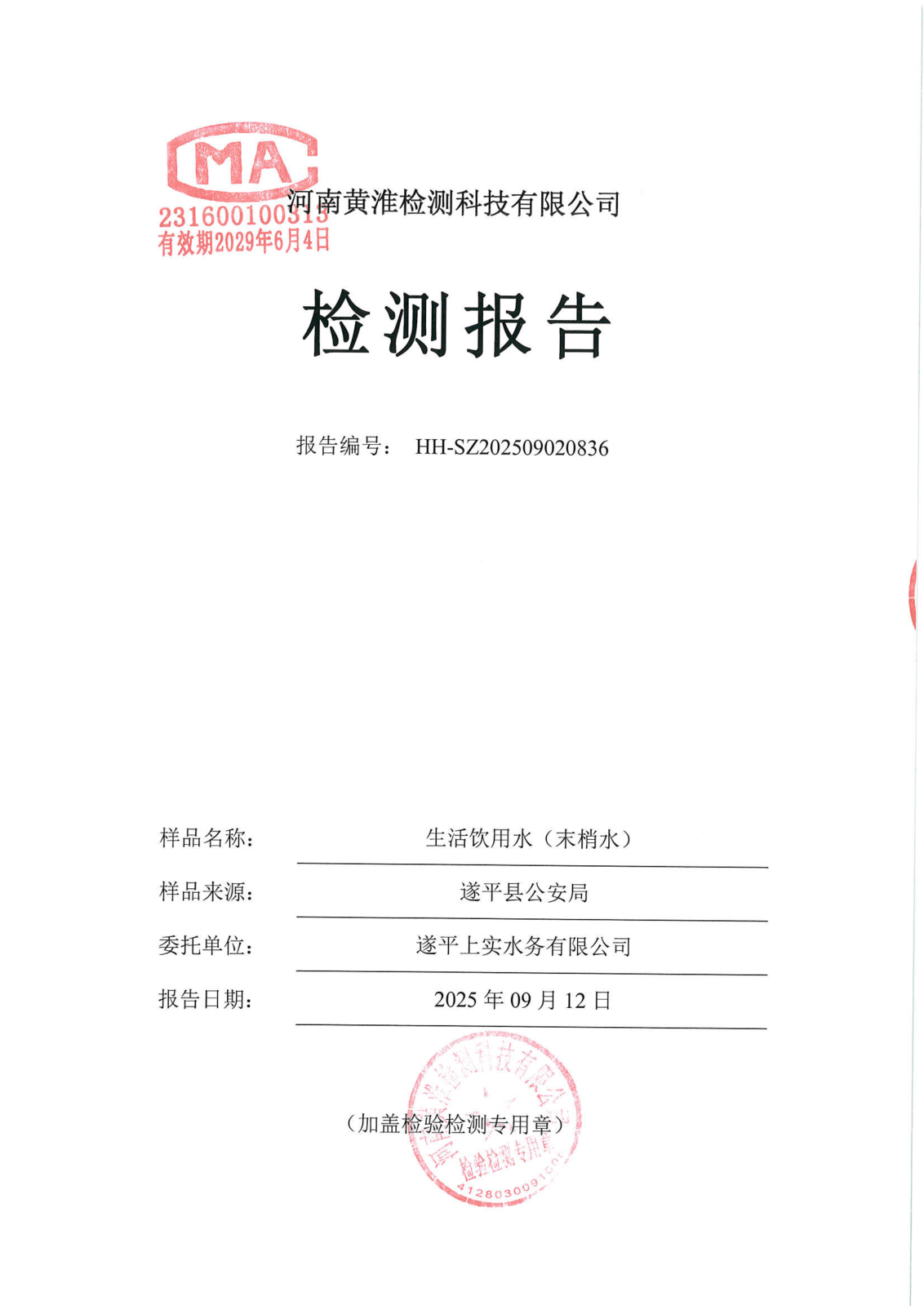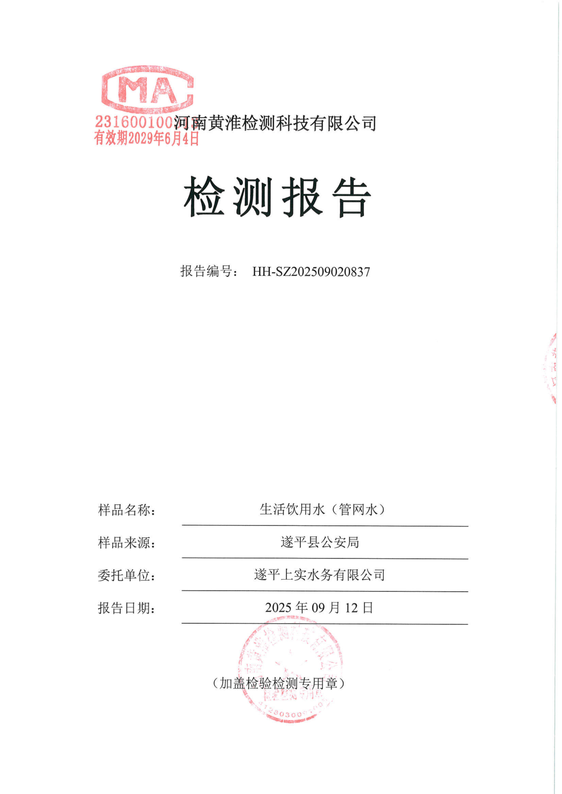遂平上实水务有限公司2025年二水厂9月份水质检测报告