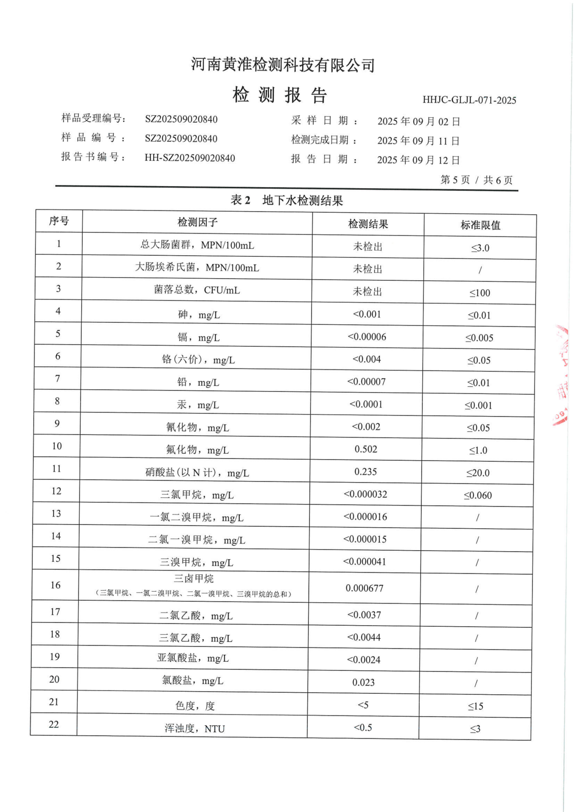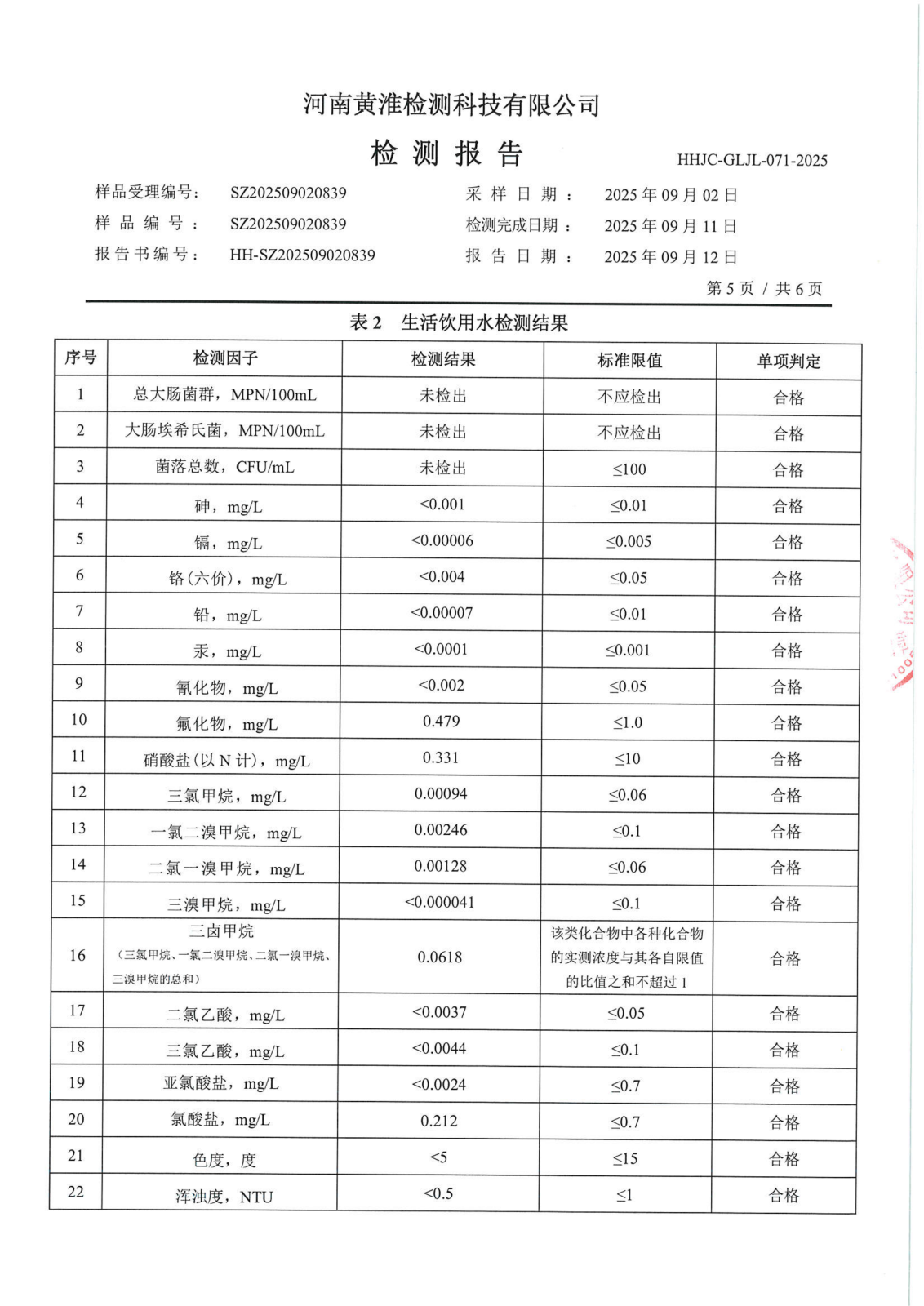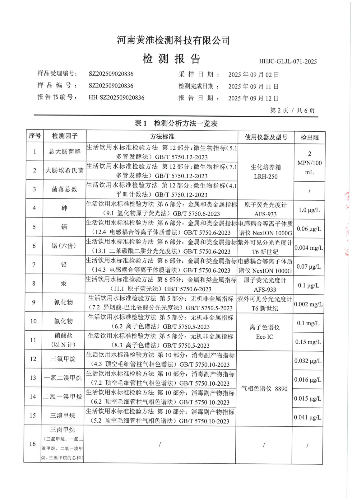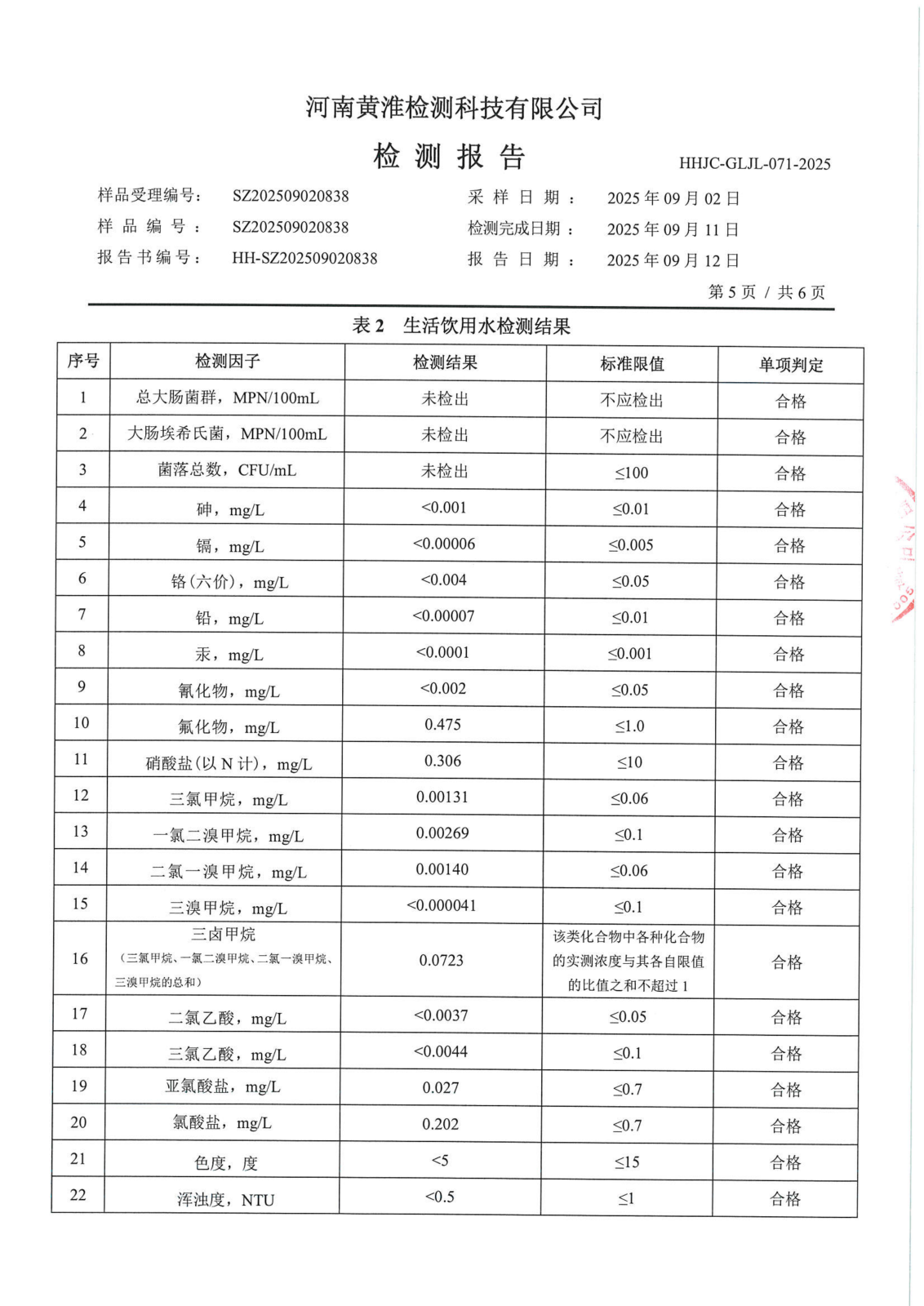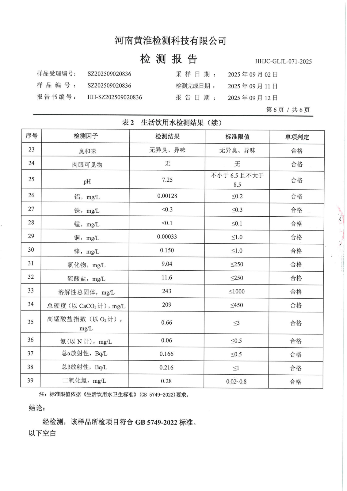 遂平上实水务有限公司2025年二水厂9月份水质检测报告