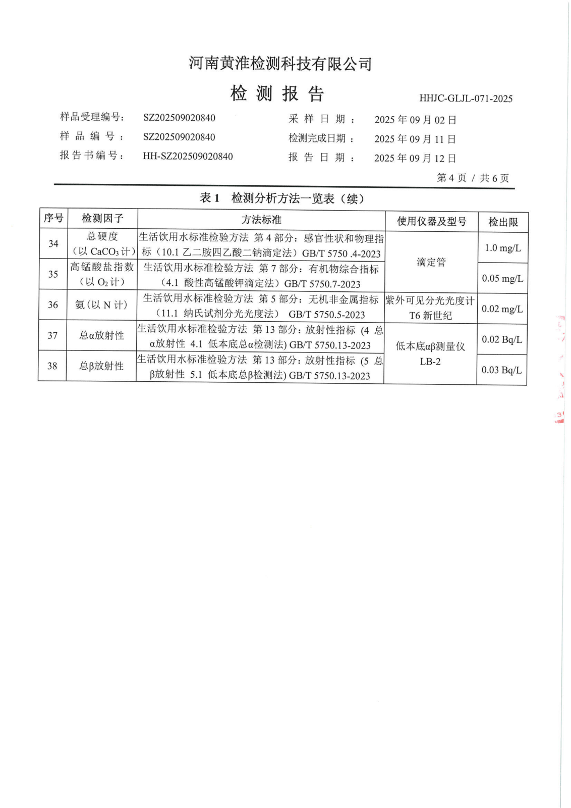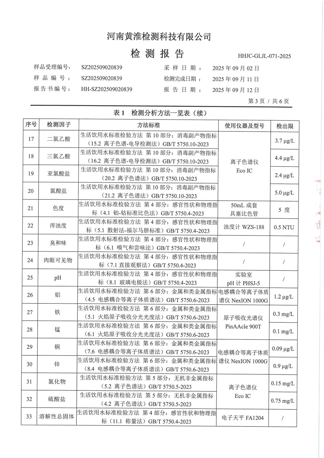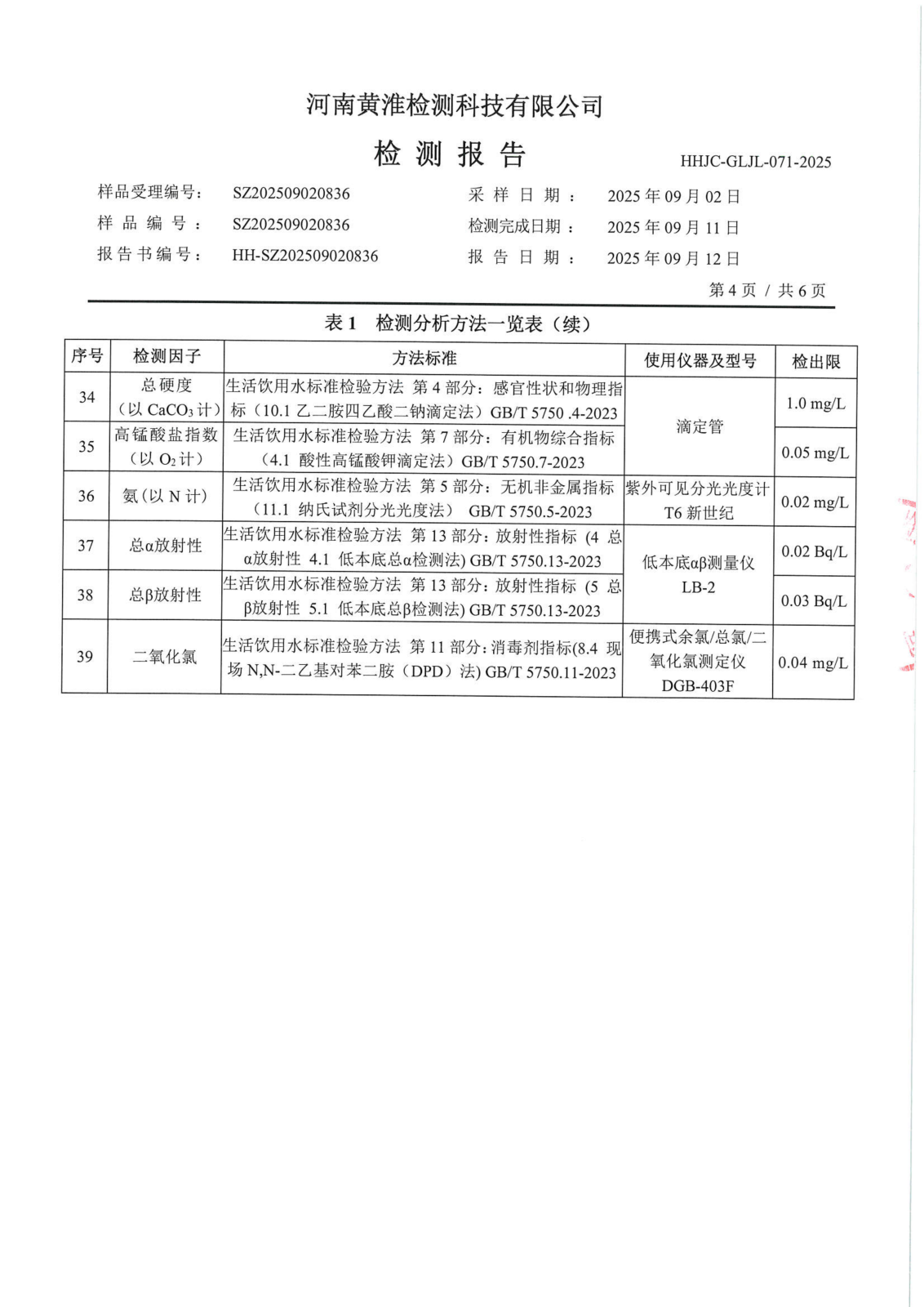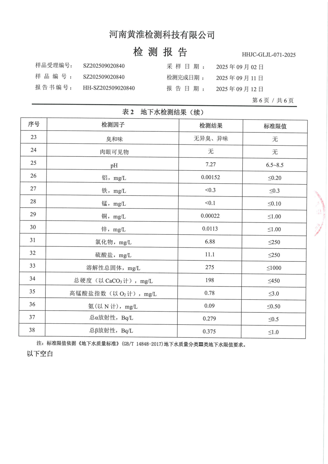 遂平上实水务有限公司2025年二水厂9月份水质检测报告