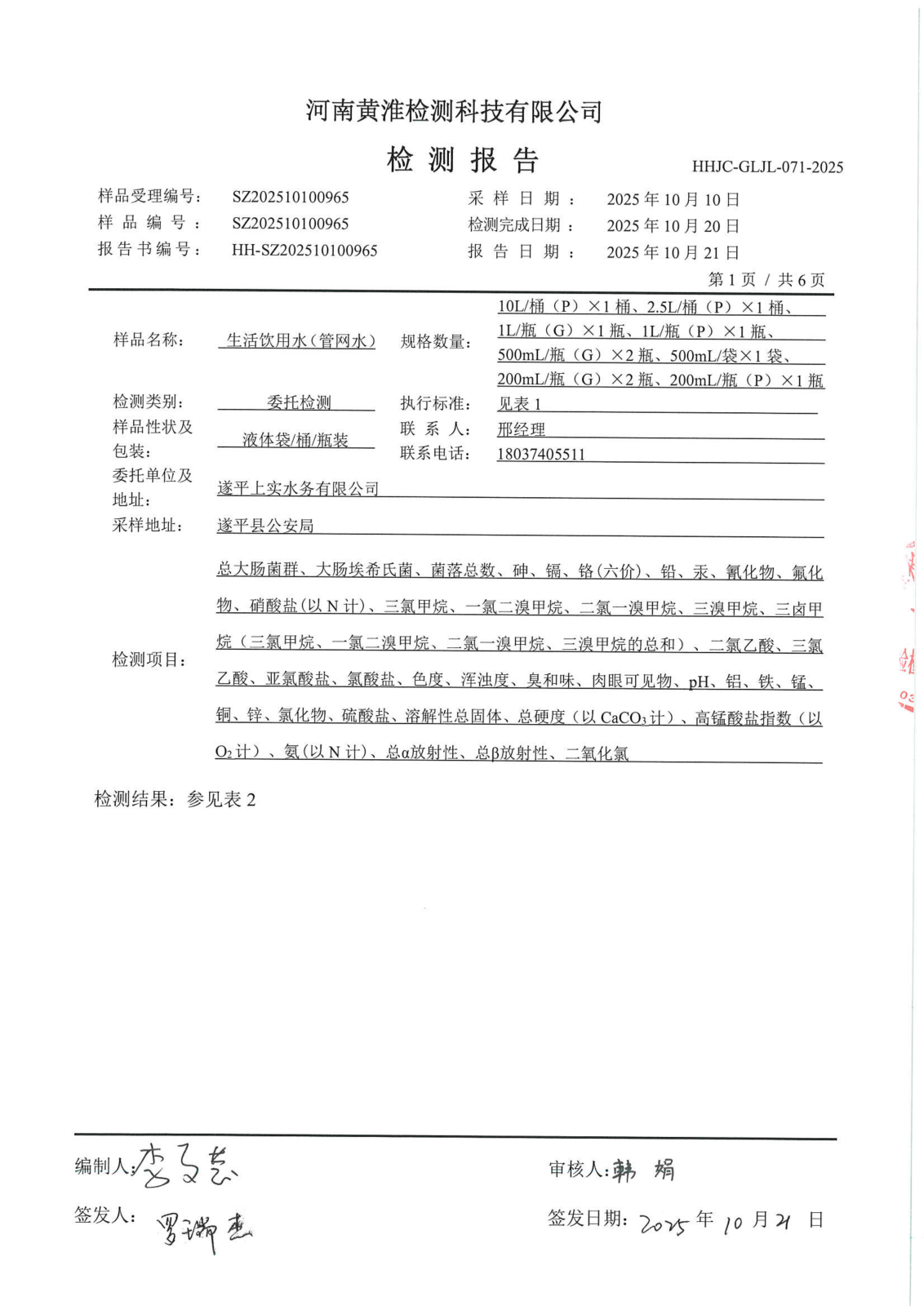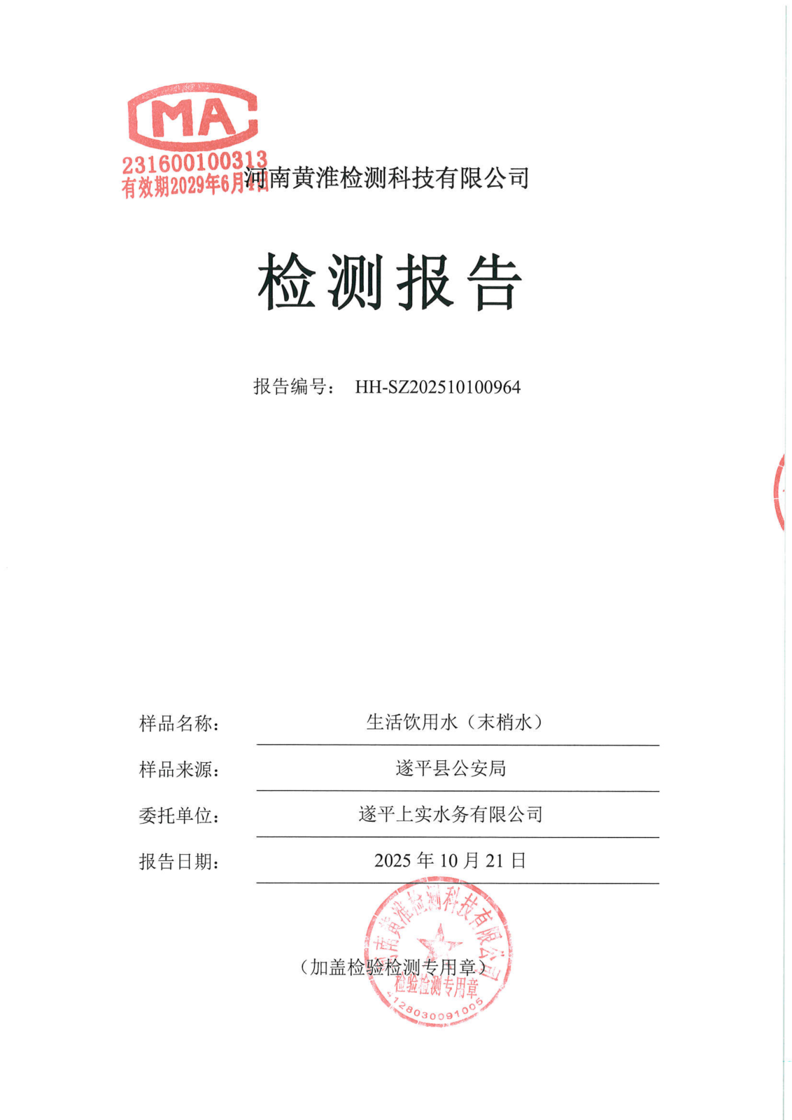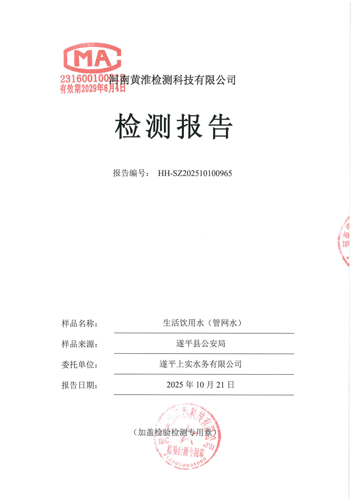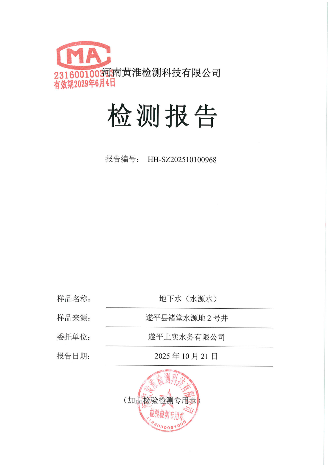 遂平上实水务有限公司2025年二水厂10月份水质检测报告