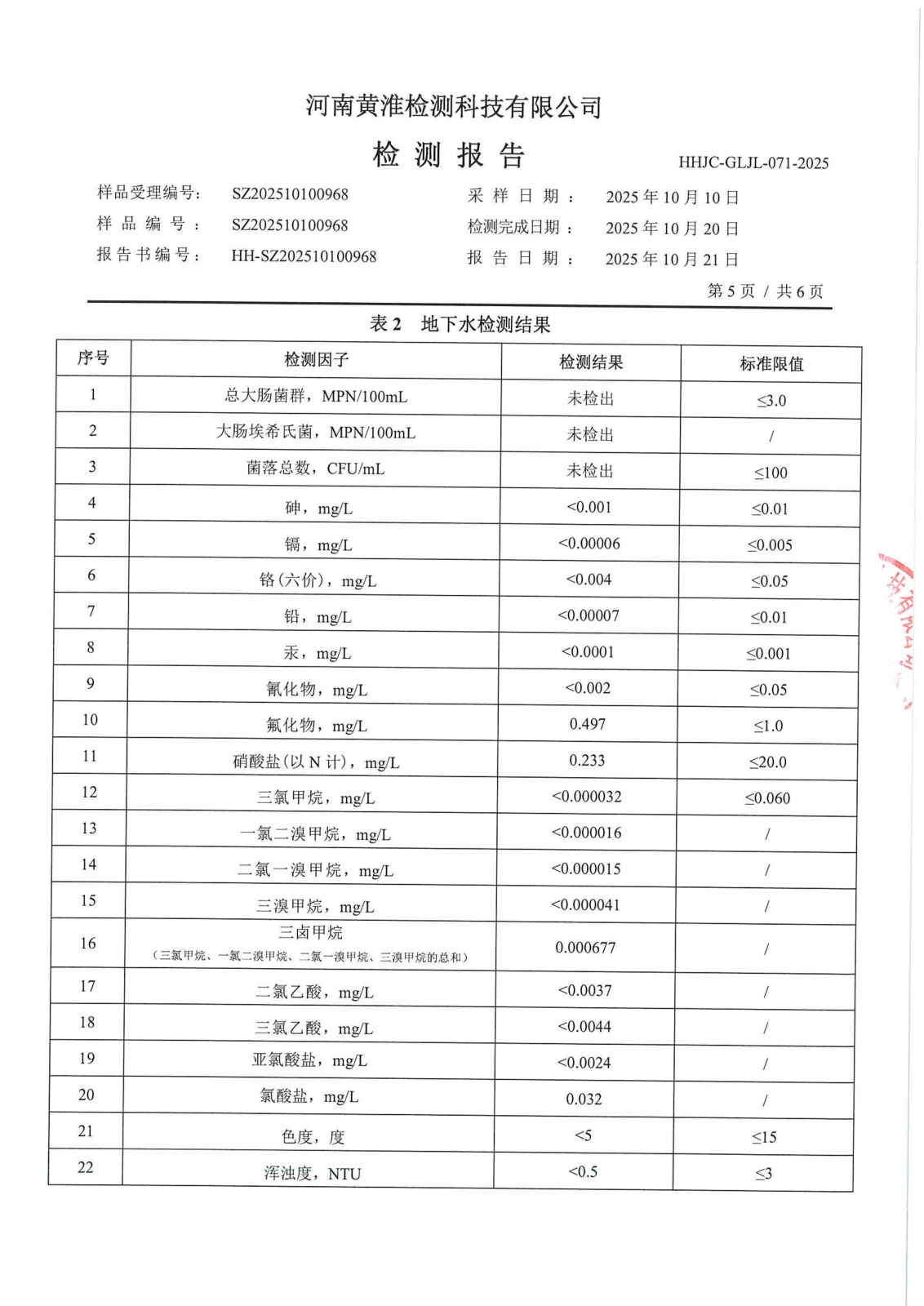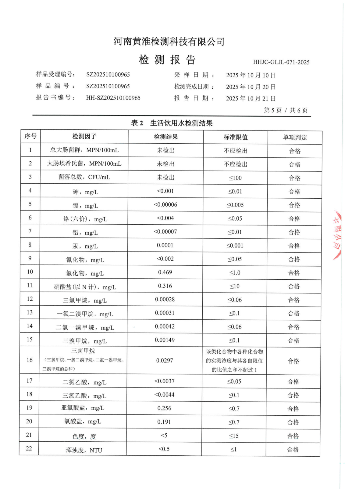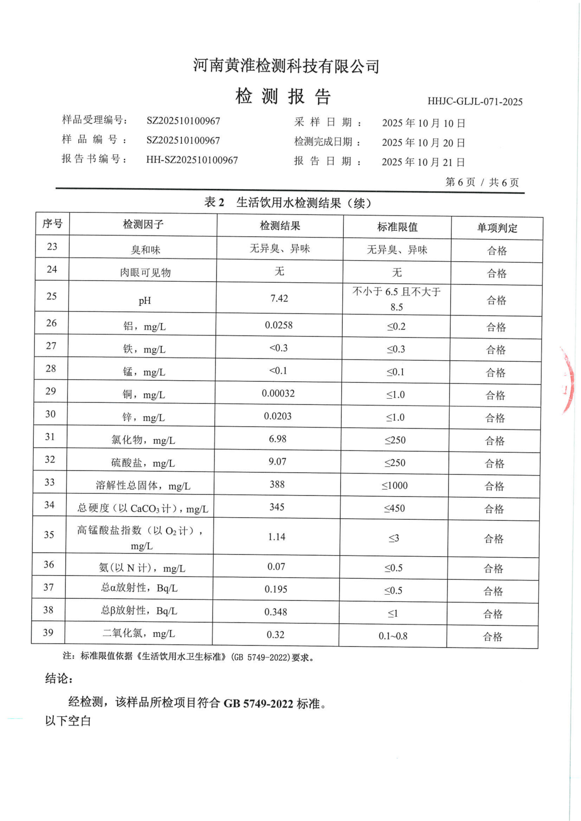 遂平上实水务有限公司2025年二水厂10月份水质检测报告