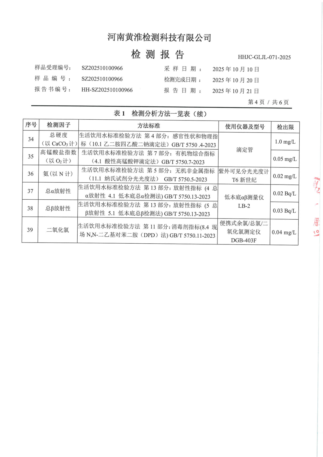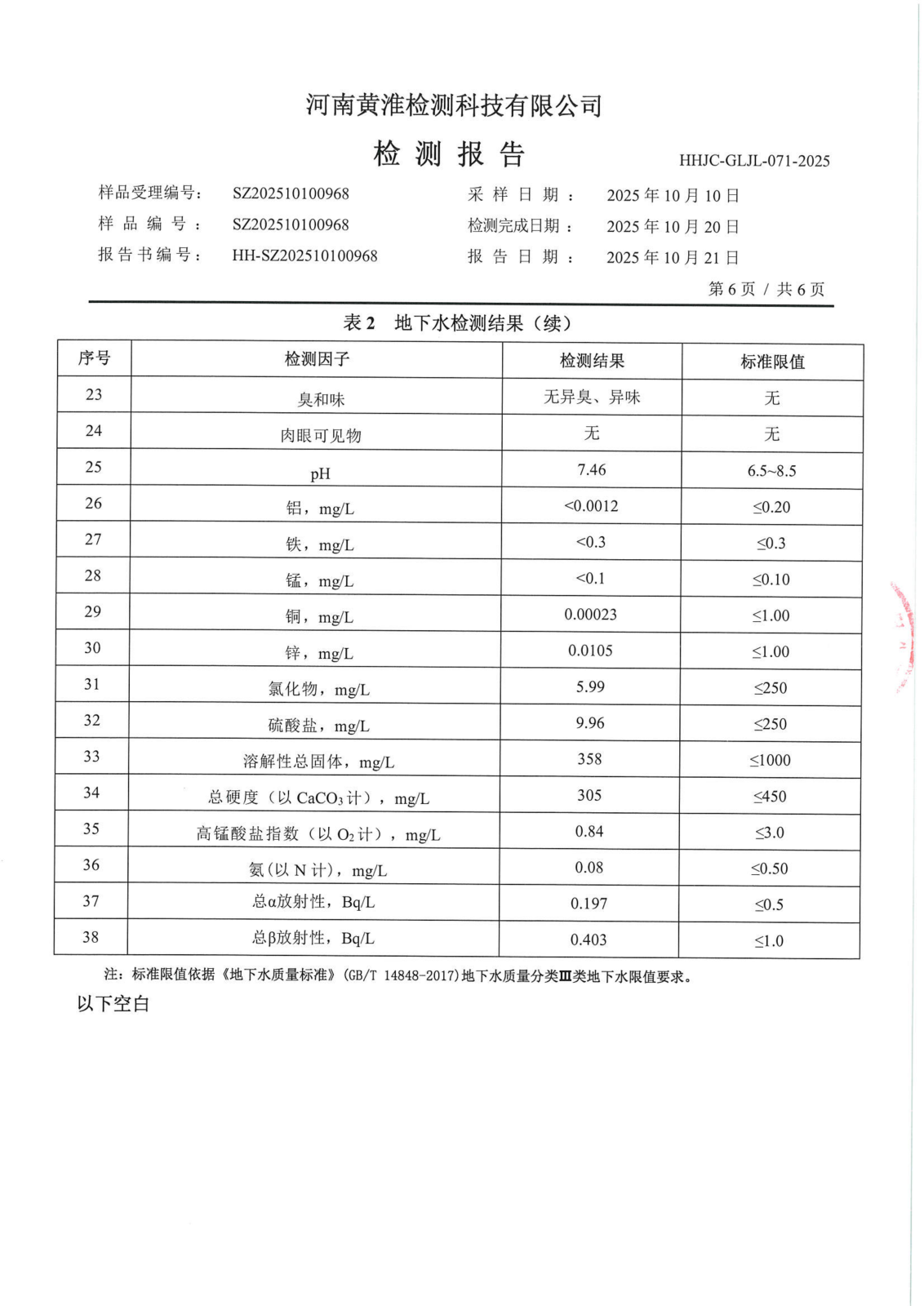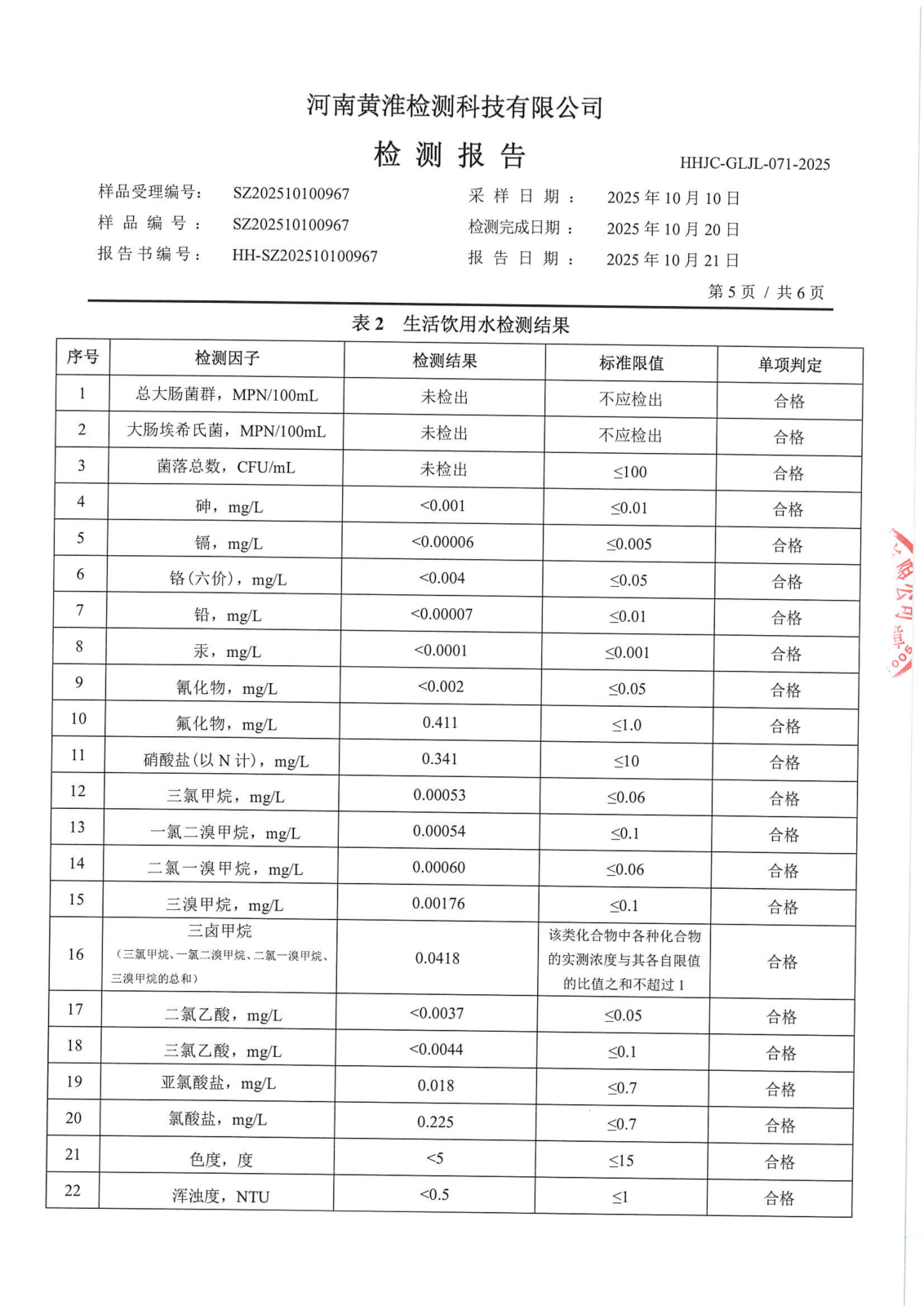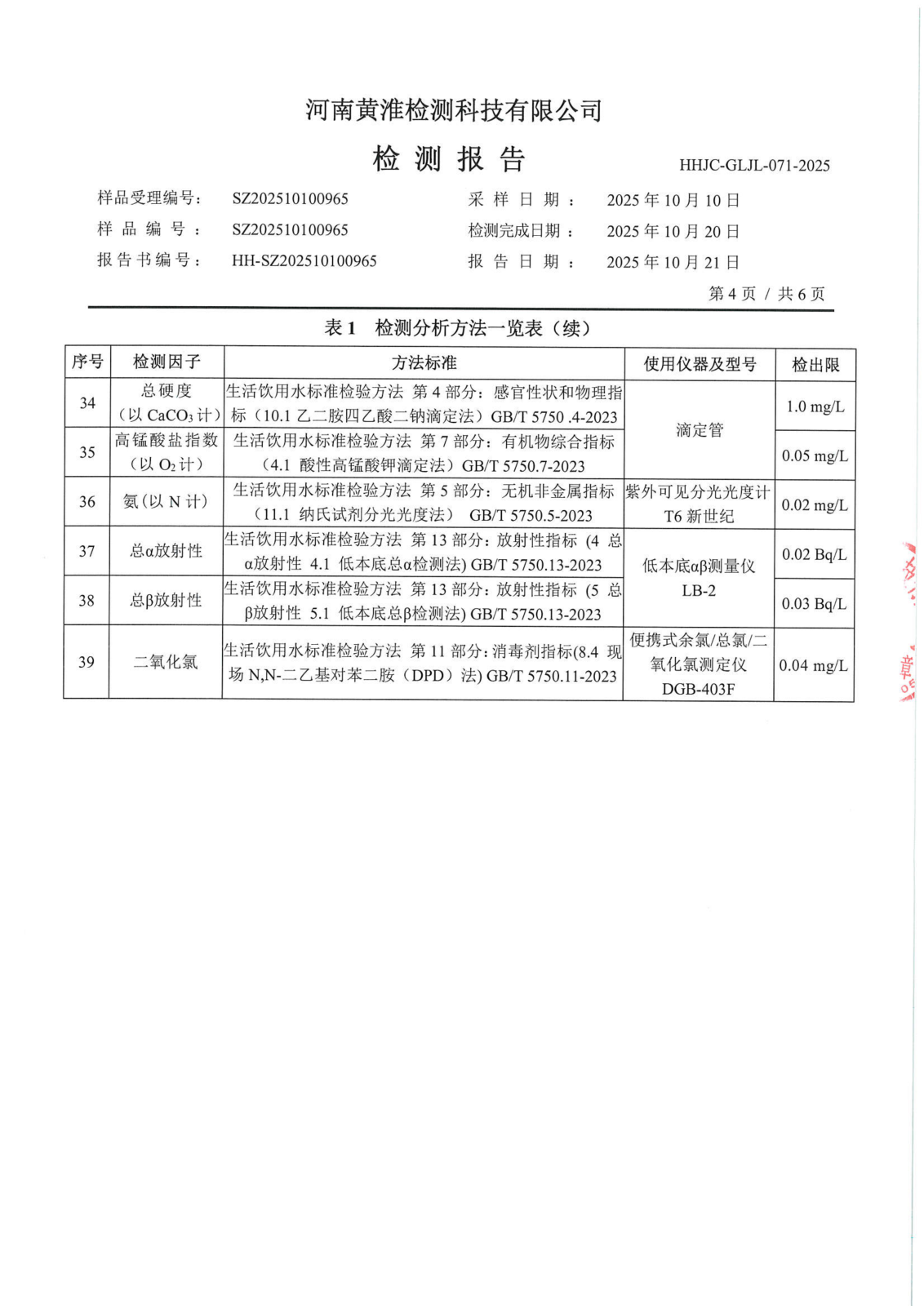 遂平上实水务有限公司2025年二水厂10月份水质检测报告