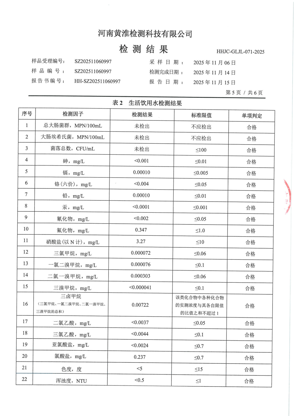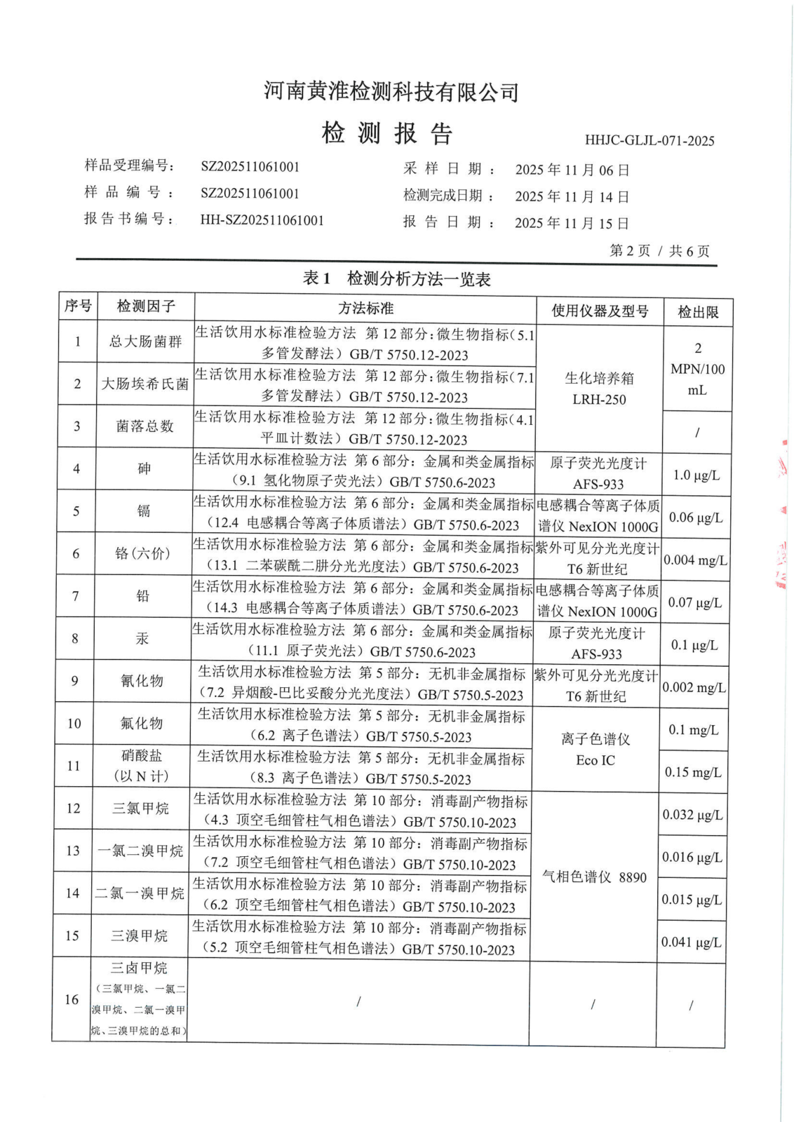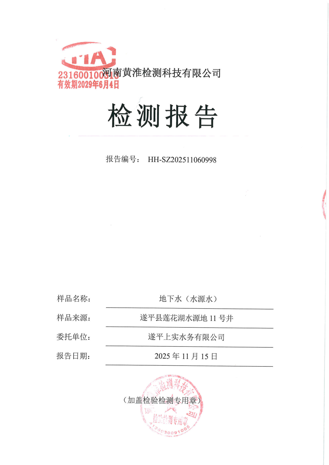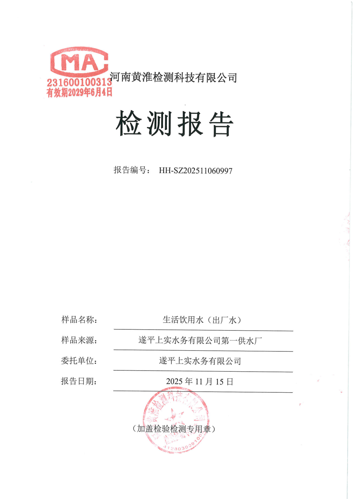 遂平上实水务有限公司2025年一水厂11月份水质检测报告